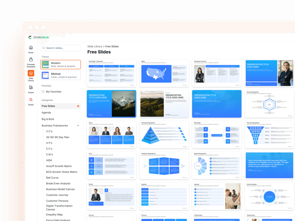 Twodart is a game-changer in how you build presentations. With an extensive library of professional, customizable slide templates, it eliminates the stress of design and the hassle of starting from scratch.