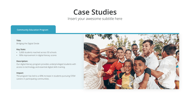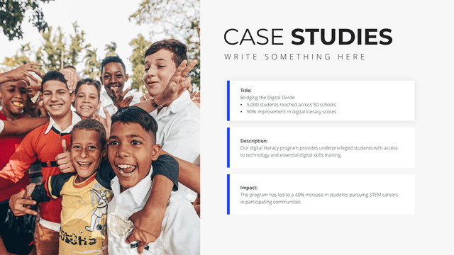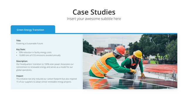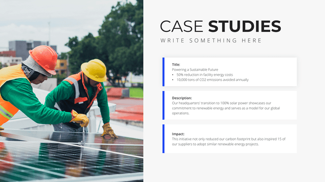 Delve into detailed success narratives with the Case Study slide. Tailored for comprehensive views of challenges, solutions, and outcomes, this slide stands as a testament to capabilities. It’s perfect for showcasing client success stories, project outcomes, or research results, building credibility and trust.