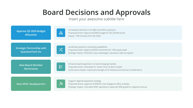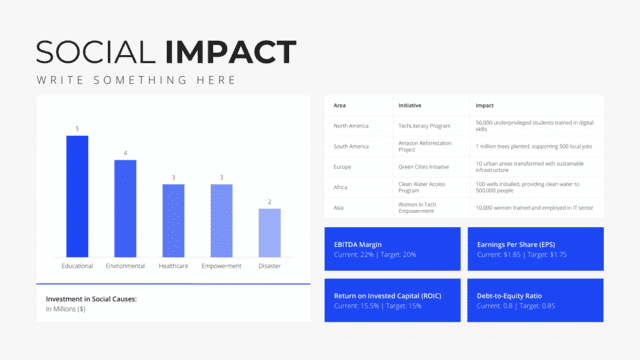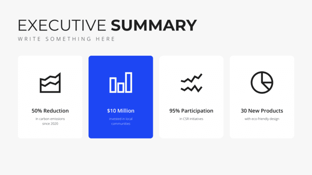 Offer a snapshot of your project or proposal with the Executive Summary slide. Designed to present key points, objectives, and outcomes in a concise manner, it sets the stage for deeper dives into specific areas. It’s essential for capturing attention and providing a quick overview of the topic at hand.