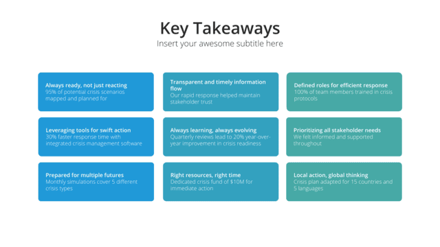 Summarize essential insights with the Key Takeaways slide. Ensuring audiences remember pivotal points, it reinforces main messages and ensures clarity on outcomes.