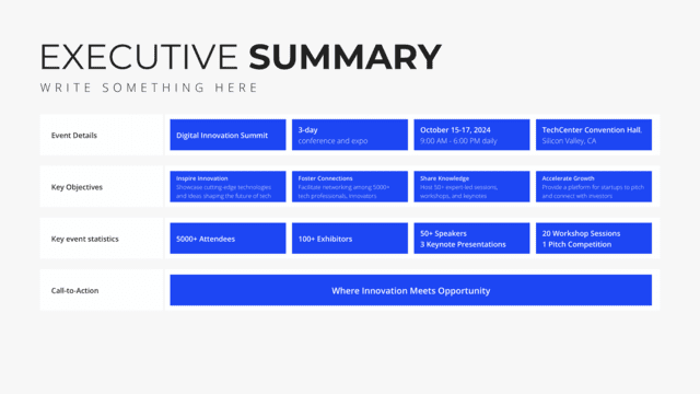 Offer a snapshot of your project or proposal with the Executive Summary slide. Designed to present key points, objectives, and outcomes in a concise manner, it sets the stage for deeper dives into specific areas. It’s essential for capturing attention and providing a quick overview of the topic at hand.
