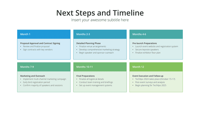Elevate your event planning pitch with our strategically designed Event Proposal Presentation Template. Crafted for impact and persuasion, this template offers a comprehensive framework to highlight your event concept, logistics, budget considerations, and expected outcomes. Each slide is purposefully structured to showcase the value and feasibility of your proposed event, ensuring your vision resonates with clients, sponsors, or stakeholders and increases the likelihood of approval and support.