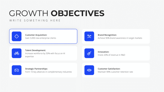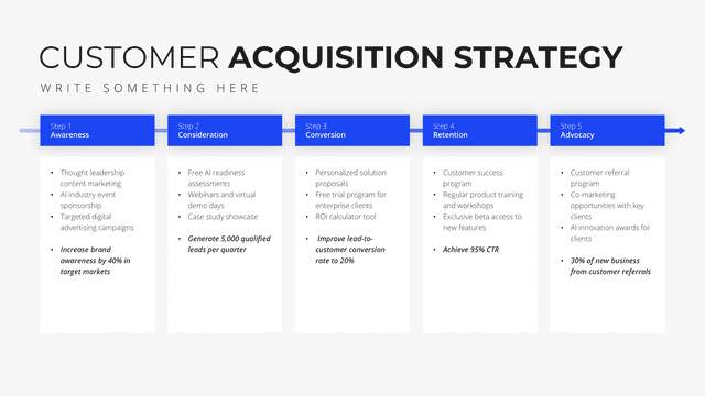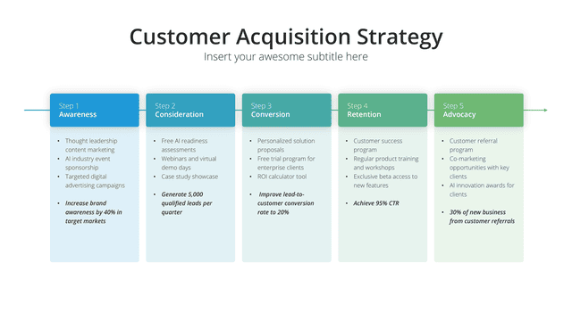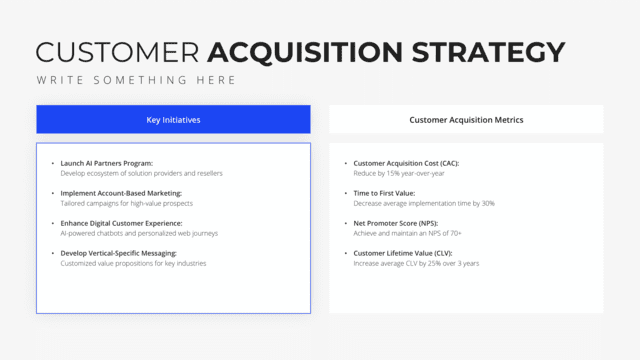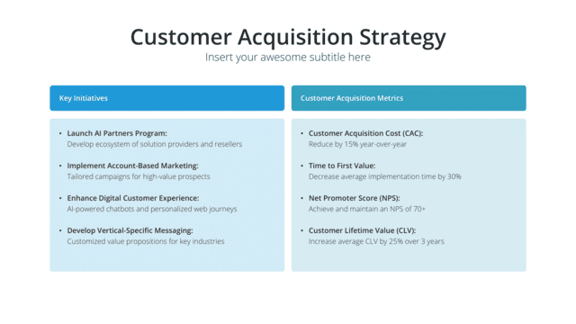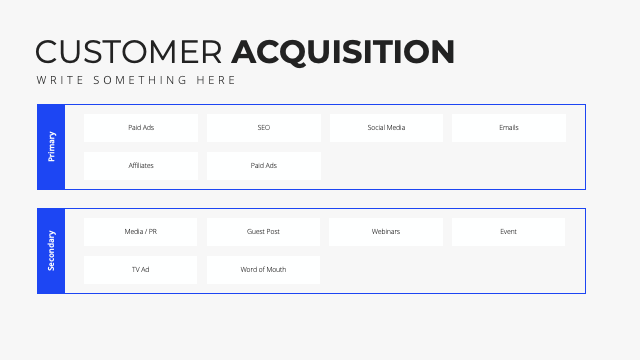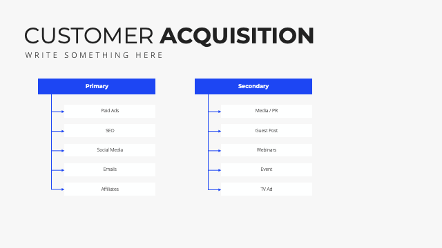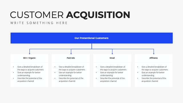 Detail your customer growth strategy with the Customer Acquisition slide. Focused on showcasing tactics and channels used to gain new clients, it provides a clear view of marketing and sales efforts. By highlighting acquisition metrics and strategies, it provides insights into market reach and brand appeal.