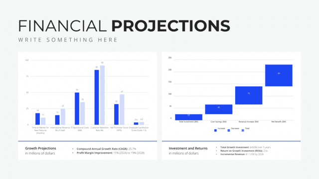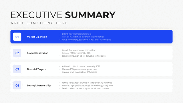 Offer a snapshot of your project or proposal with the Executive Summary slide. Designed to present key points, objectives, and outcomes in a concise manner, it sets the stage for deeper dives into specific areas. It’s essential for capturing attention and providing a quick overview of the topic at hand.