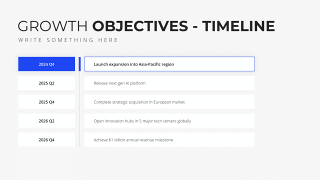 Chart out your organization’s significant moments with the Timeline slide. Designed to visually represent important milestones, achievements, and future plans, this slide provides a clear roadmap of your journey. It offers context, clarity, and a sense of progression, ensuring the audience understands and appreciates your growth trajectory.