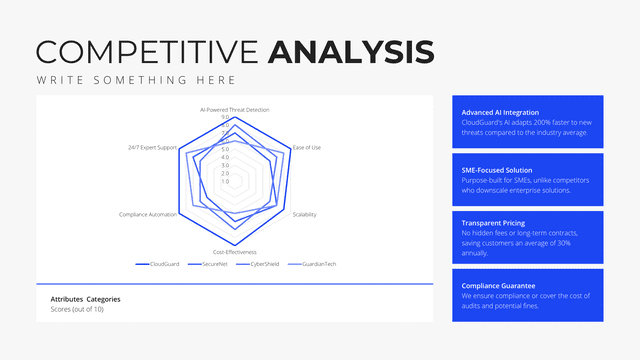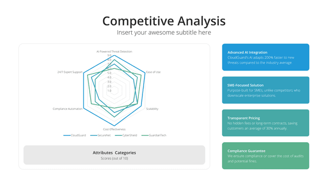 Gain insights into your market stance with the Competition Analysis slide. Tailored for a comprehensive view of competitors and market trends, this slide deciphers strengths, weaknesses, opportunities, and threats. By understanding the competition, businesses can strategize more effectively, carving out unique positions in the market.