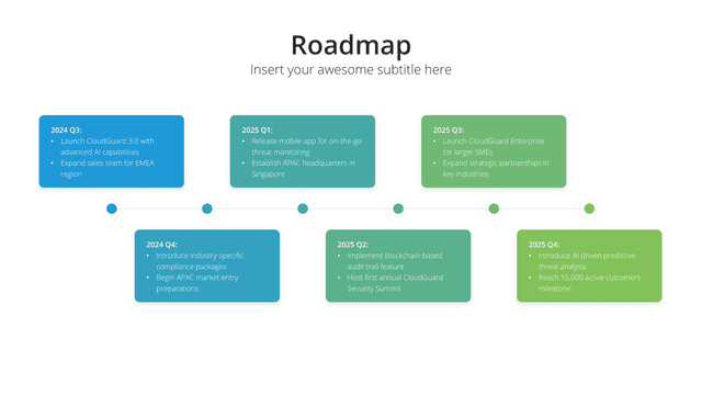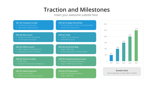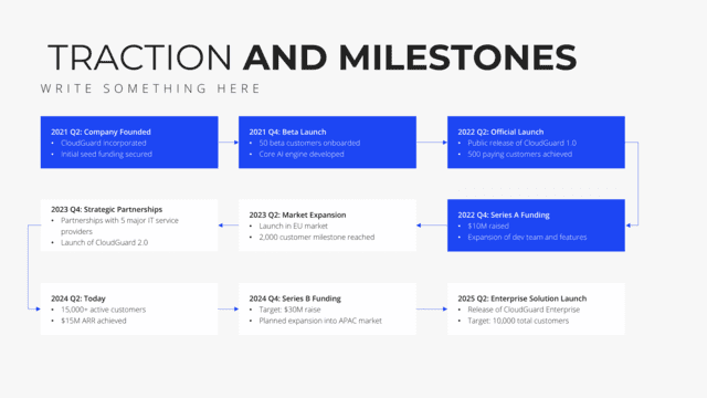 Chart out your organization’s significant moments with the Timeline slide. Designed to visually represent important milestones, achievements, and future plans, this slide provides a clear roadmap of your journey. It offers context, clarity, and a sense of progression, ensuring the audience understands and appreciates your growth trajectory.