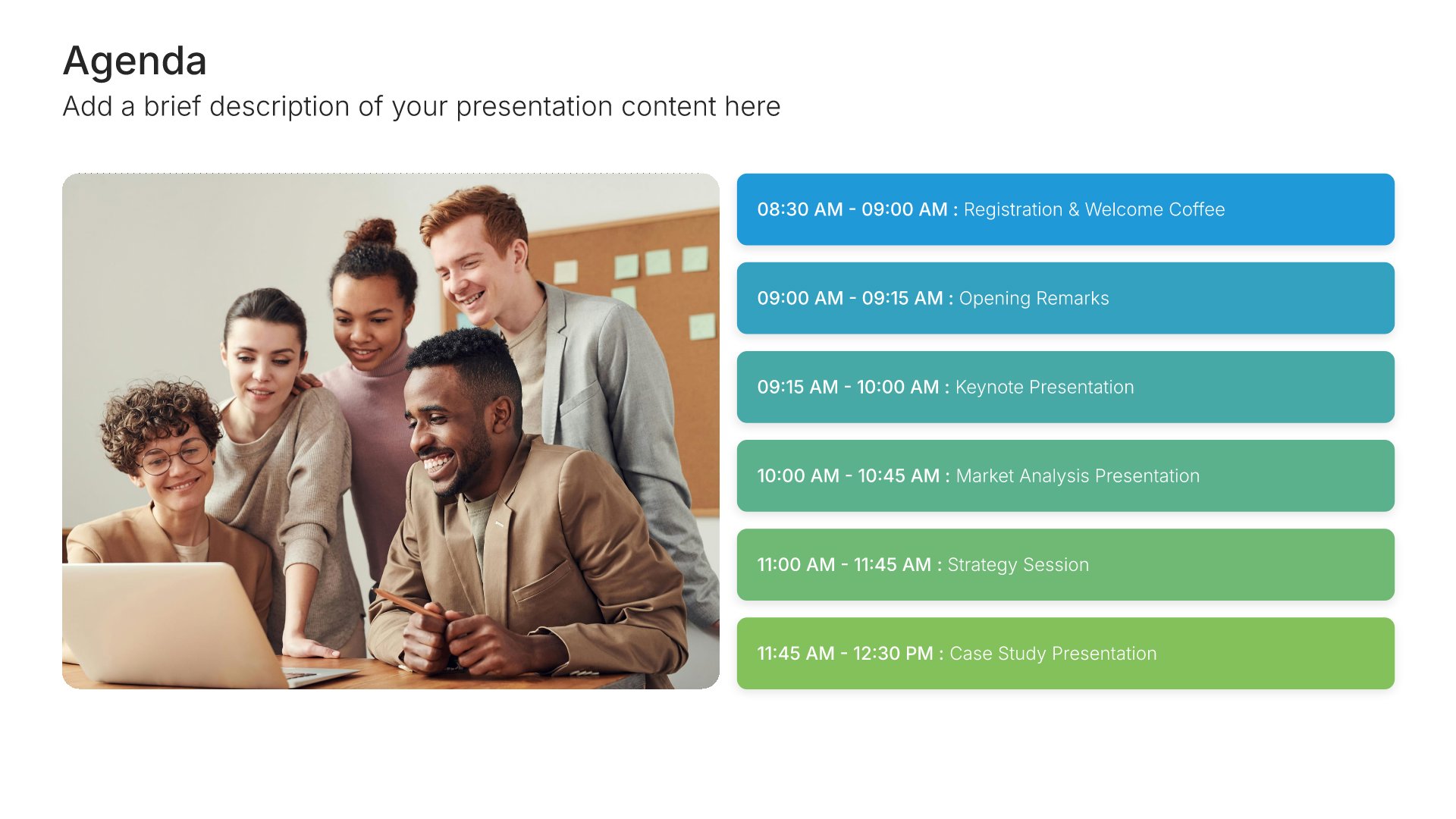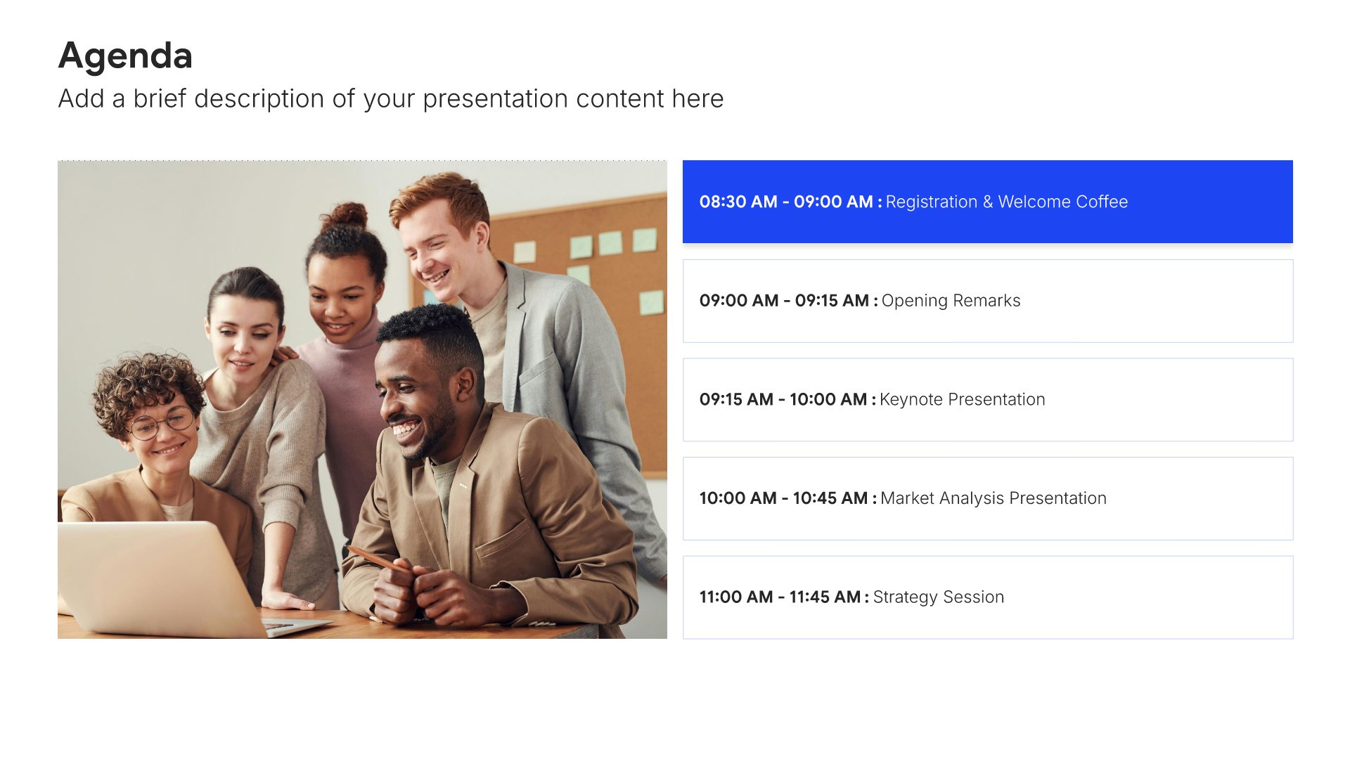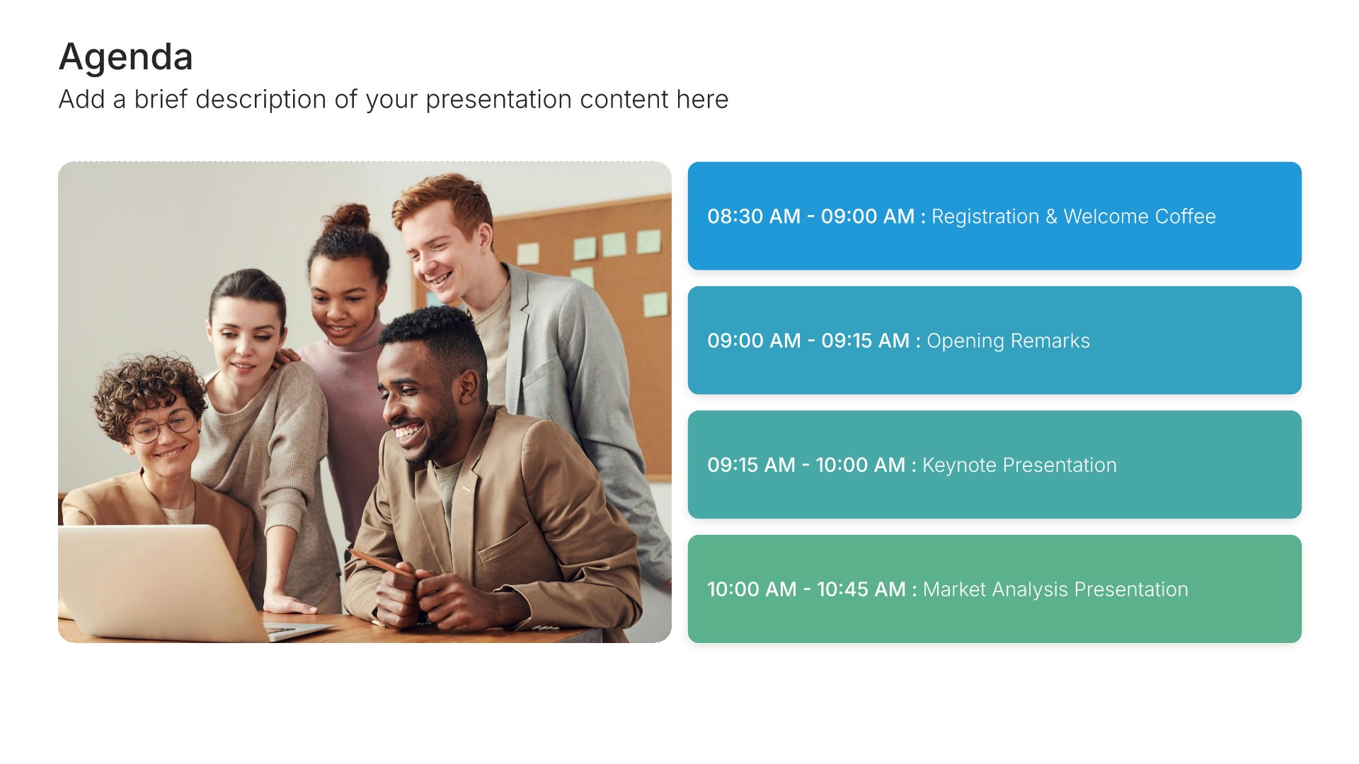 Agenda slides help you outline your presentation structure clearly. Use them to show topics, timing, and flow so your audience knows what to expect and can follow along easily. Ideal for meetings, workshops, and any presentation where setting expectations upfront helps your audience stay engaged throughout.