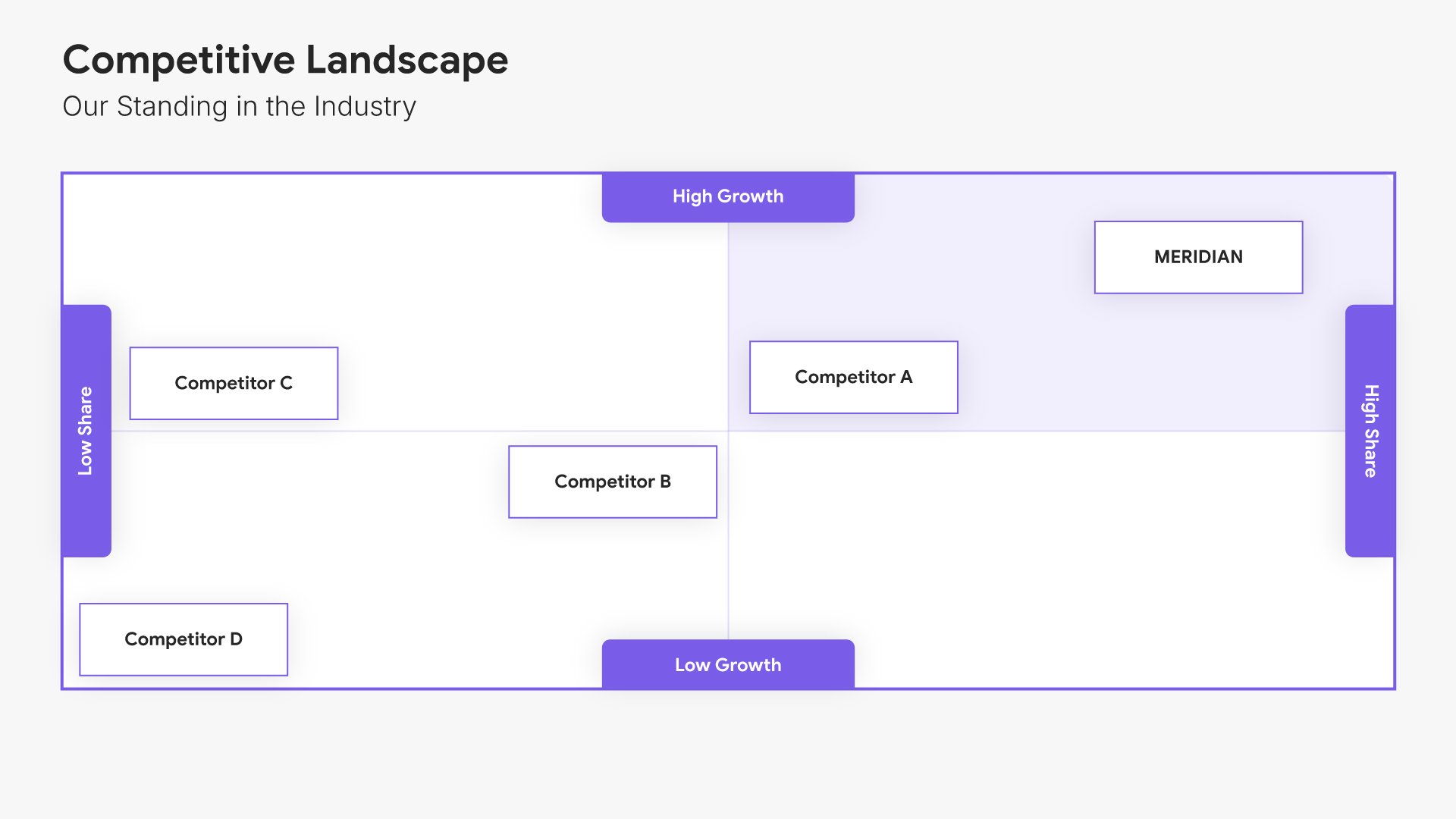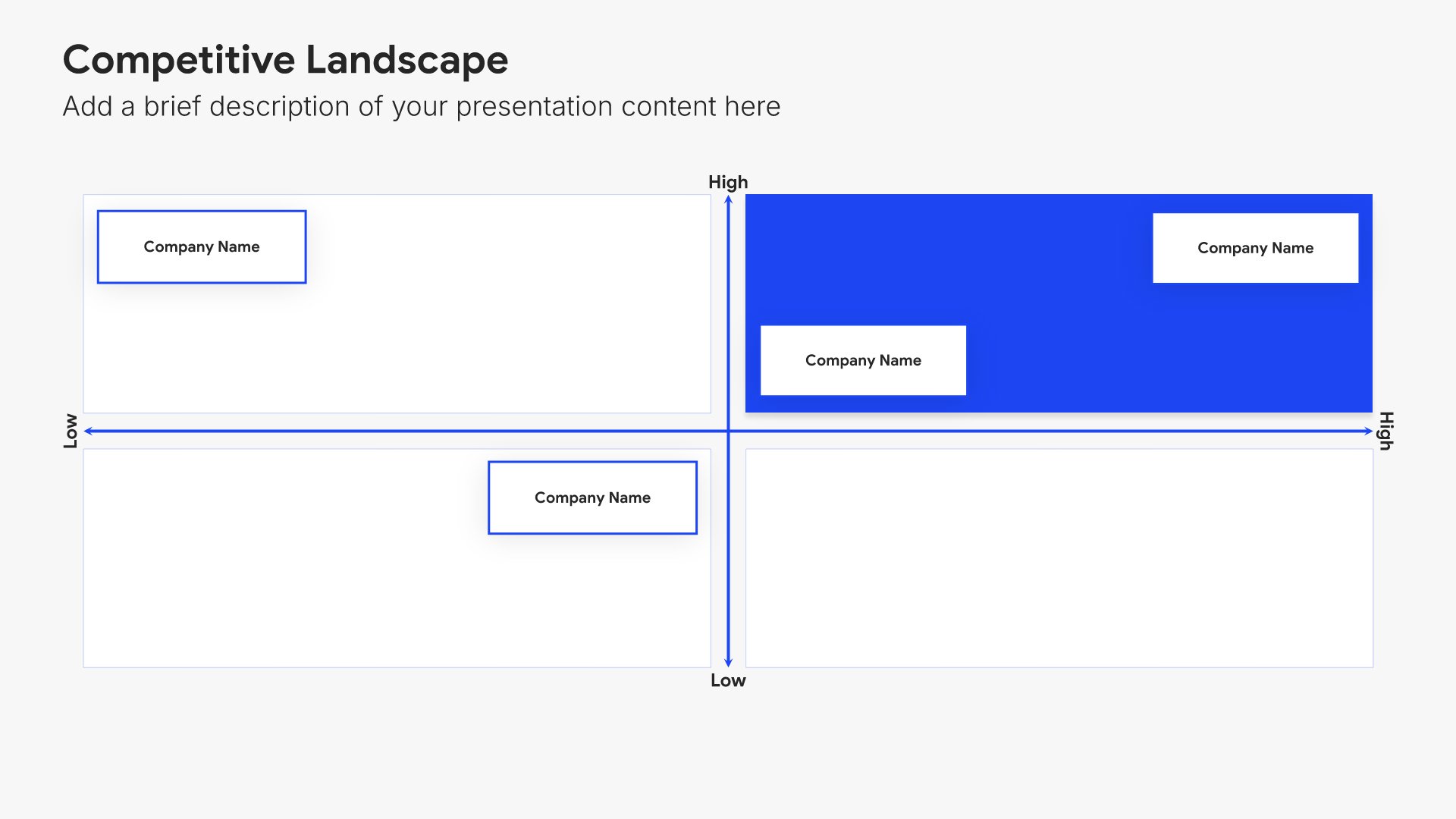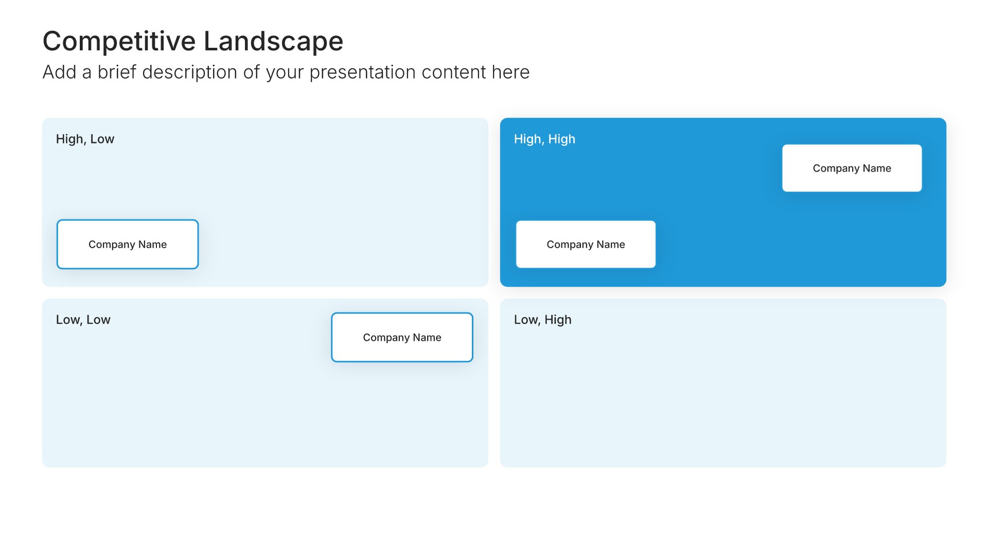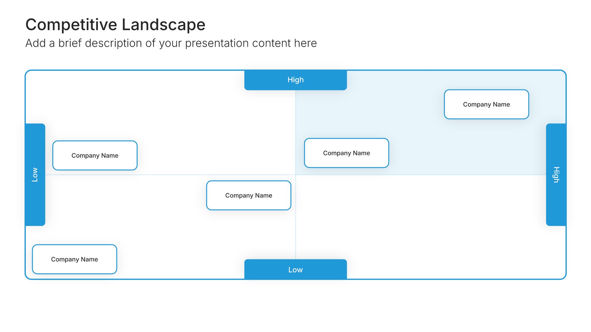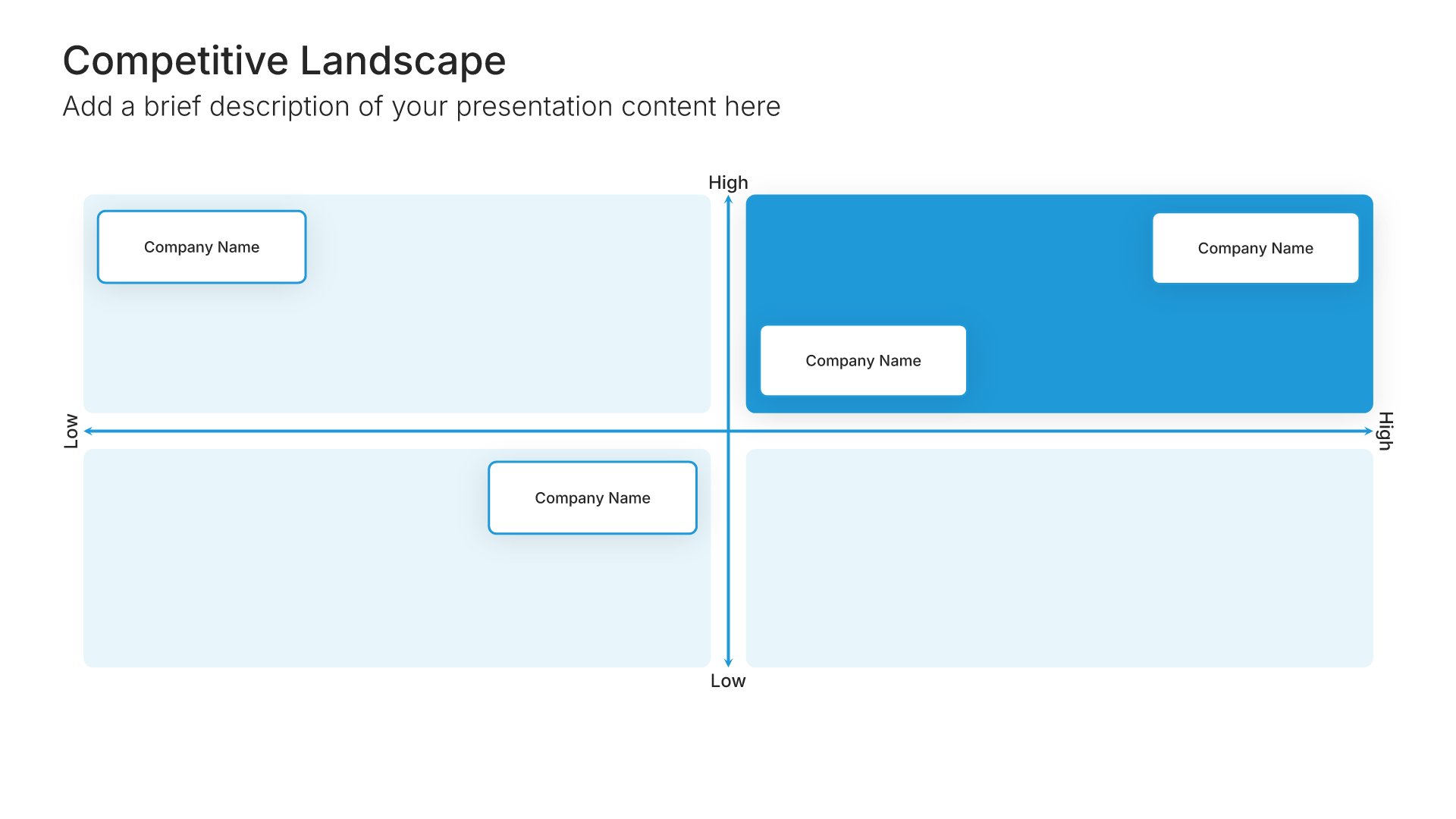 Competitive landscape slides help you map your market position visually. Use them to show where you and your competitors stand across key dimensions, making your strategic positioning clear. Ideal for investor presentations, strategic planning, and any pitch where demonstrating how you fit in the competitive market matters.