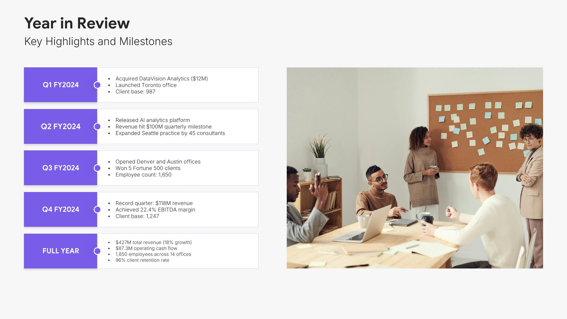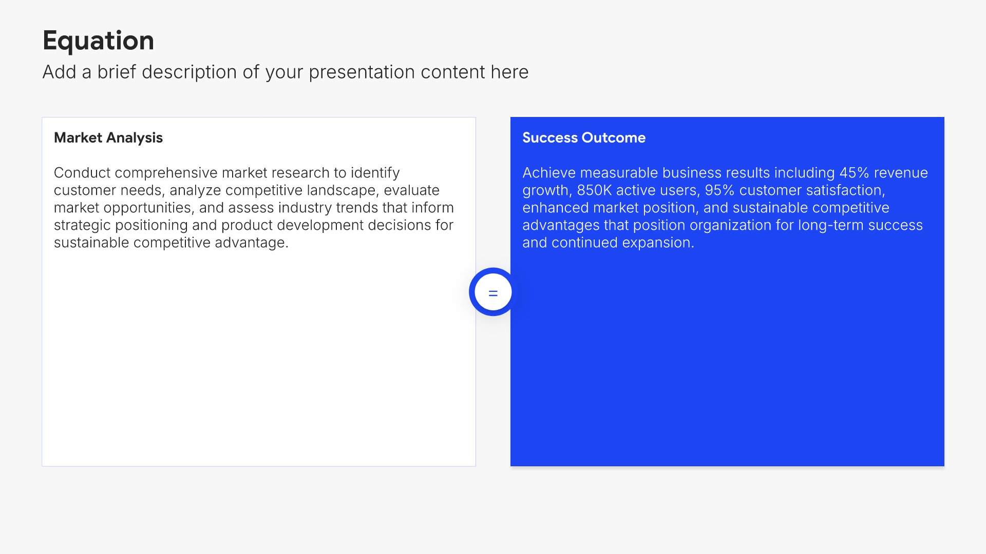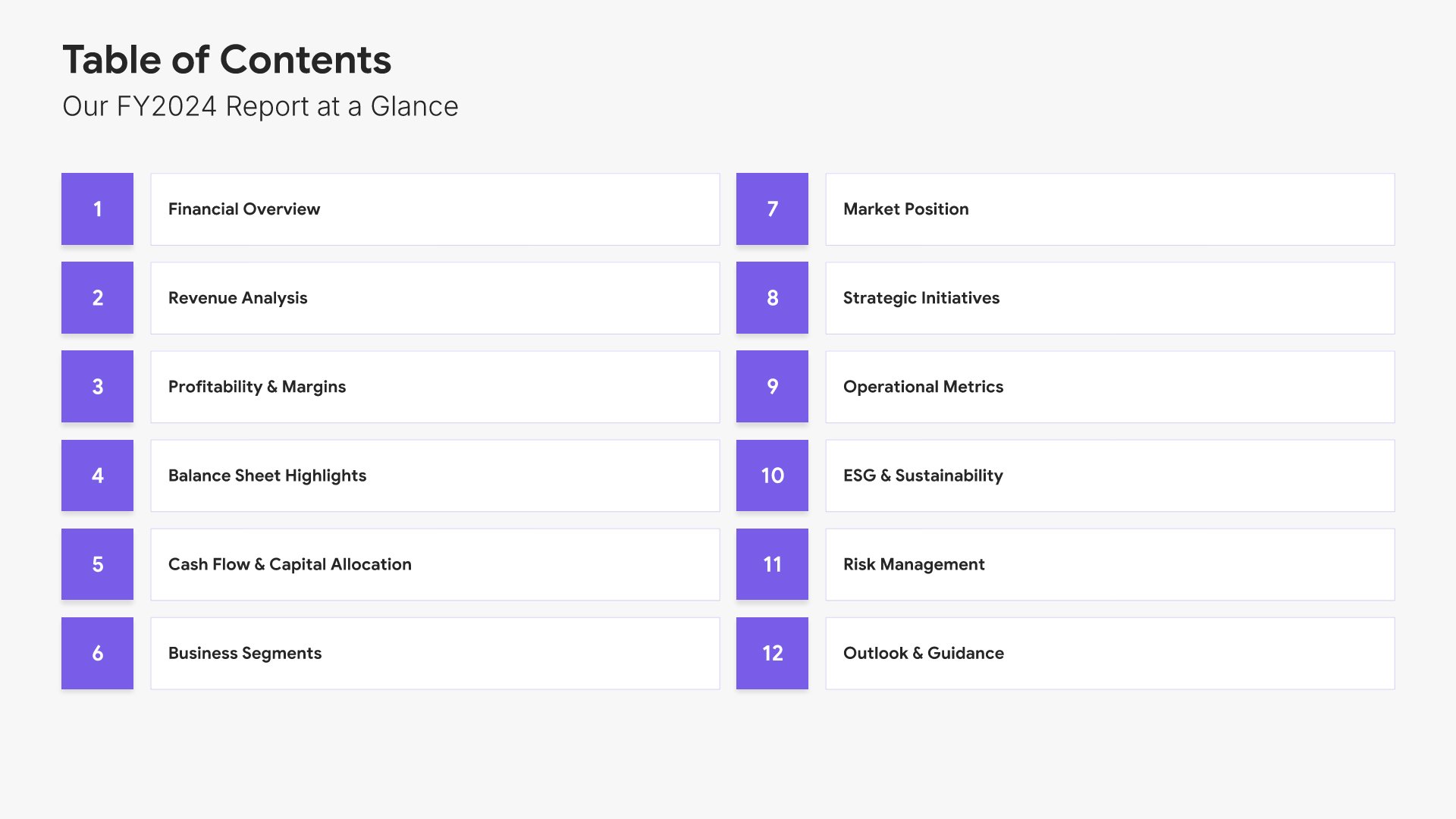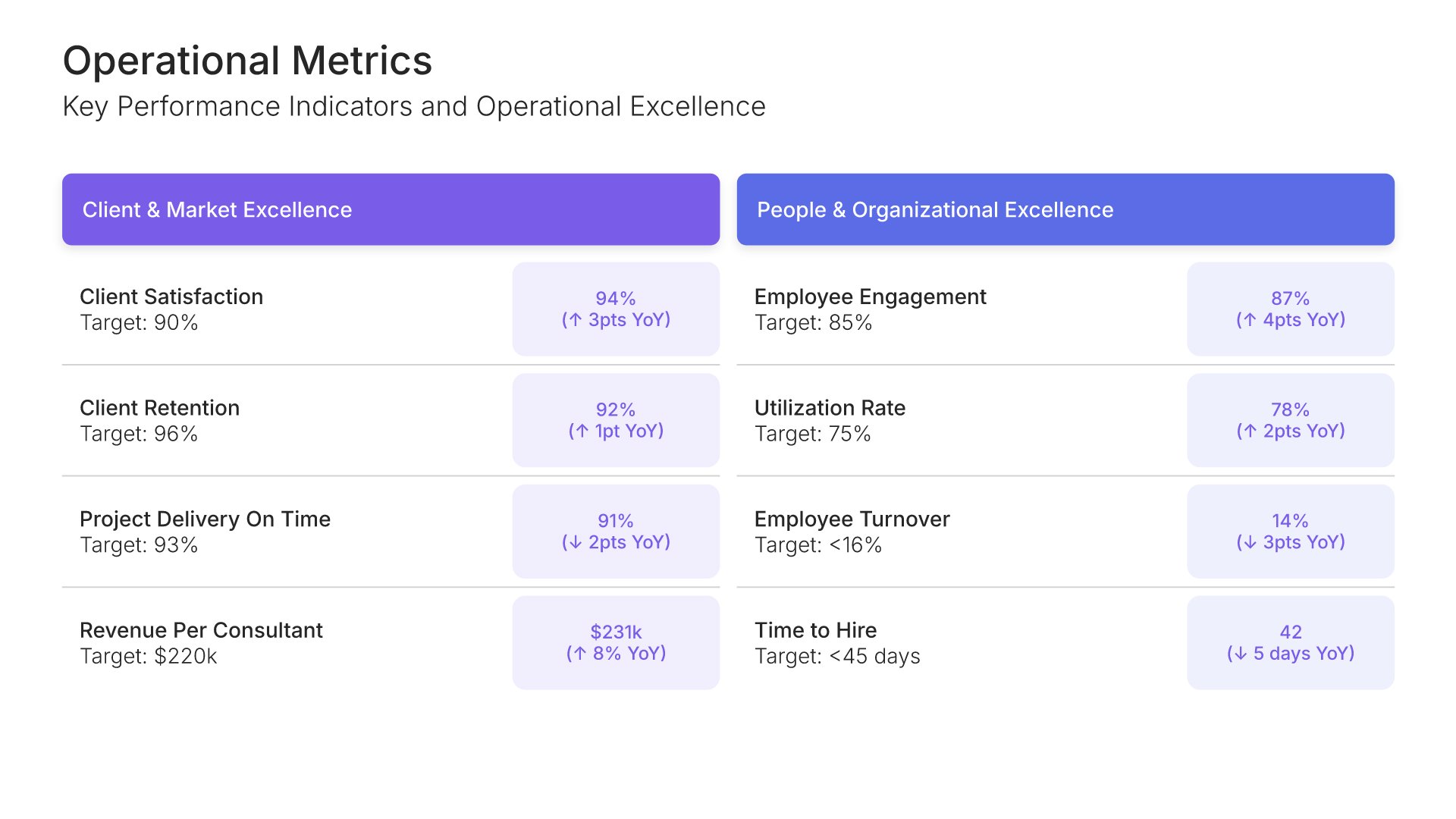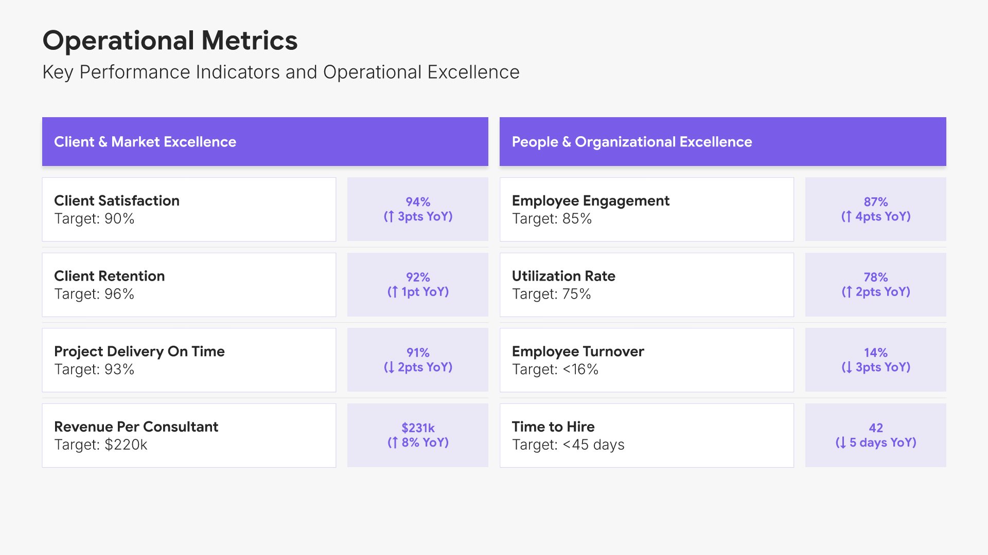 Operational metrics slides help you present key performance indicators beyond financials. Use them to display efficiency, productivity, quality, and other operational KPIs that drive business performance. Ideal for annual reports and business reviews where showing operational excellence complements financial results.