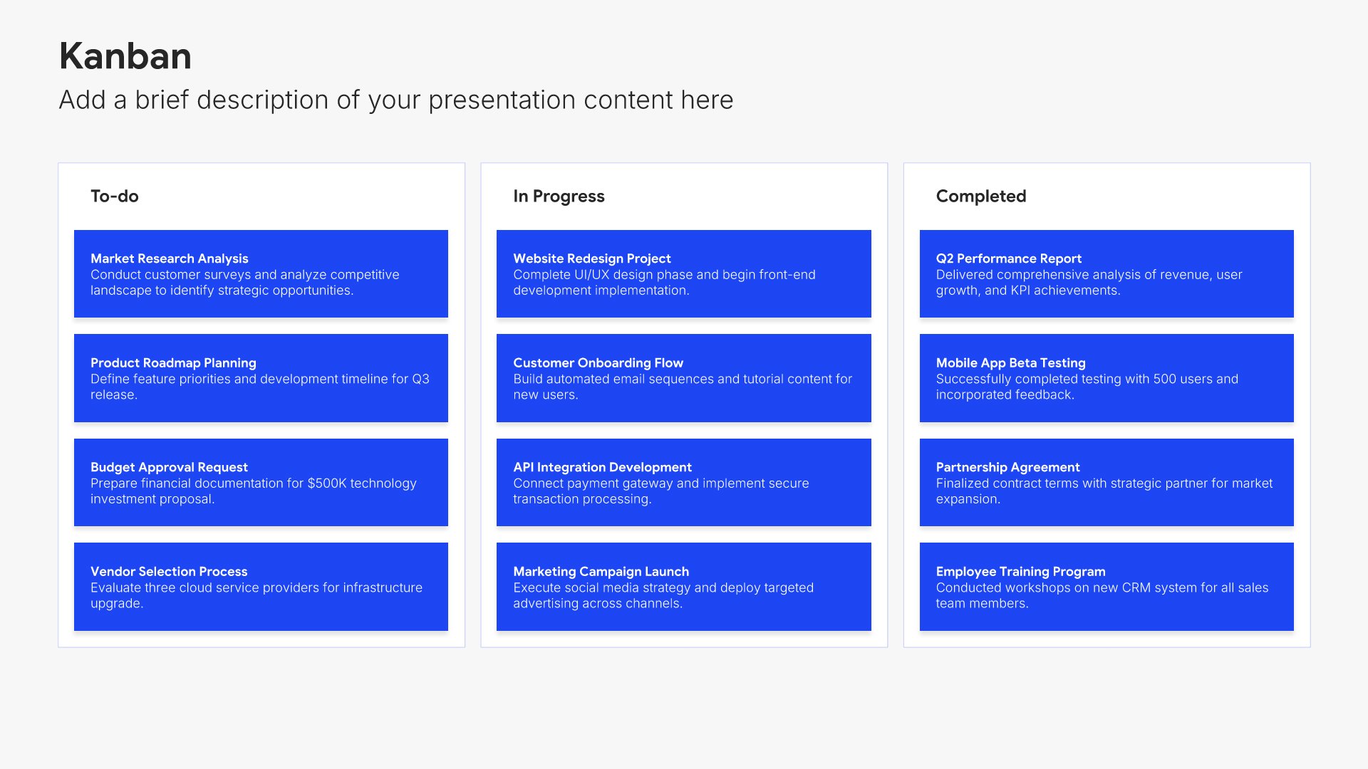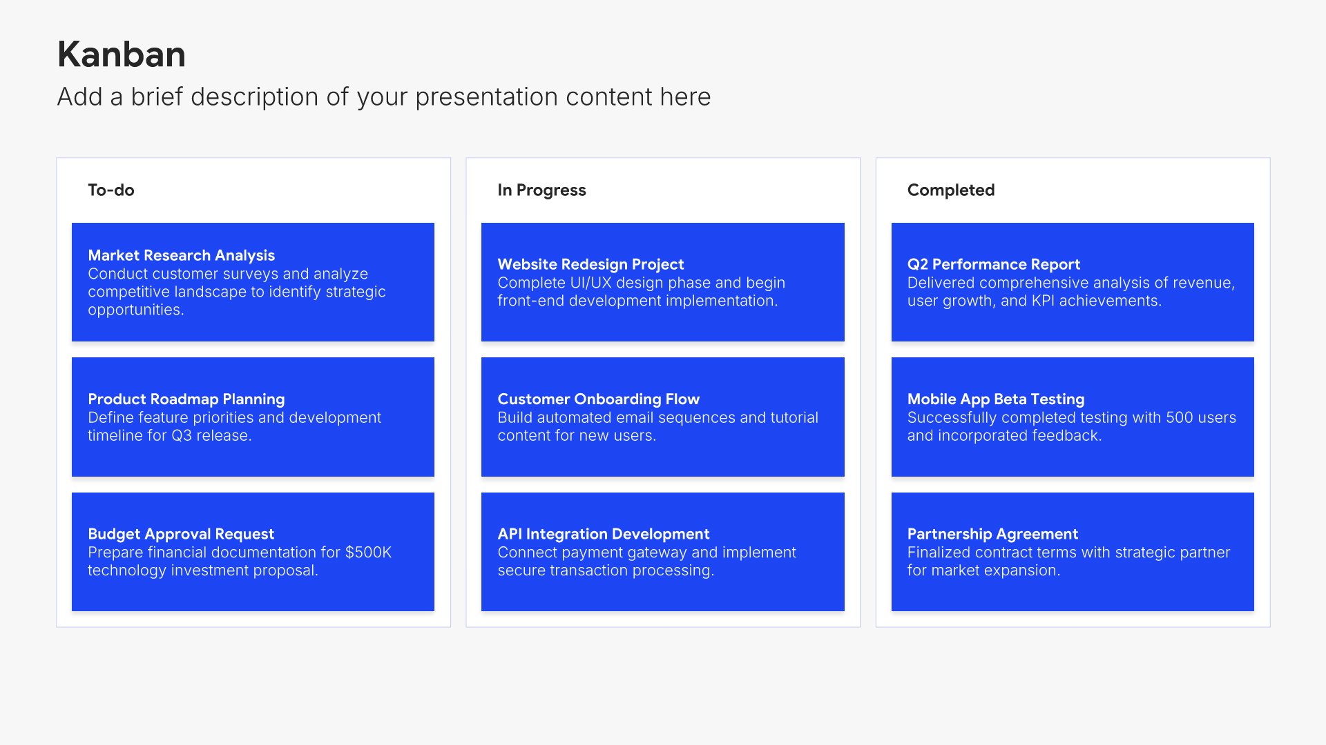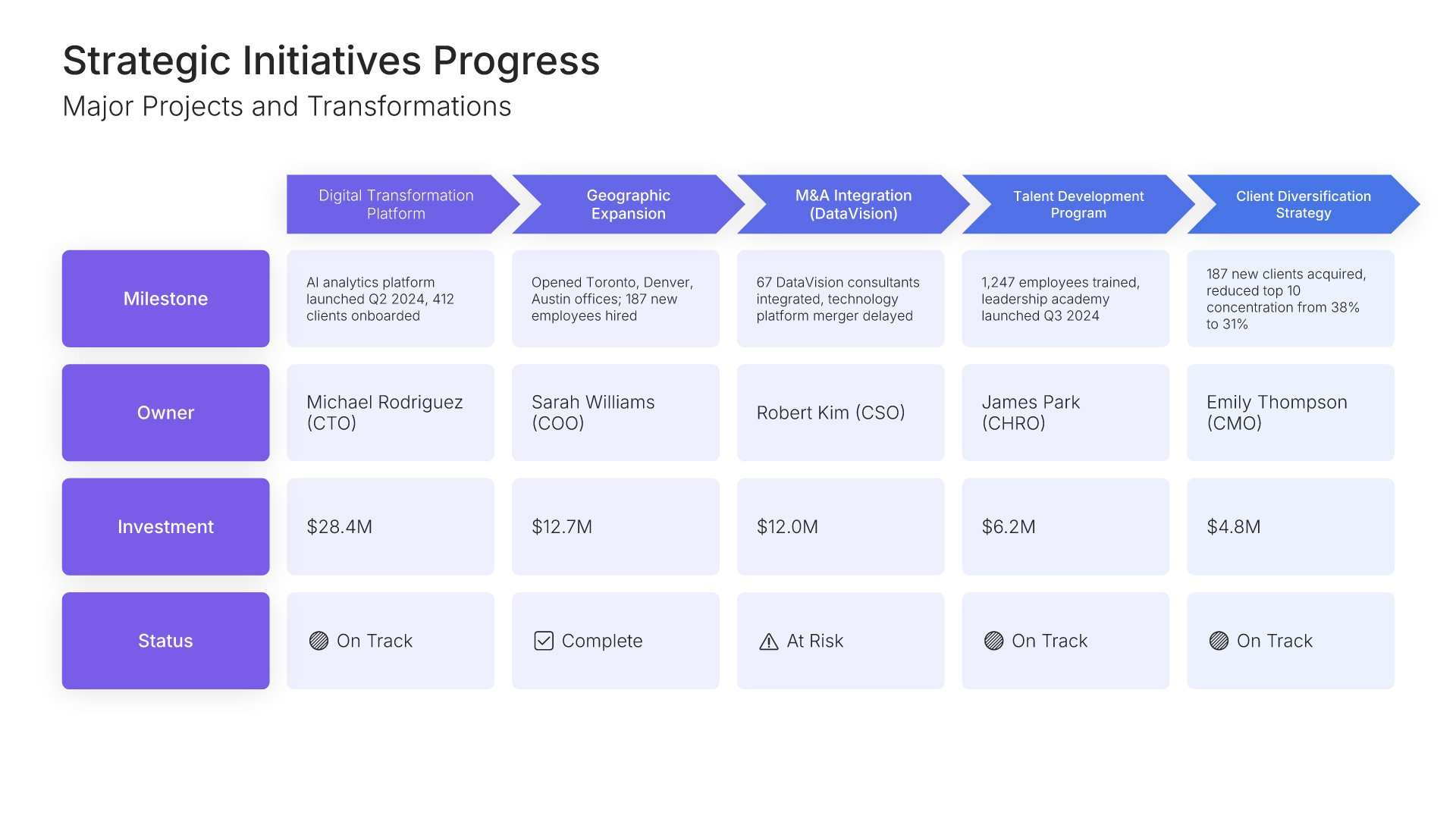 Strategic initiatives progress slides help you report on major projects and transformations. Use them to present status updates, milestones achieved, and next steps for key initiatives. Ideal for annual reports and board presentations where demonstrating execution against strategic priorities shows organizational momentum.
