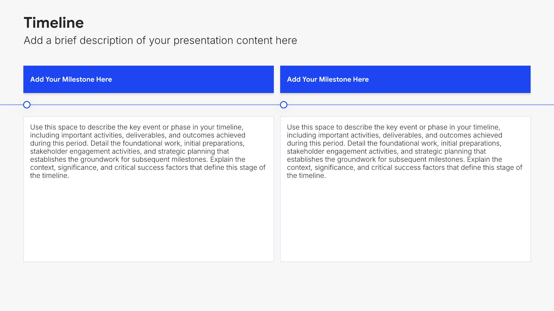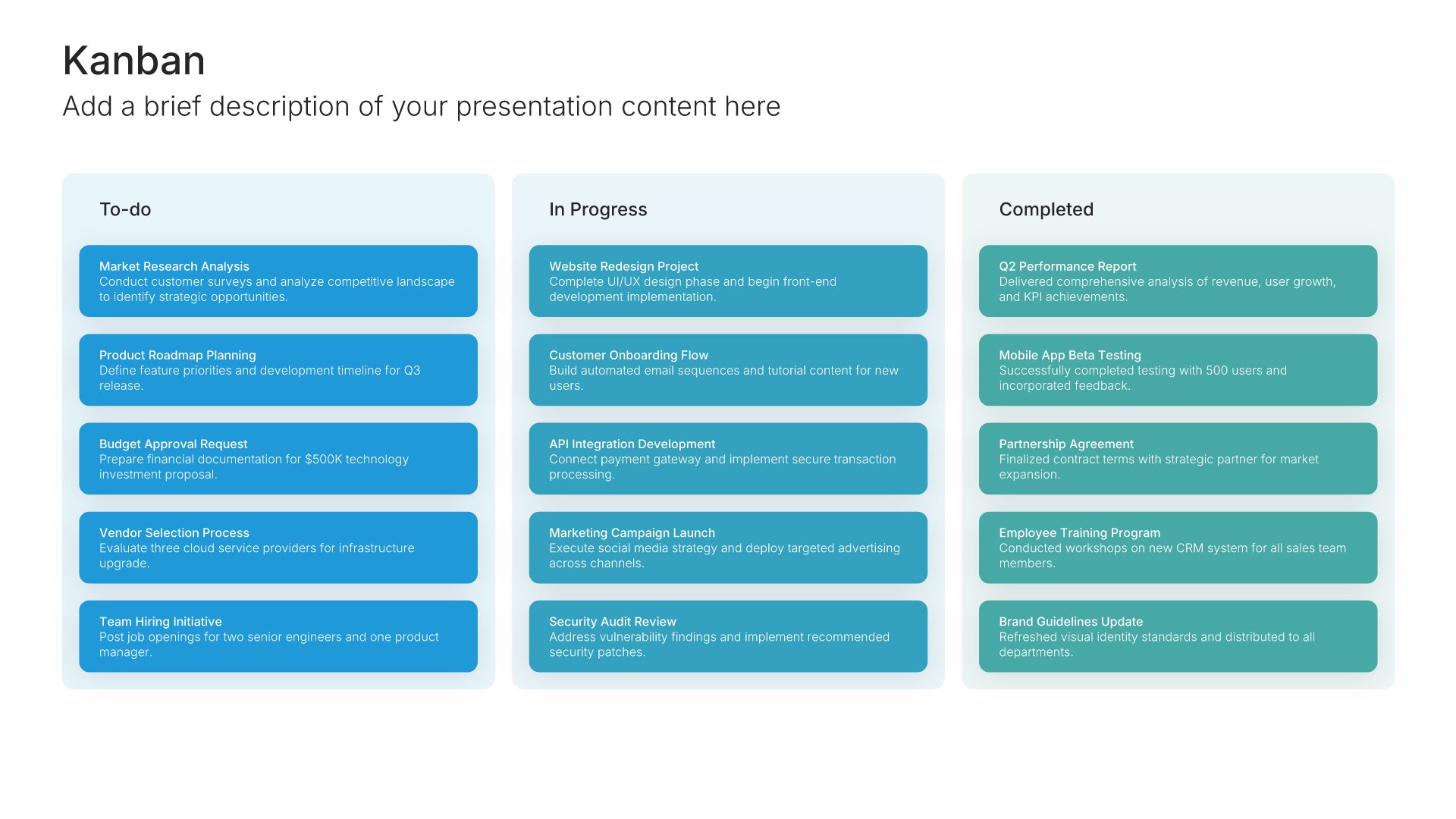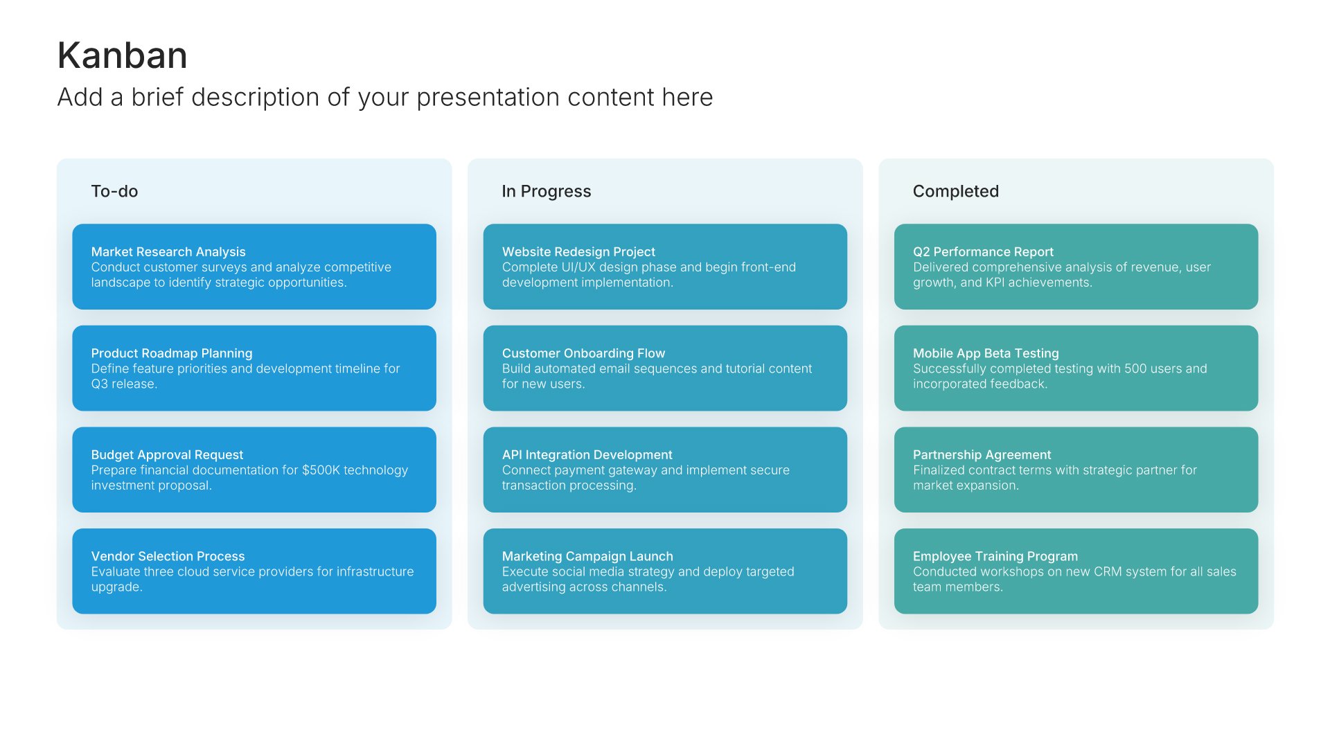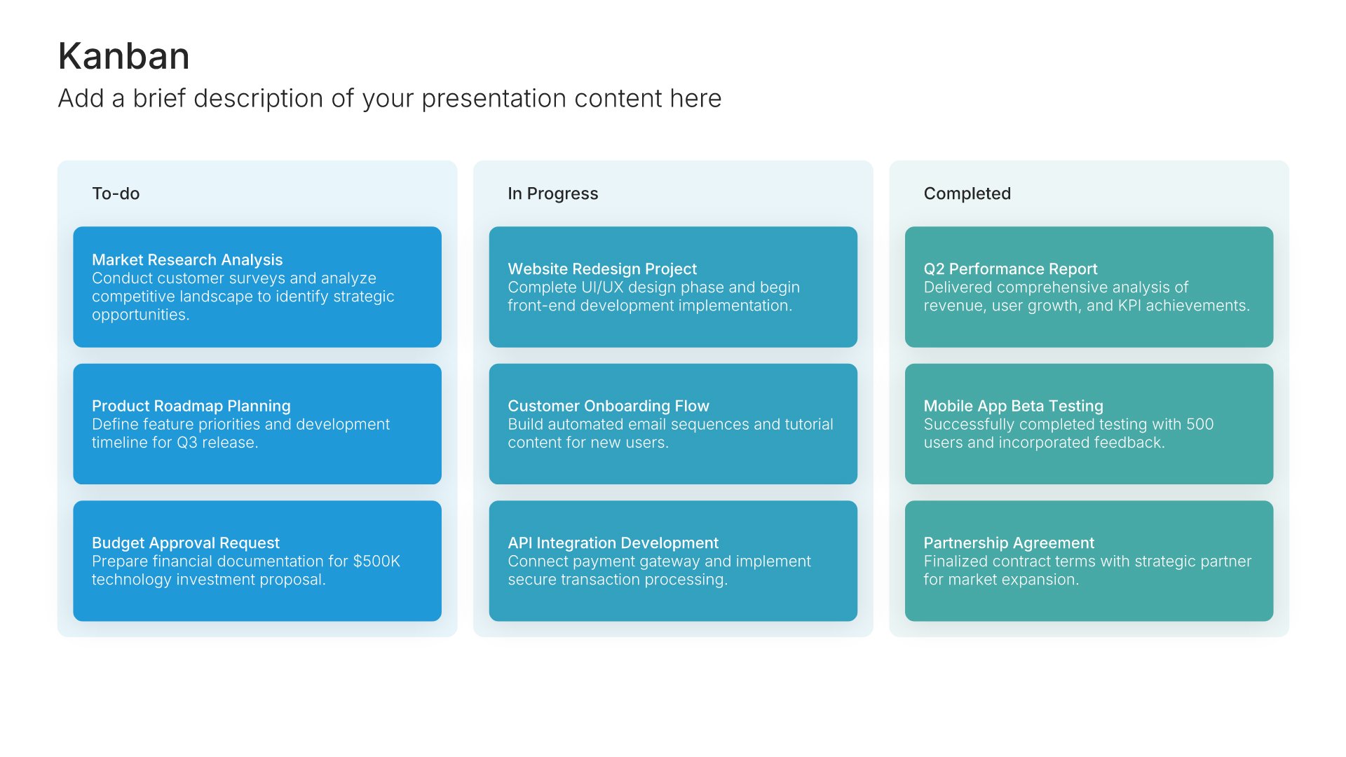 Strategic initiatives progress slides help you report on major projects and transformations. Use them to present status updates, milestones achieved, and next steps for key initiatives. Ideal for annual reports and board presentations where demonstrating execution against strategic priorities shows organizational momentum.
