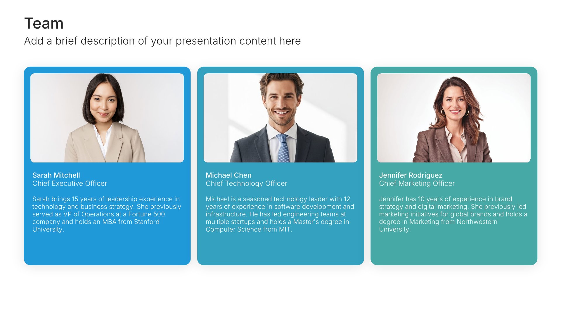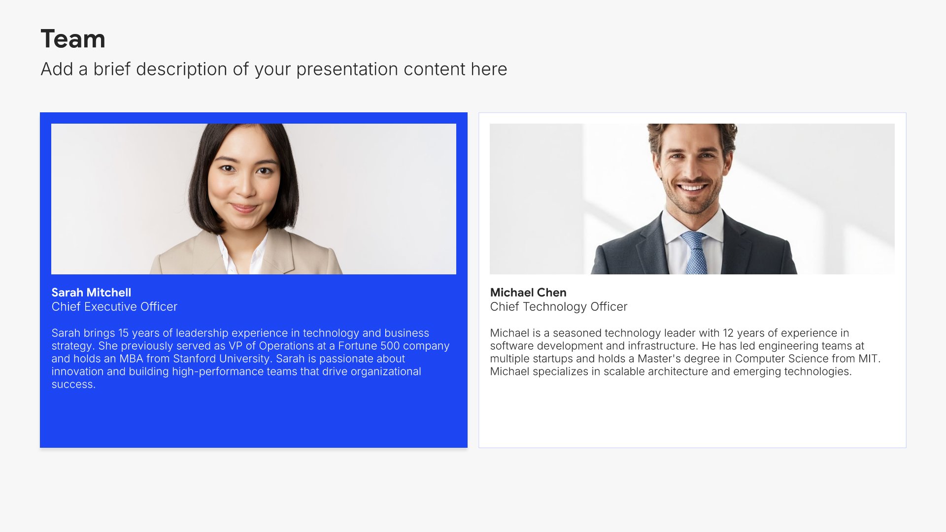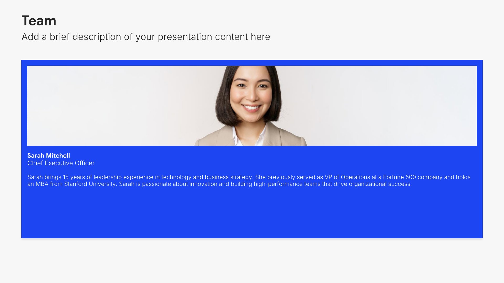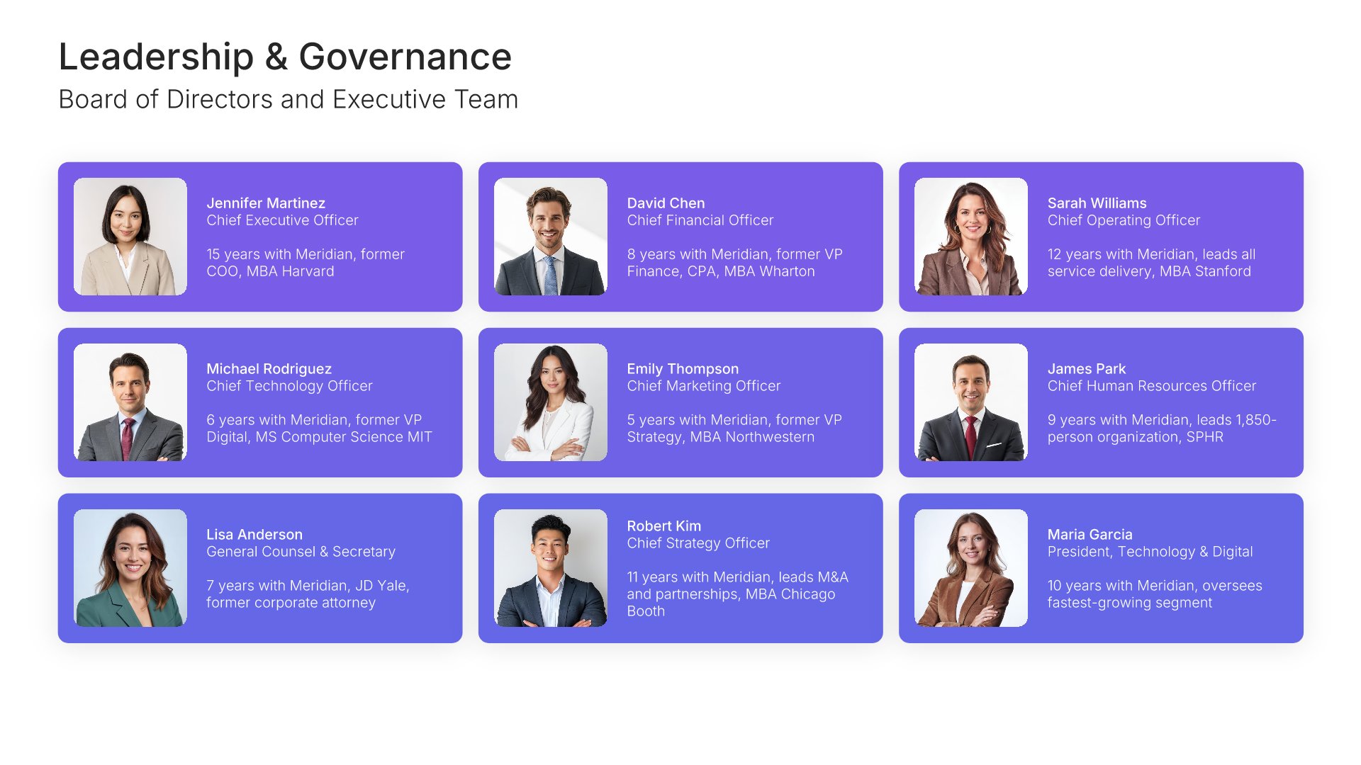 Leadership and governance slides help you introduce your executive team and board. Use them to present key leaders with photos, titles, credentials, and governance structures. Ideal for annual reports and stakeholder presentations where showing the people behind the organization builds trust and credibility.