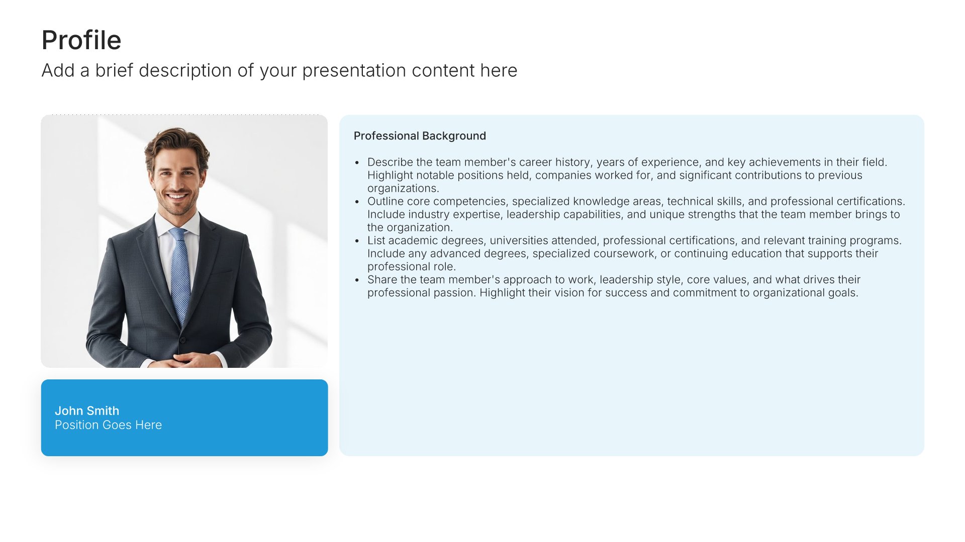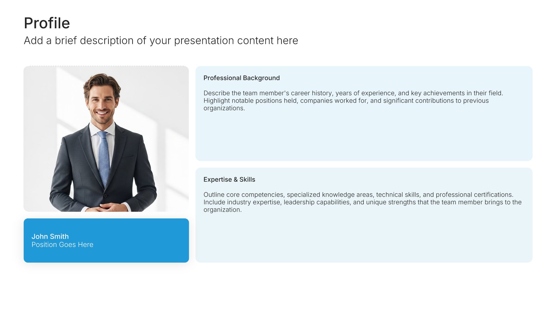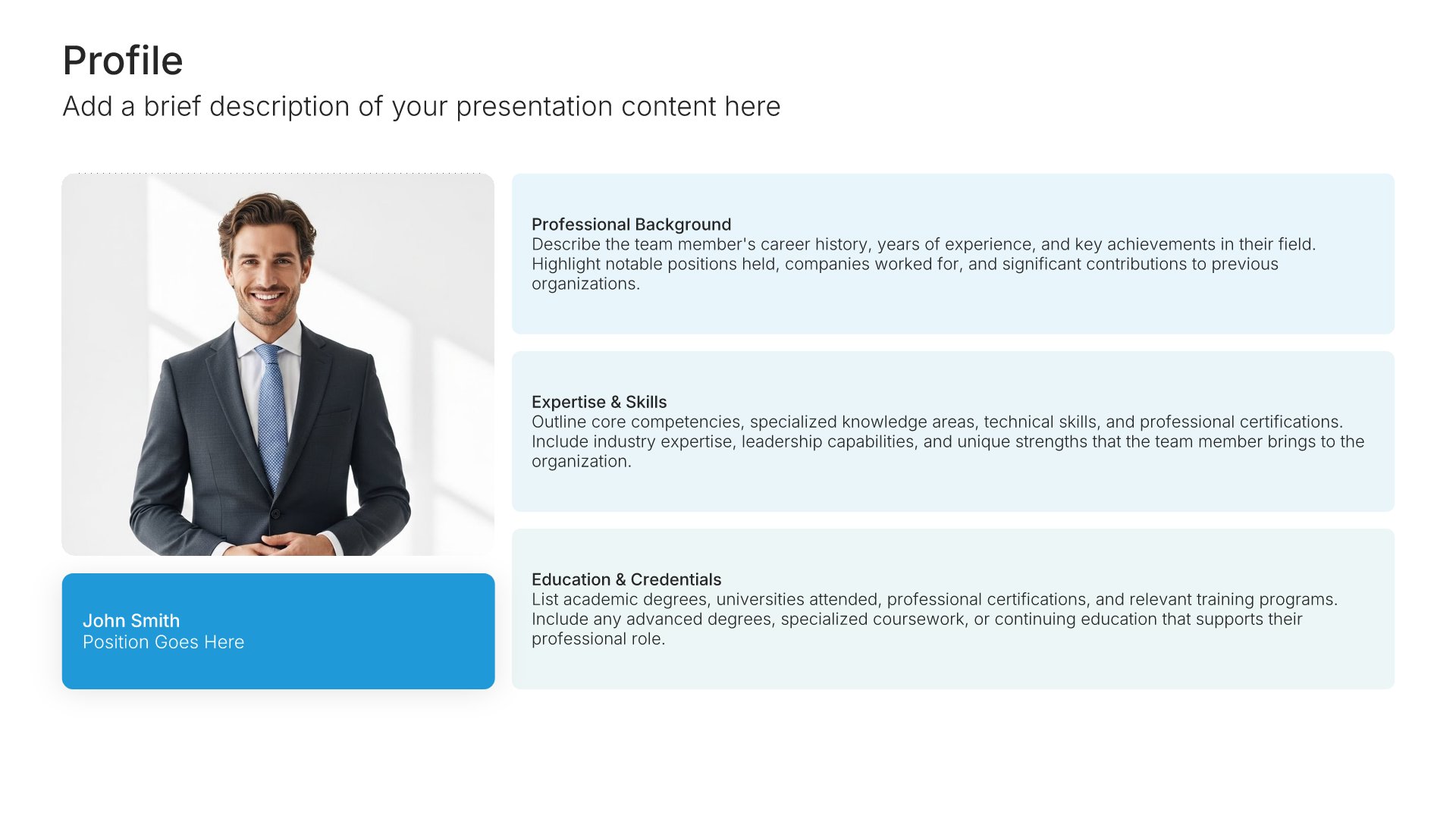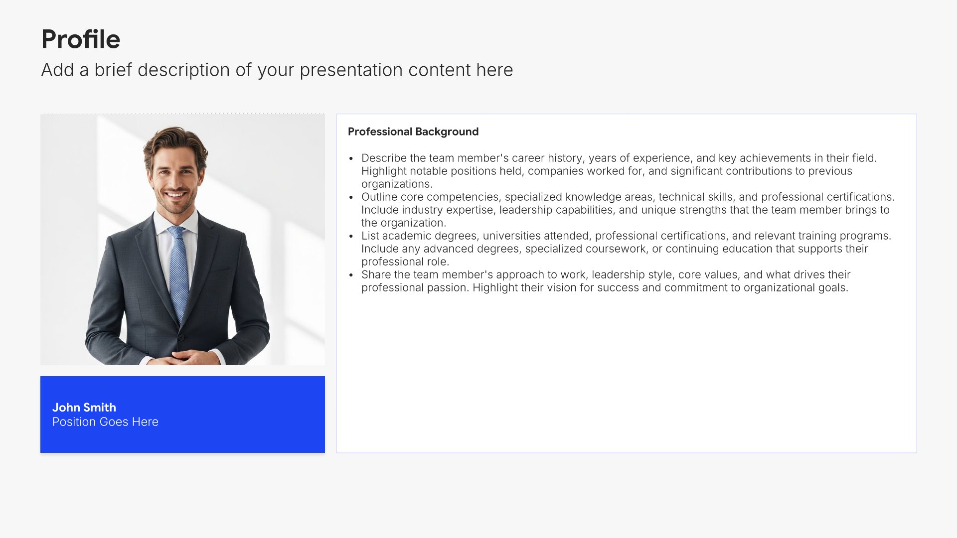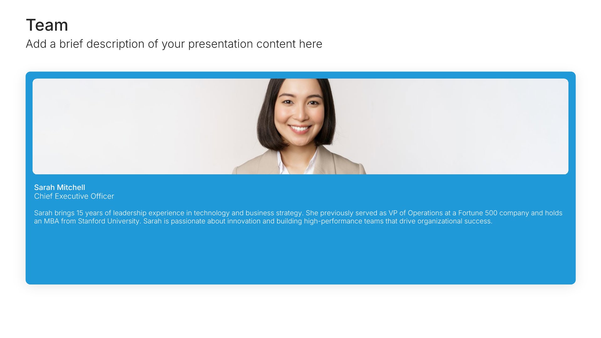 Leadership and governance slides help you introduce your executive team and board. Use them to present key leaders with photos, titles, credentials, and governance structures. Ideal for annual reports and stakeholder presentations where showing the people behind the organization builds trust and credibility.