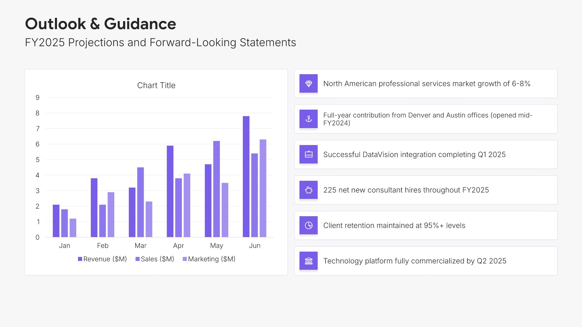 Outlook and guidance slides help you share your expectations for the future. Use them to present forecasts, targets, strategic priorities, and assumptions for the coming period. Ideal for annual reports and investor presentations where forward-looking statements help stakeholders understand your trajectory.