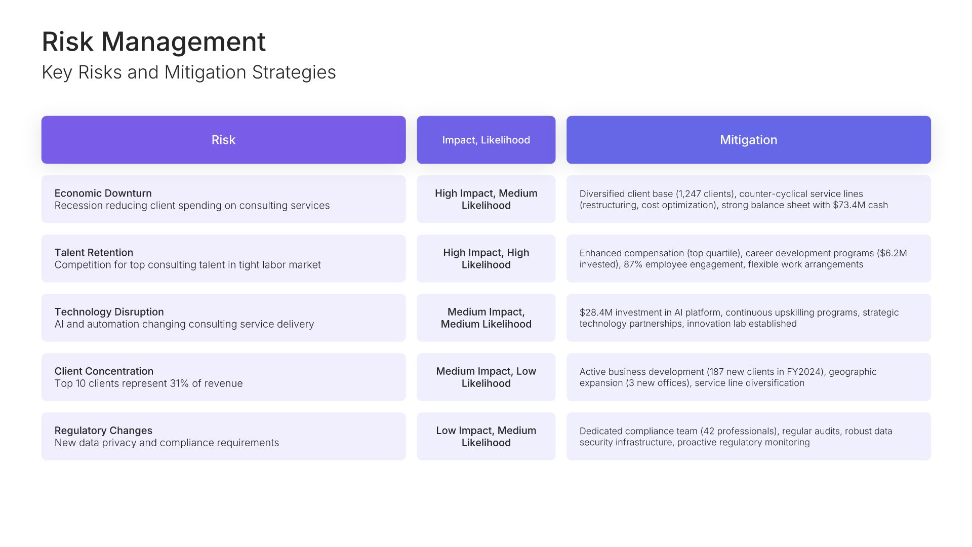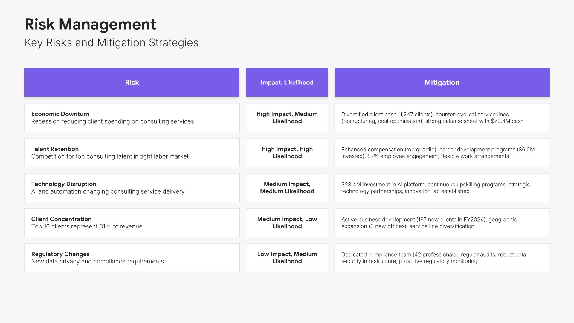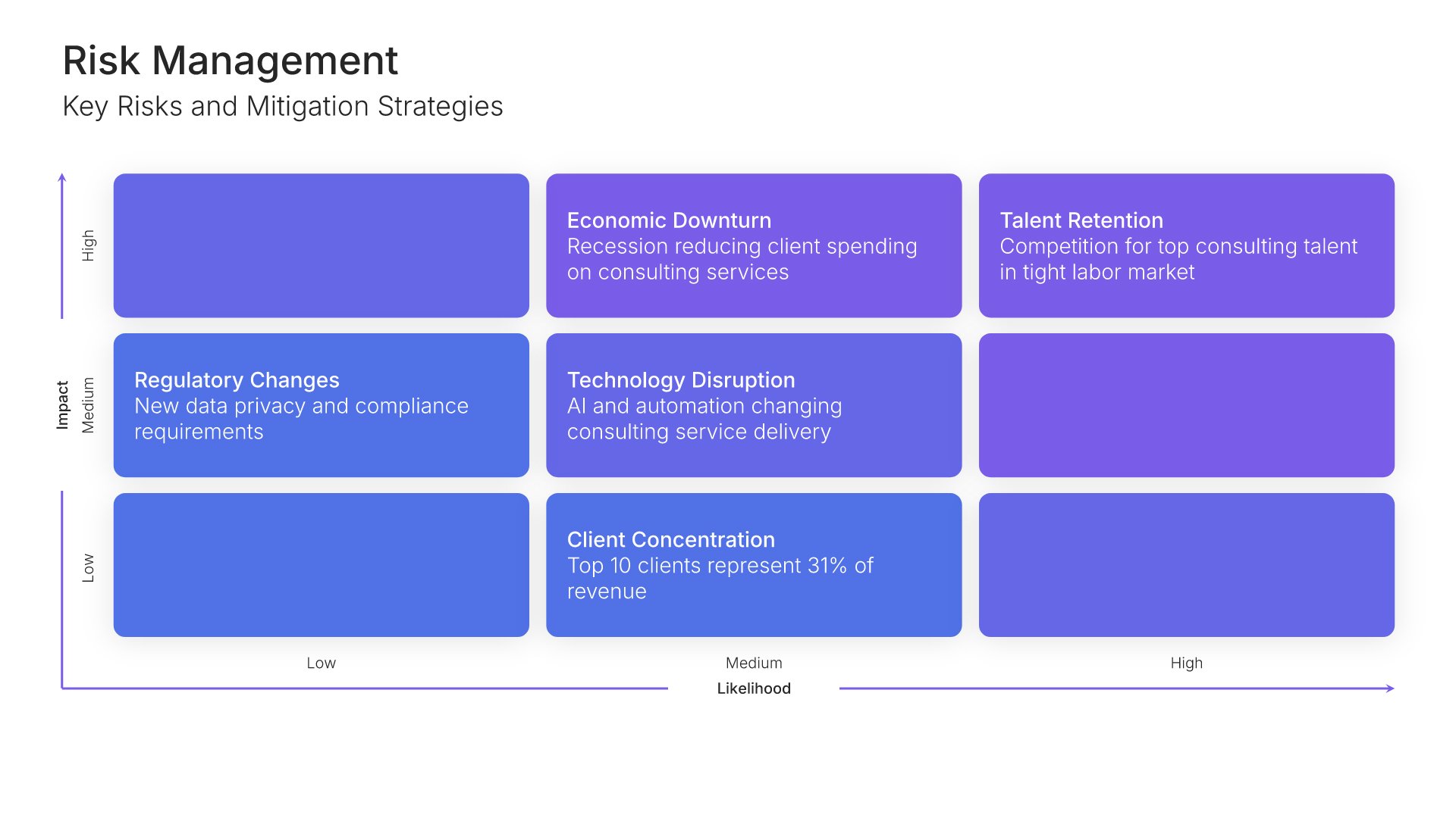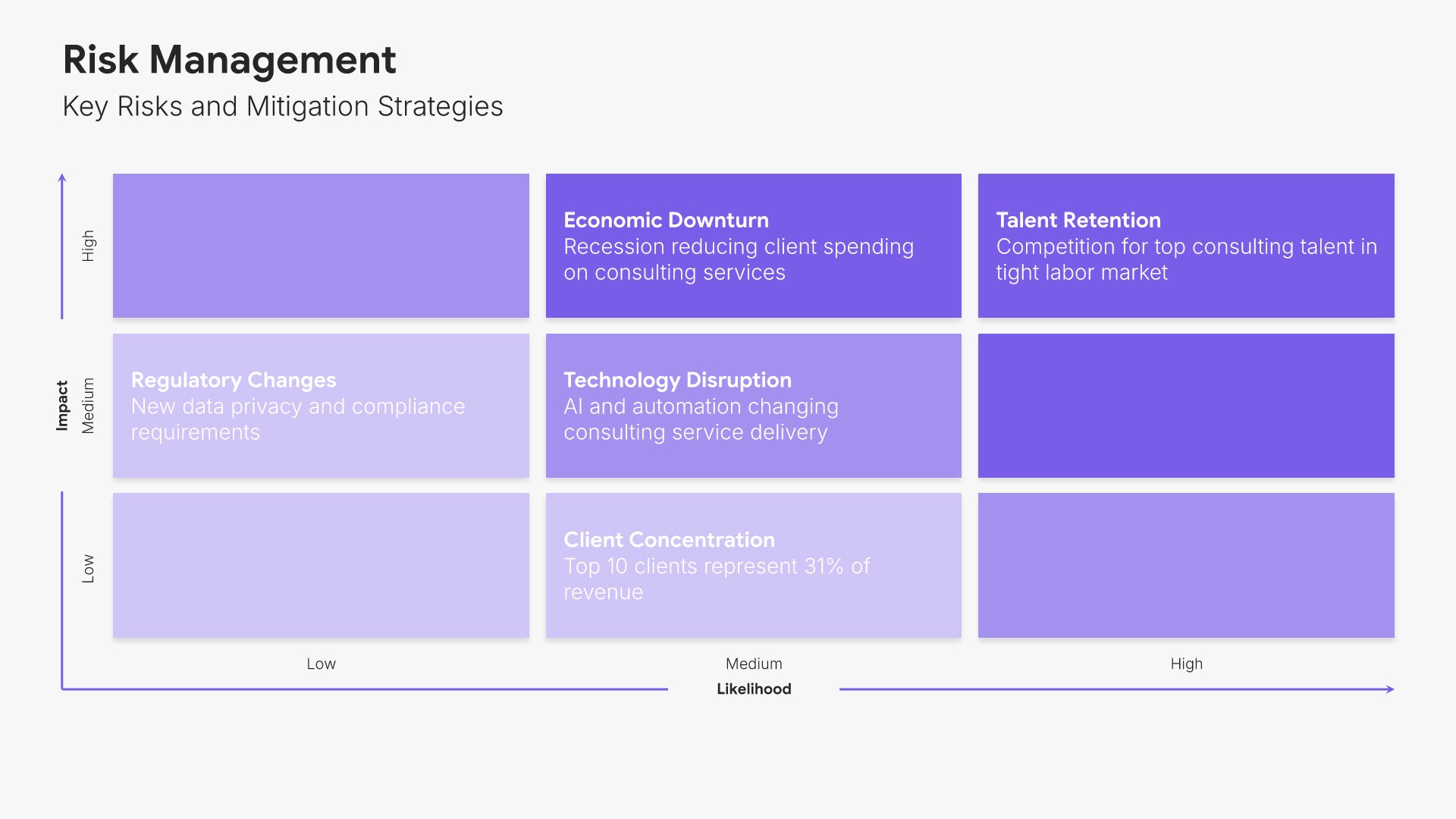 Risk assessment slides help you identify potential challenges and mitigation strategies. Use them to present risks that could impact your budget, along with contingency plans and safeguards. Ideal for budget proposals and business cases where acknowledging risks and showing preparedness builds stakeholder confidence.