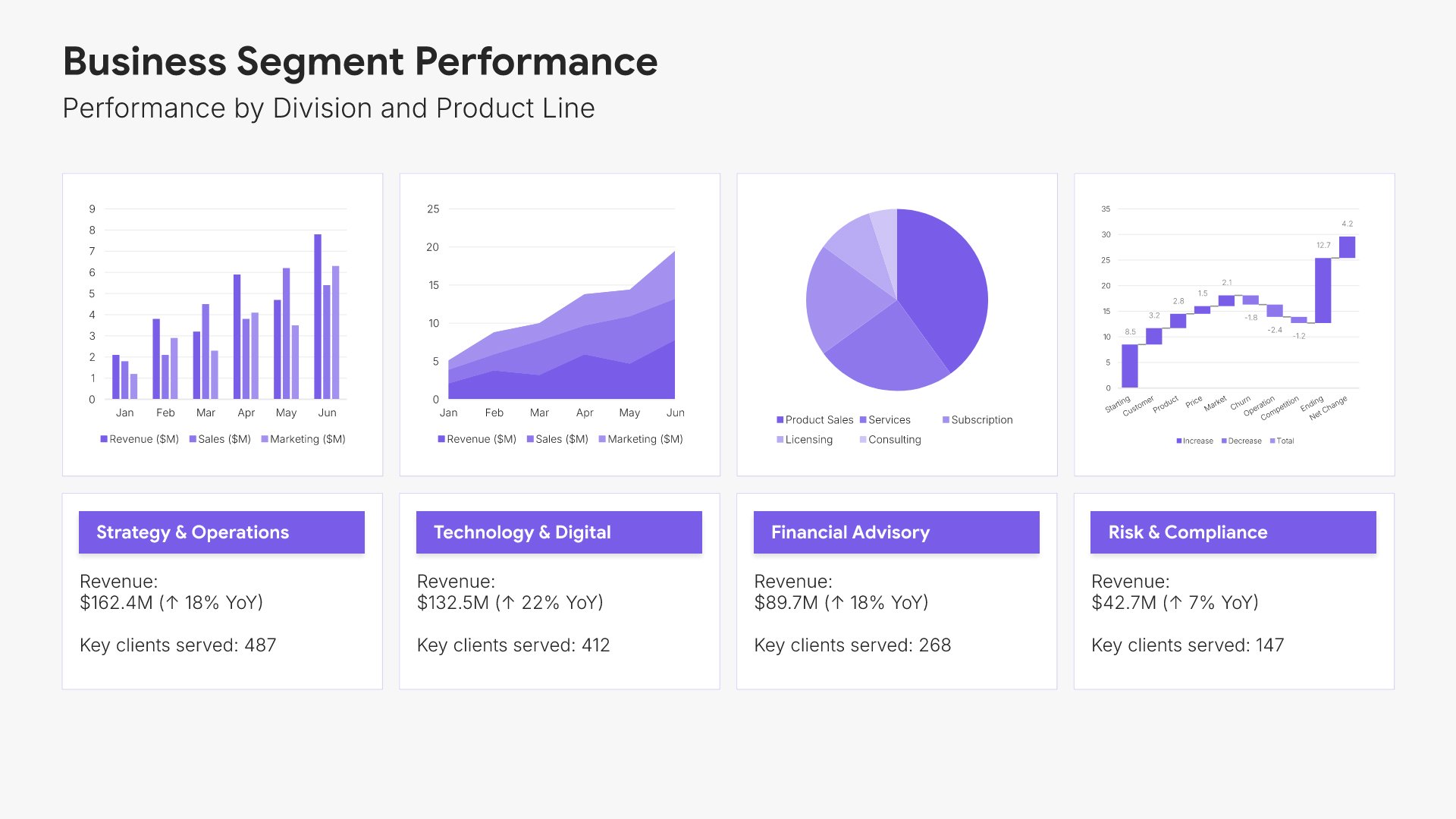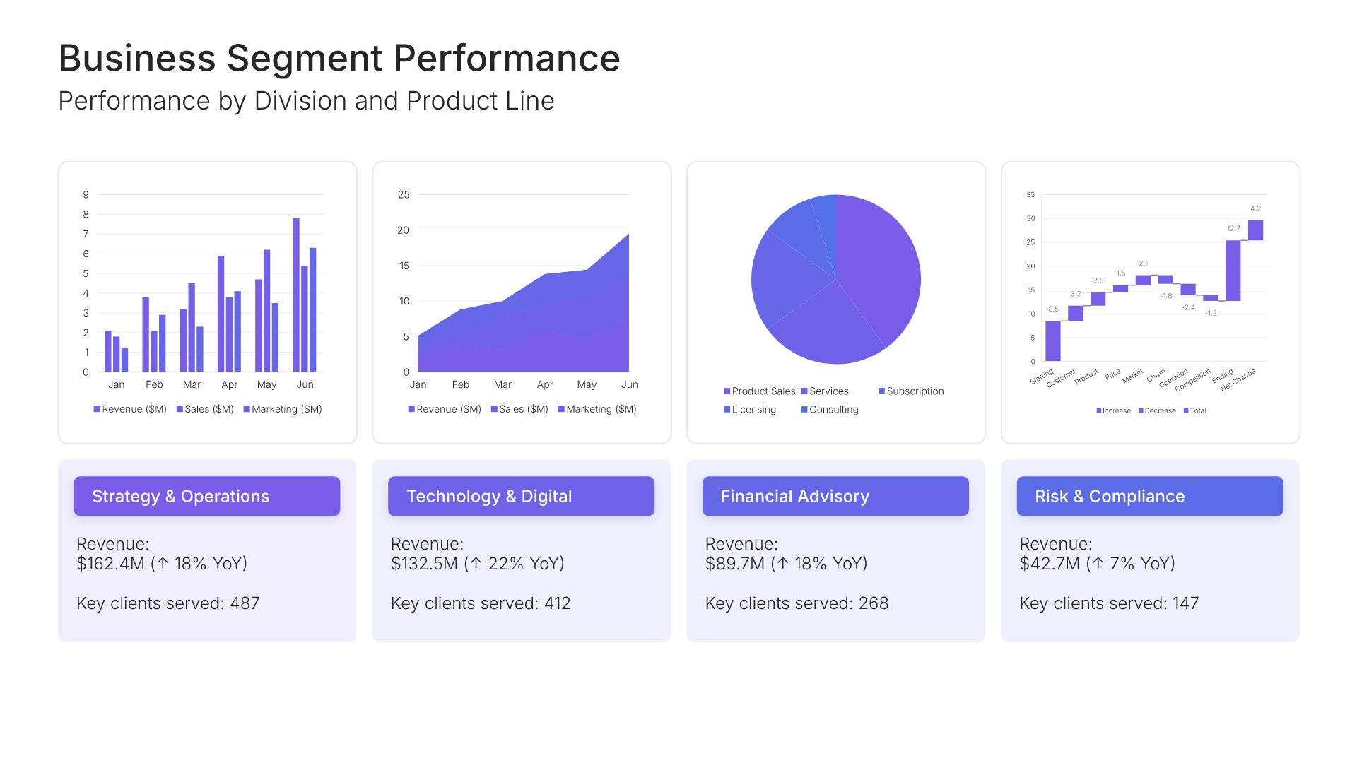 Business segment performance slides help you break down results by division or product line. Use them to present how each part of your business contributed to overall performance. Ideal for annual reports and strategic reviews where understanding segment-level results informs investment and focus decisions.