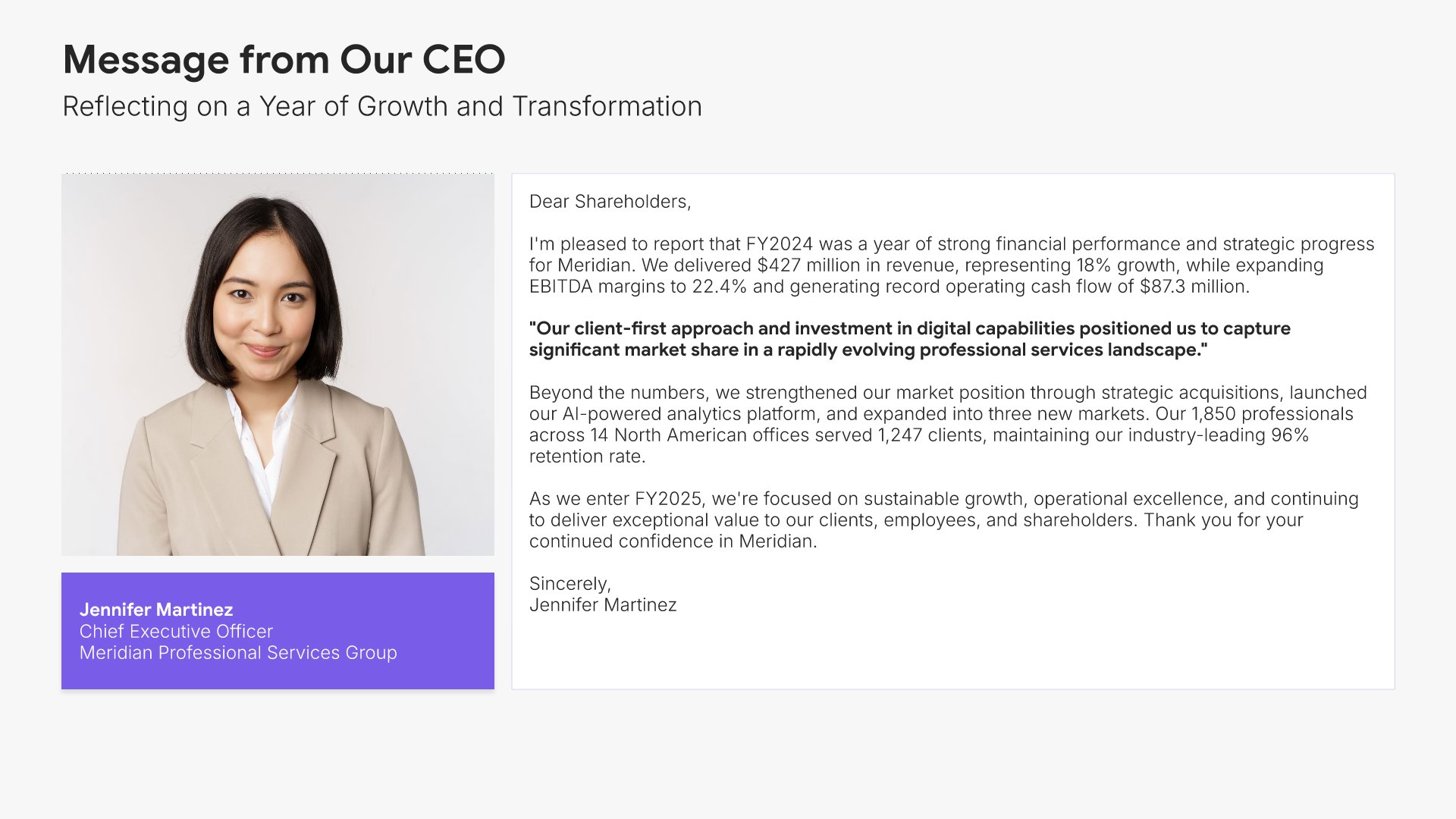 Message from leadership slides help you share perspective from executives or board members. Use them to present a personal letter, reflections on the year, and vision for the future. Ideal for annual reports and stakeholder presentations where a leadership voice adds credibility and sets the tone for what follows.