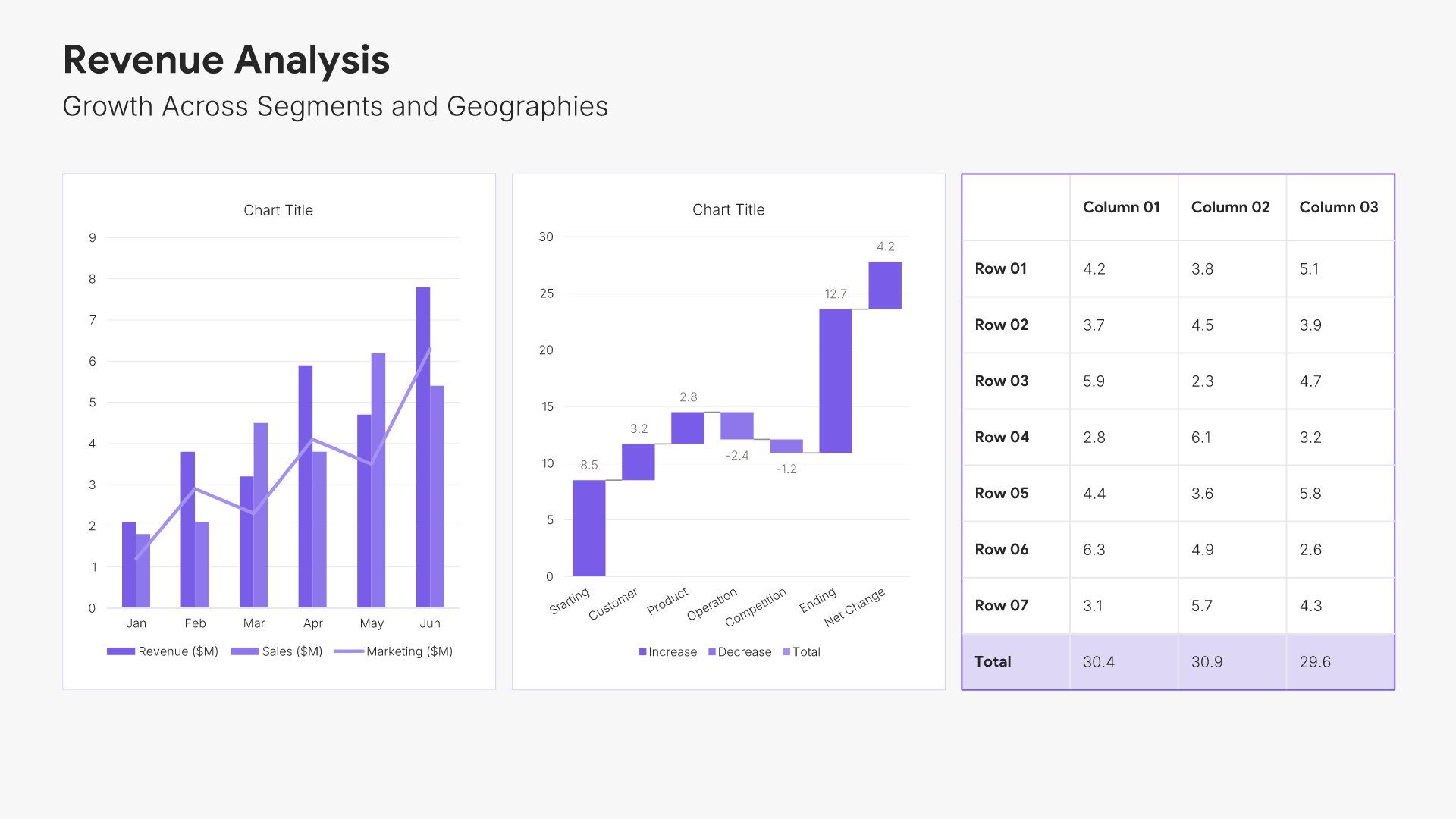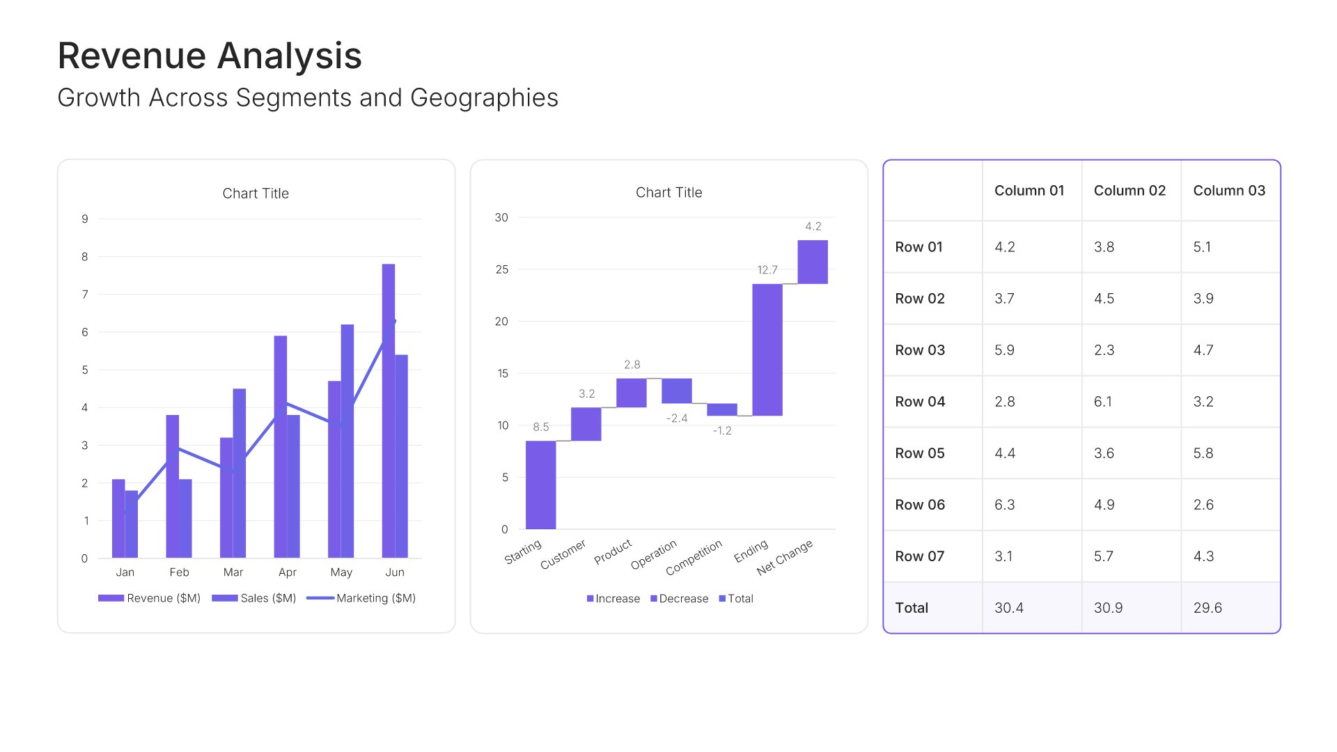 Revenue analysis slides help you break down income sources and growth drivers. Use them to present revenue by segment, geography, product line, or customer type. Ideal for annual reports and financial reviews where understanding where revenue comes from helps stakeholders assess business performance.