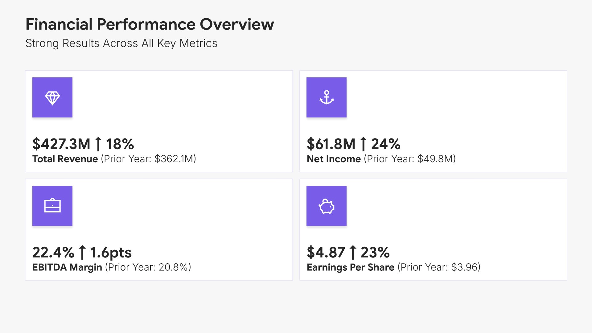 Financial performance overview slides help you summarize key financial results at a glance. Use them to present top-line metrics like revenue, profit, and growth in a clear dashboard format. Ideal for annual reports and investor presentations where stakeholders need a quick snapshot of financial health.