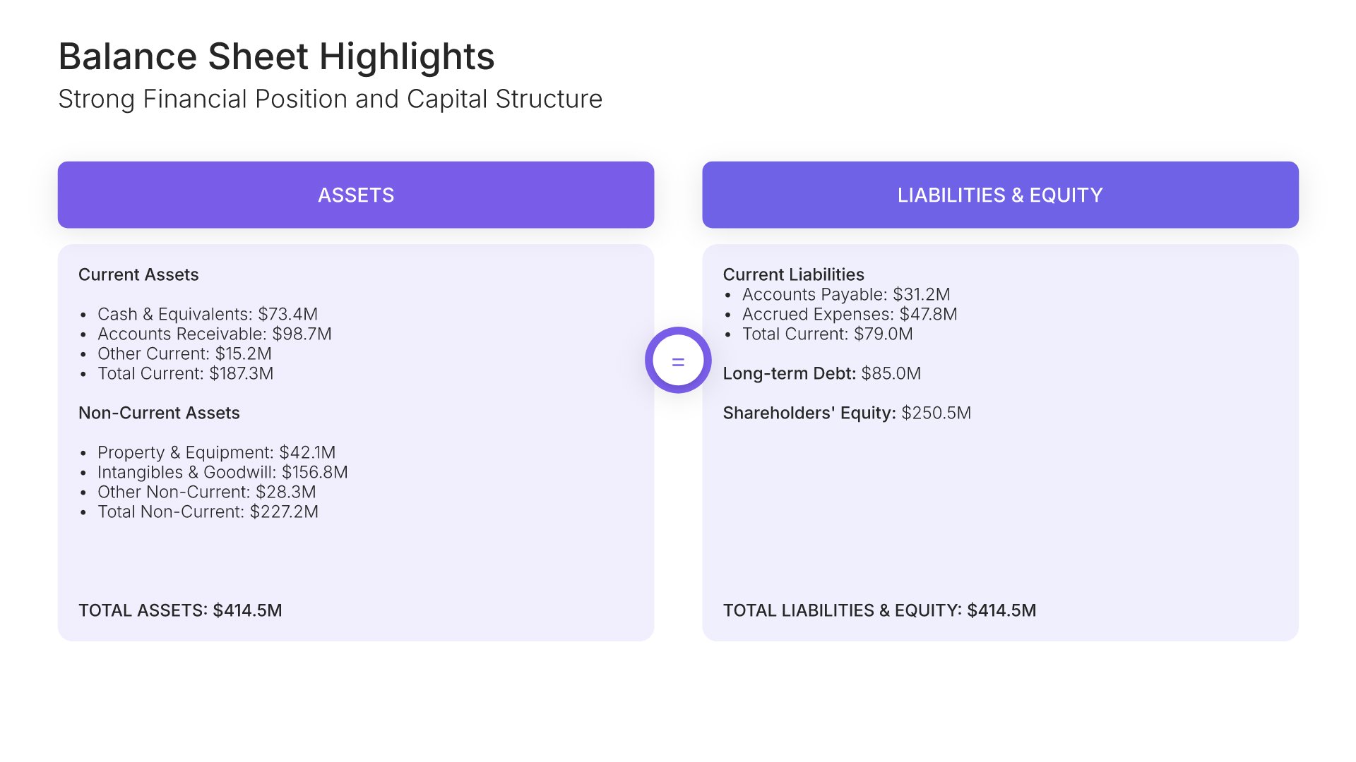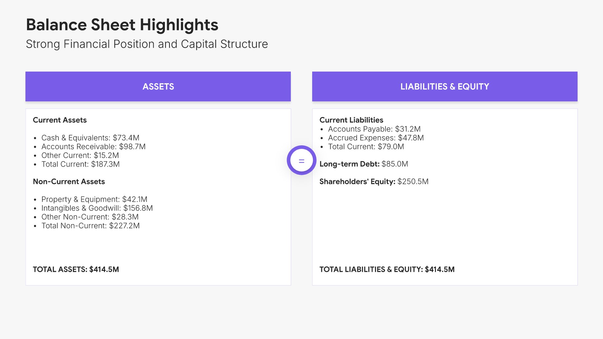 Balance sheet highlights slides help you present your financial position clearly. Use them to display assets, liabilities, and equity in a simplified format that stakeholders can quickly understand. Ideal for annual reports and board presentations where showing financial stability matters to your audience.
