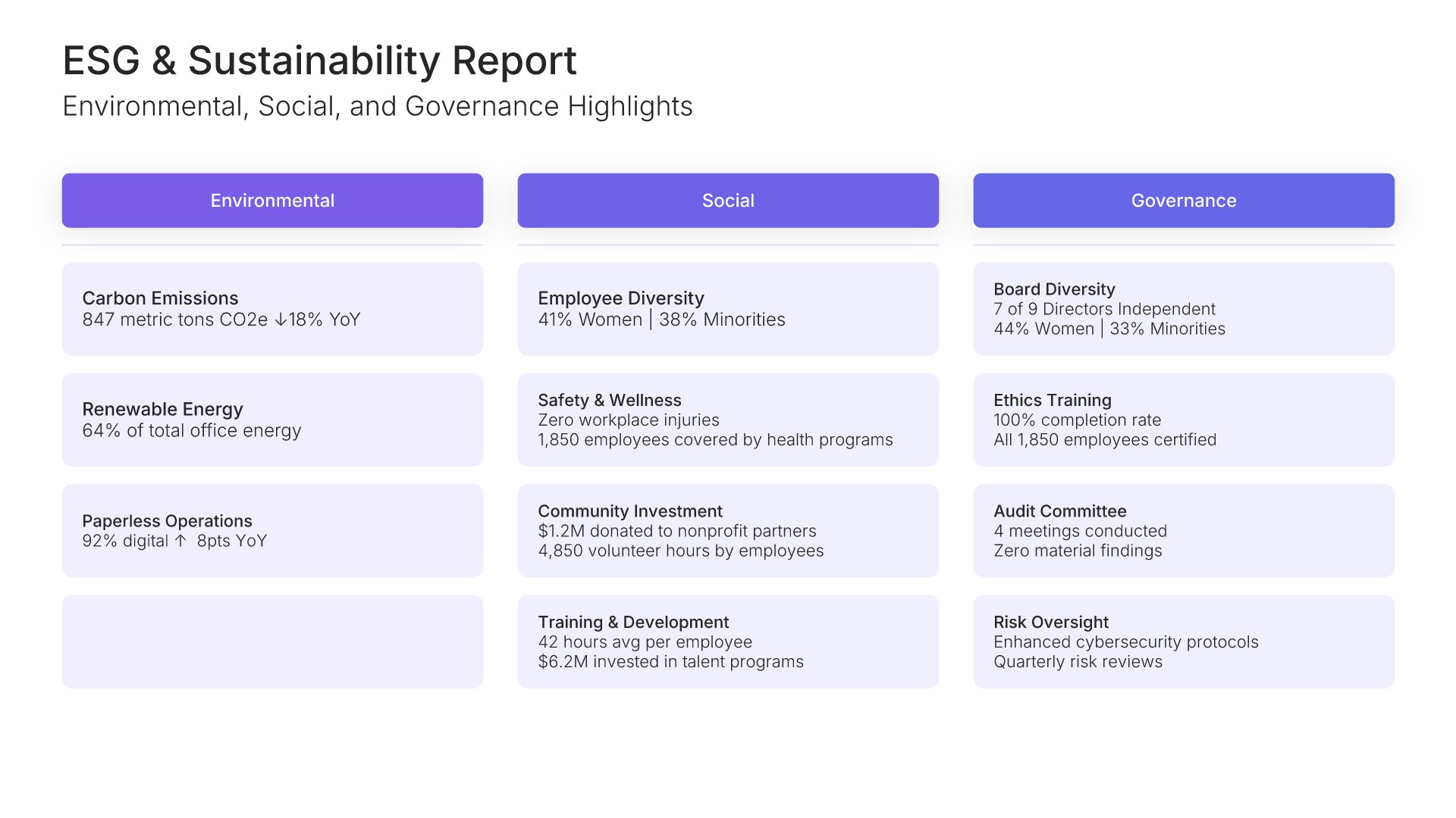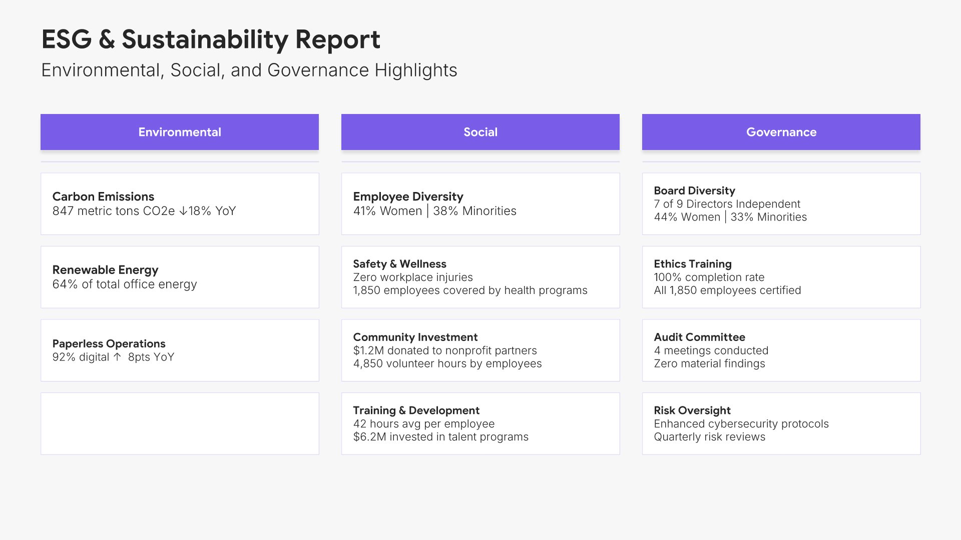 ESG and sustainability slides help you present your environmental, social, and governance commitments. Use them to display sustainability metrics, social impact, and governance practices. Ideal for annual reports and stakeholder presentations where demonstrating responsible business practices matters to your audience.