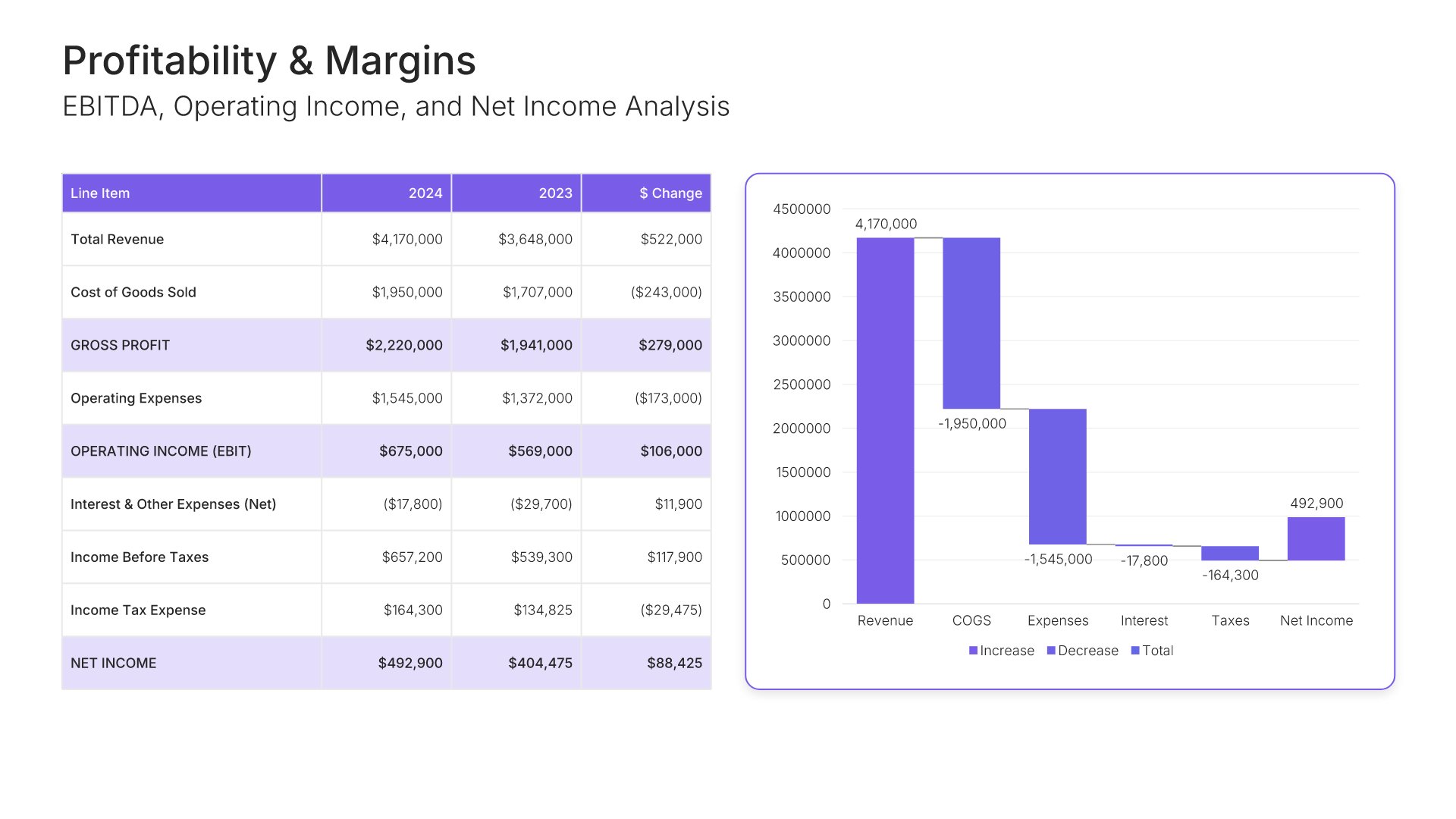 Profitability and margins slides help you present your bottom-line performance. Use them to display gross margin, operating margin, EBITDA, and net income trends. Ideal for annual reports and investor presentations where demonstrating profitability and efficiency builds confidence in financial management.