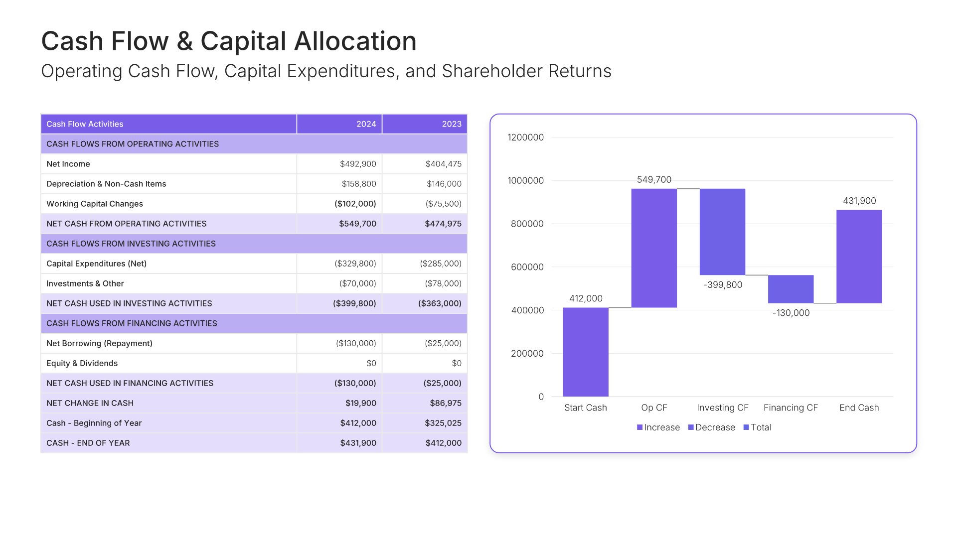 Cash flow and capital allocation slides help you show how money moves through your organization. Use them to present operating cash flow, investments, dividends, and how capital is deployed. Ideal for annual reports and investor presentations where demonstrating cash management builds stakeholder confidence.
