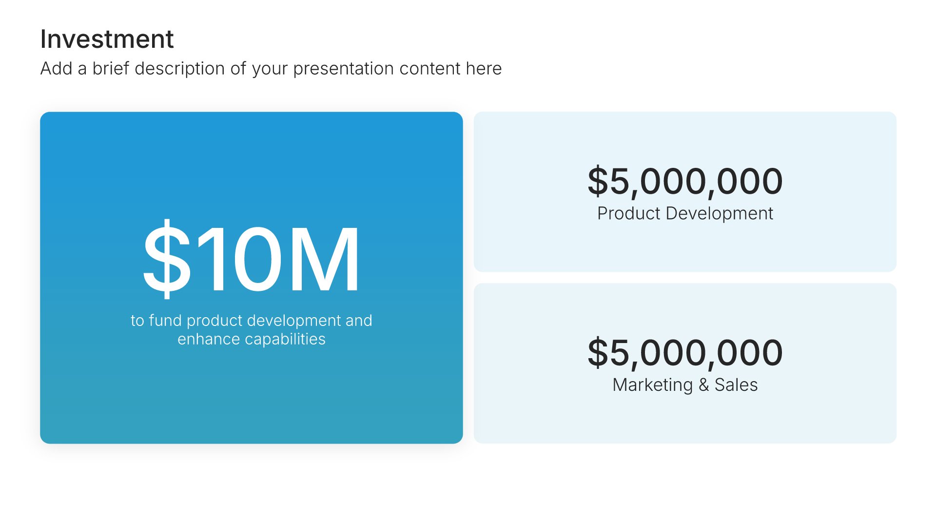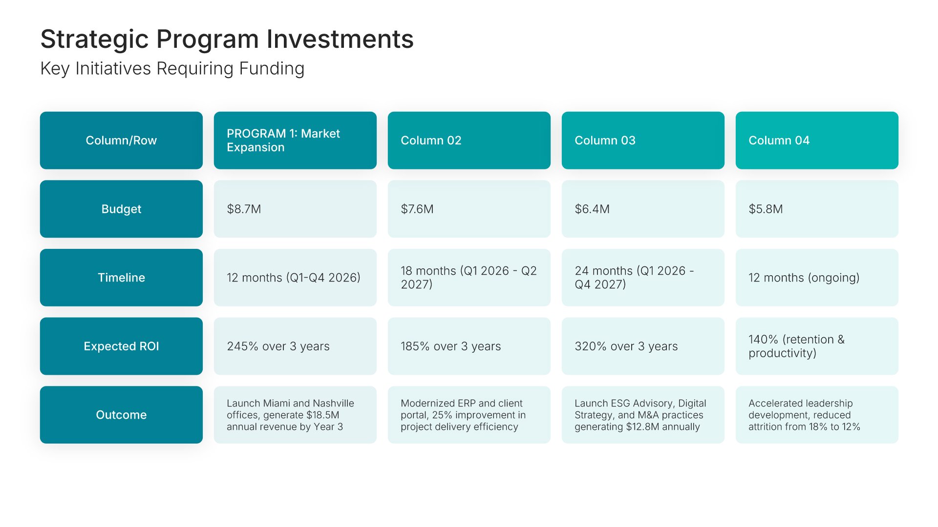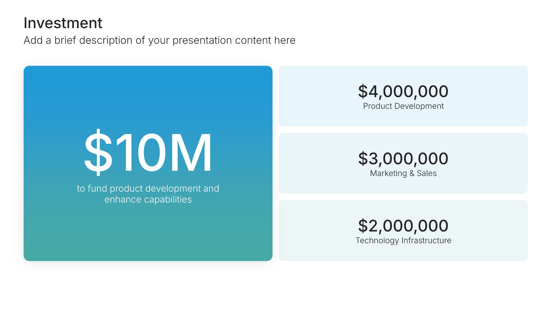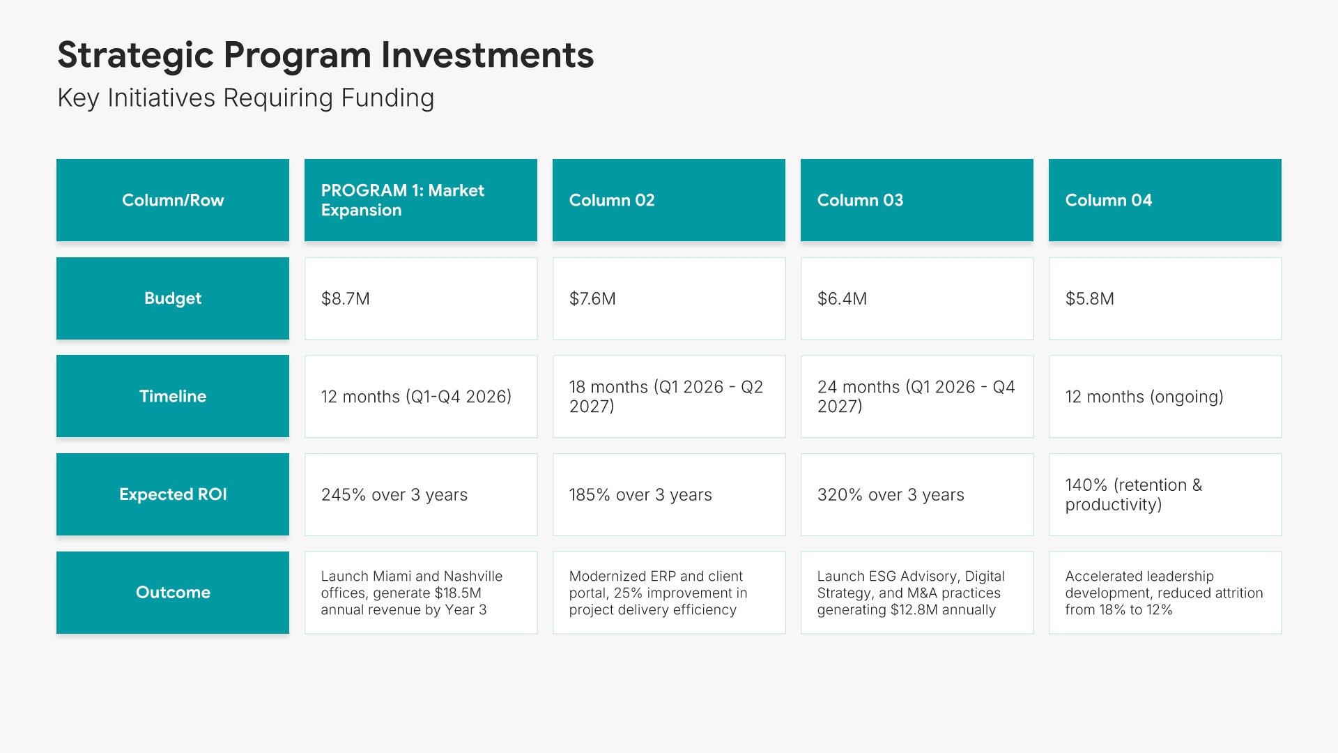 Strategic program investments slides help you present funding for key initiatives and projects. Use them to display the programs that will drive growth, transformation, or improvement. Ideal for budget proposals and strategic plans where showing how investments connect to outcomes builds the case for approval.