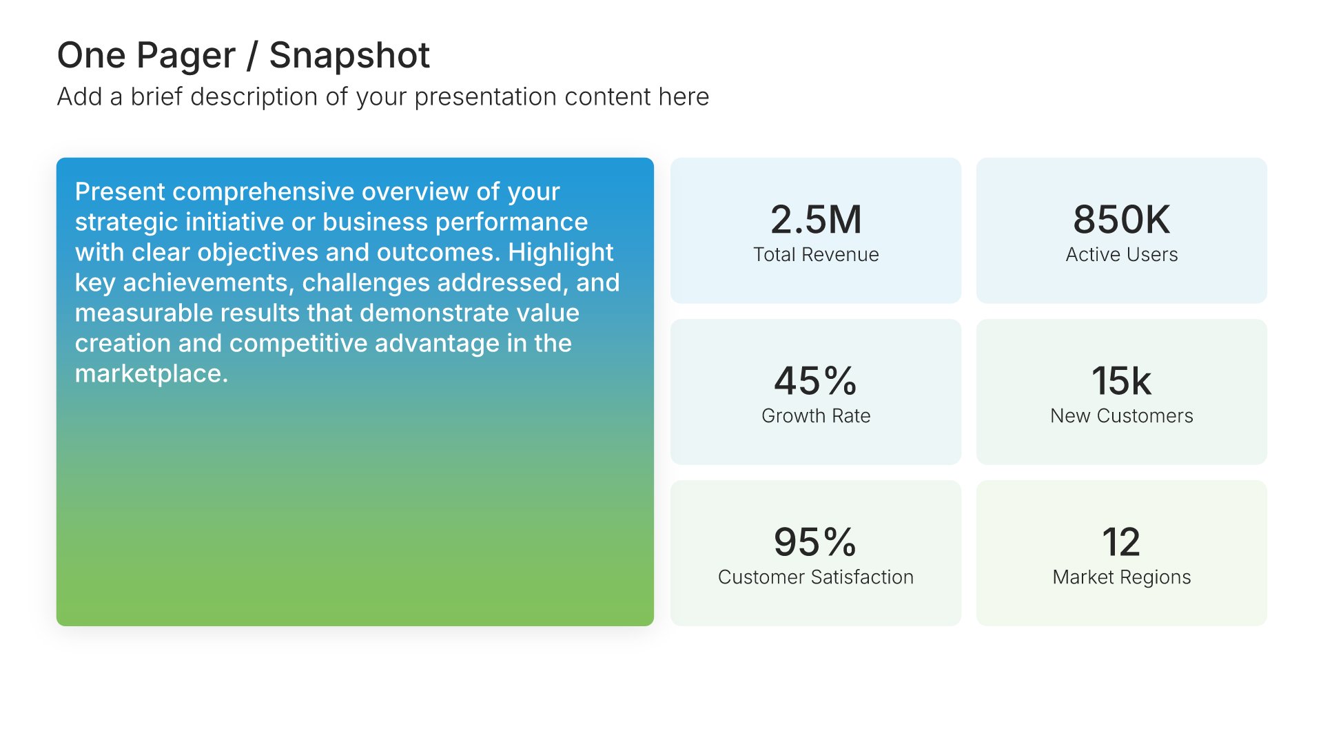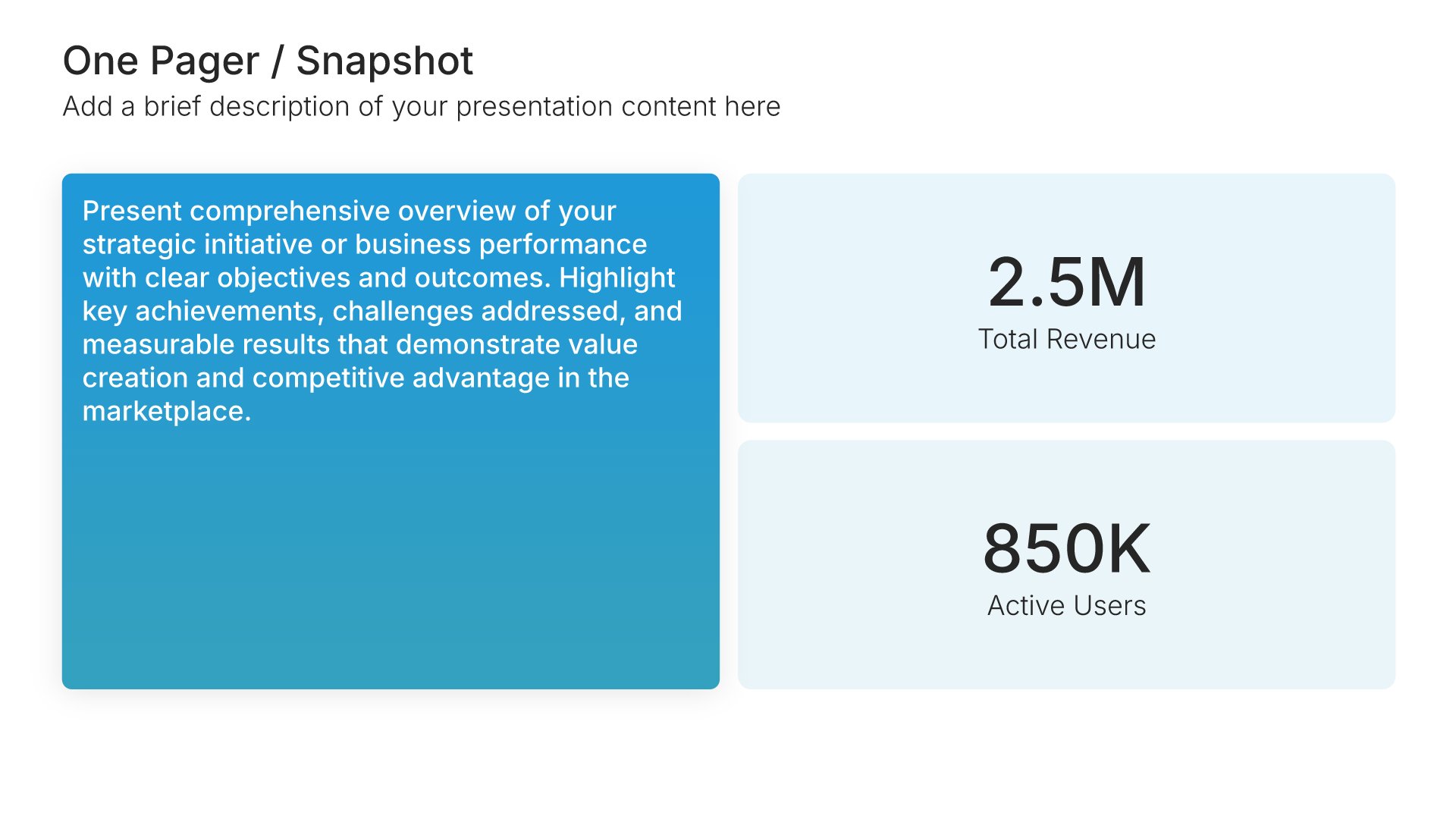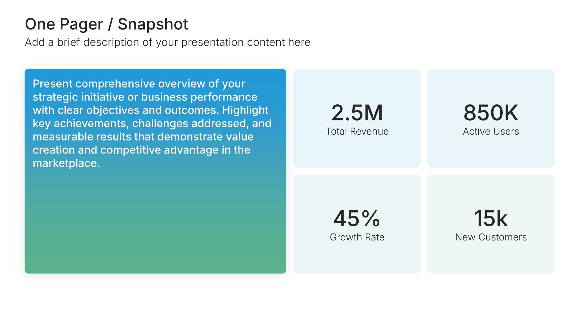 Executive summary slides help you present key points concisely for busy stakeholders. Use them to distill complex information into clear highlights, recommendations, and conclusions that can be understood at a glance. Ideal for board presentations, project updates, and any situation where decision-makers need the essential takeaways fast.