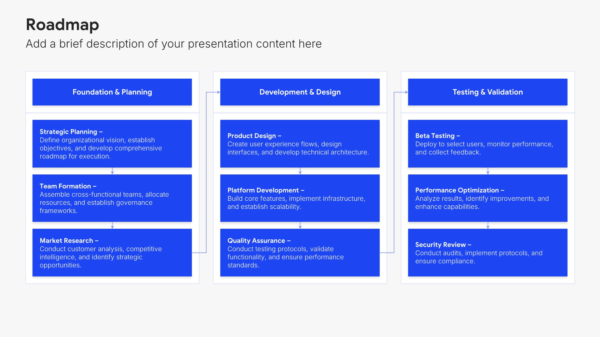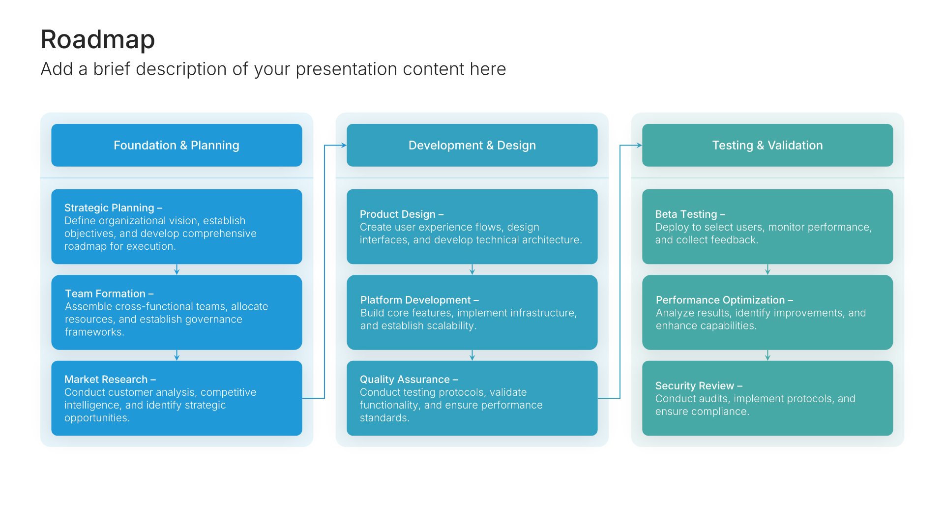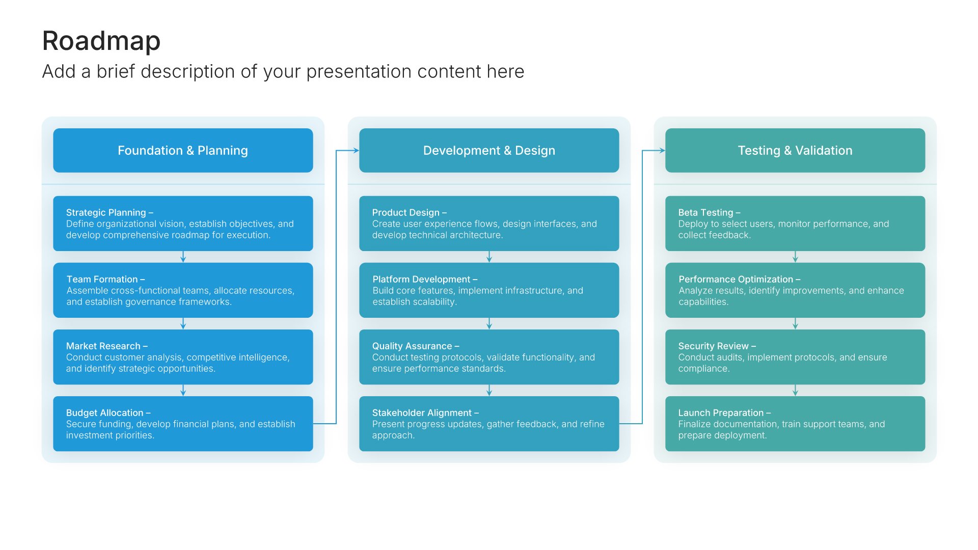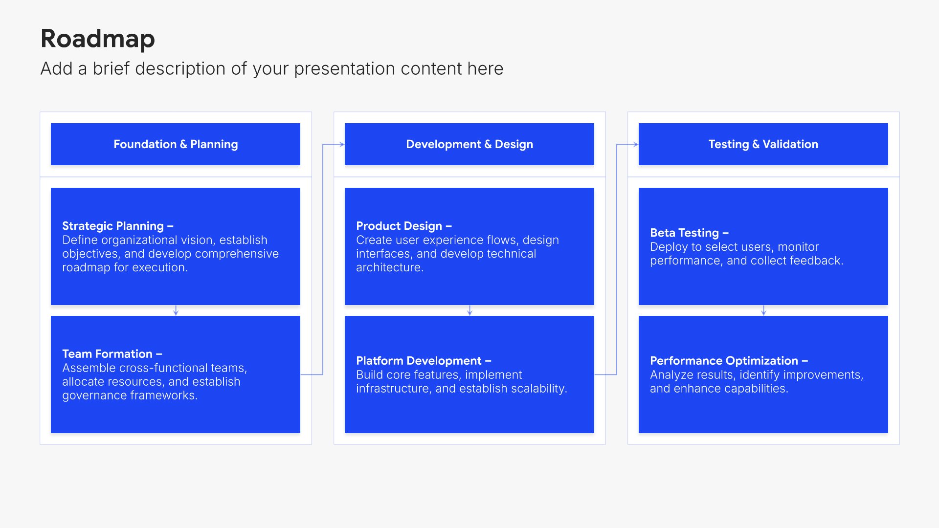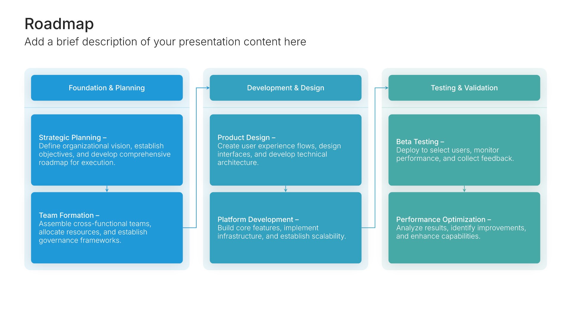 Timeline slides help you show events and milestones over time in clear chronological formats. Use them to display project phases, company history, product roadmaps, and key dates. Ideal for project planning, historical overviews, and any presentation where showing how things unfold over time tells a compelling story.
