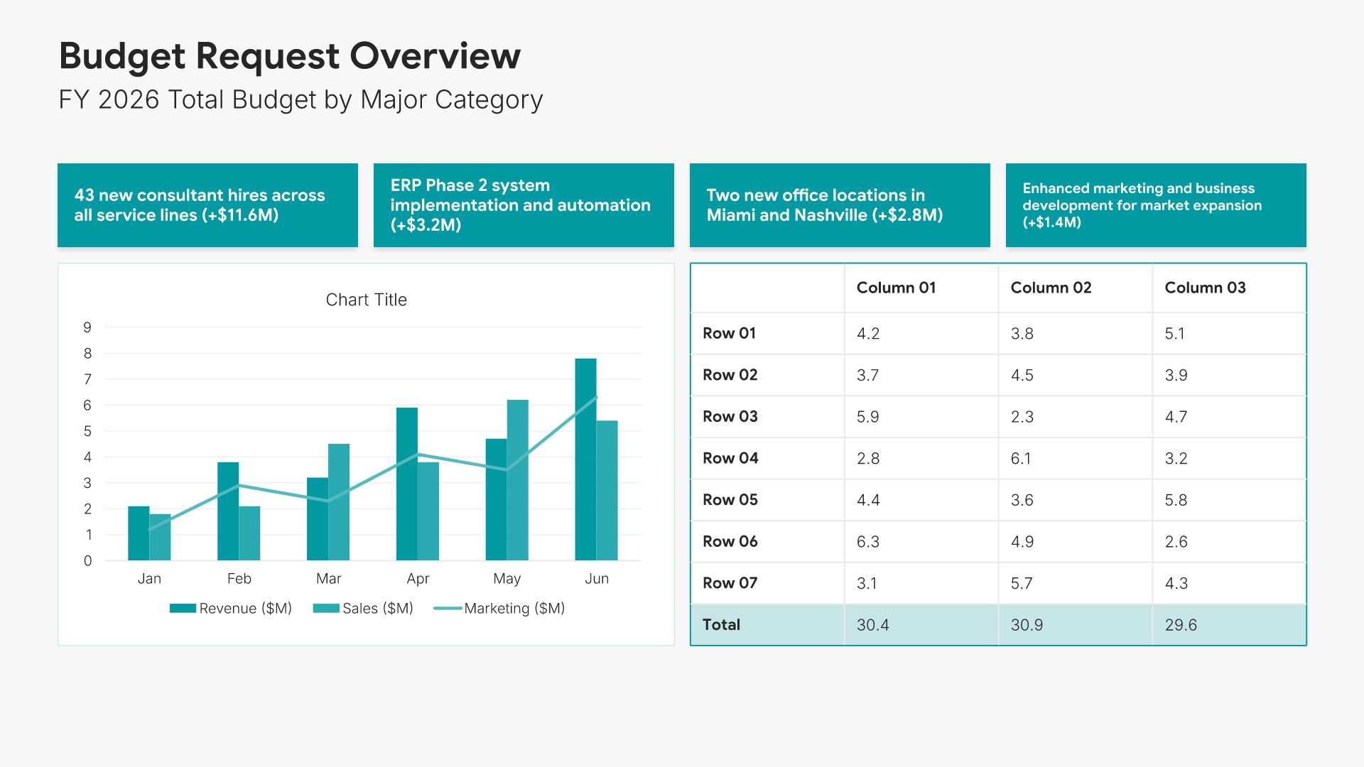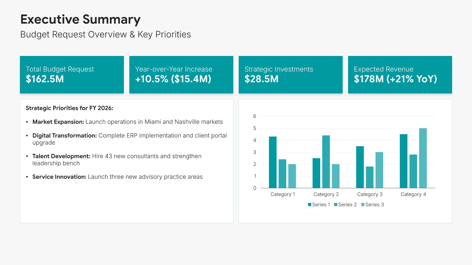 Year-over-year comparison slides help you show how your budget request compares to previous periods. Use them to display changes, trends, and variances that explain increases or decreases. Ideal for budget proposals and financial reviews where context from prior years helps stakeholders understand your current request.