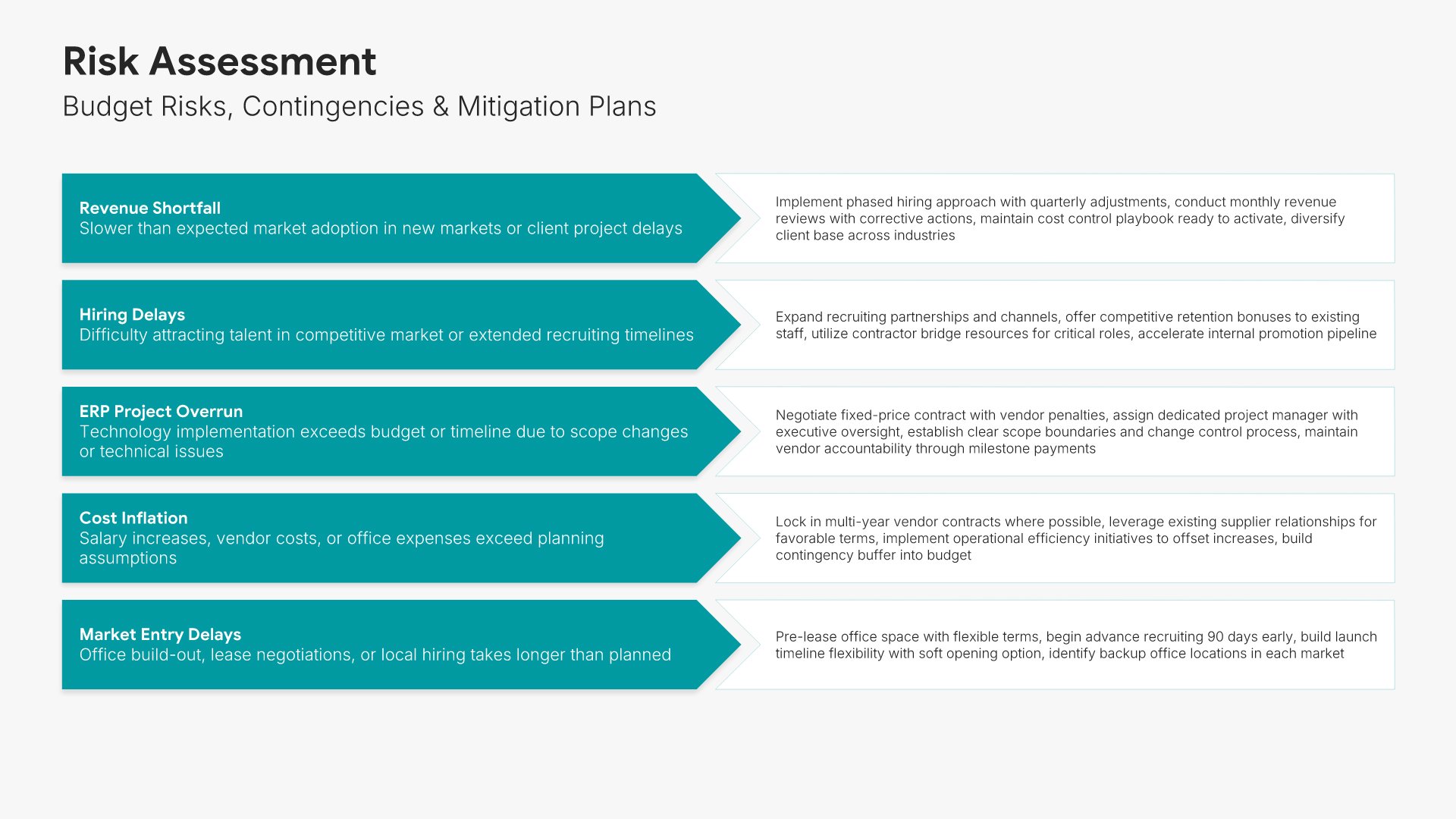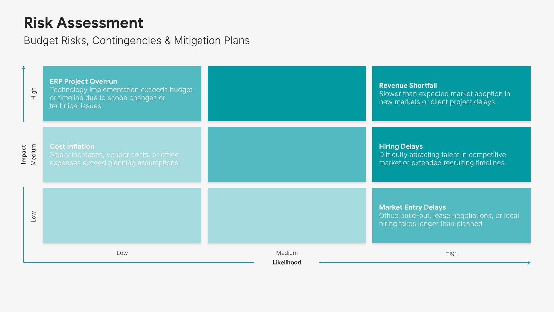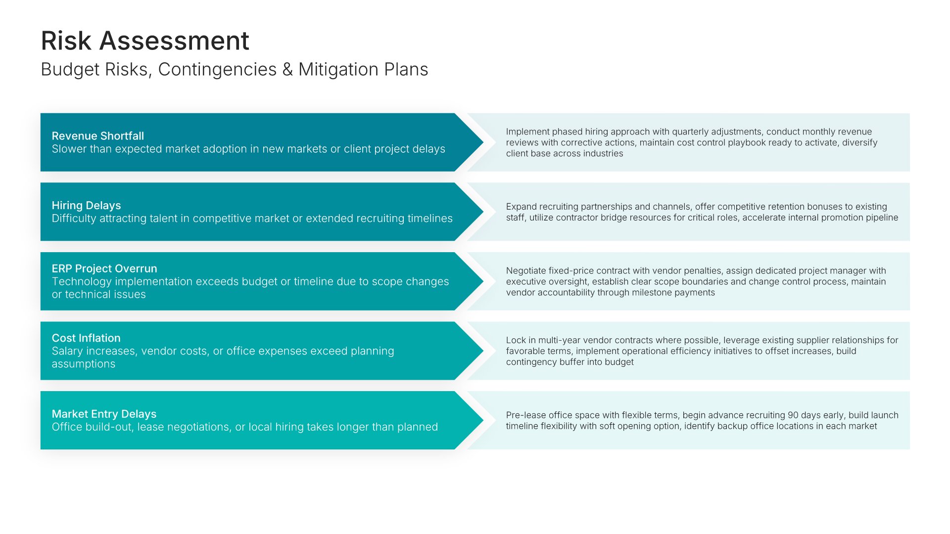 Risk assessment slides help you identify potential challenges and mitigation strategies. Use them to present risks that could impact your budget, along with contingency plans and safeguards. Ideal for budget proposals and business cases where acknowledging risks and showing preparedness builds stakeholder confidence.