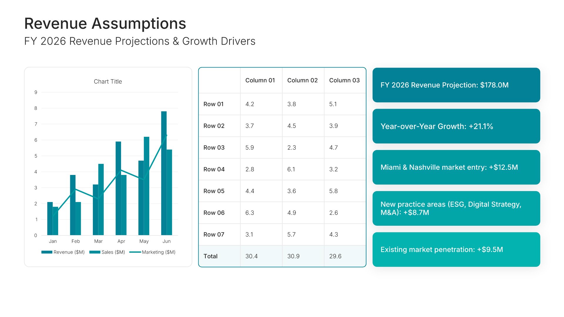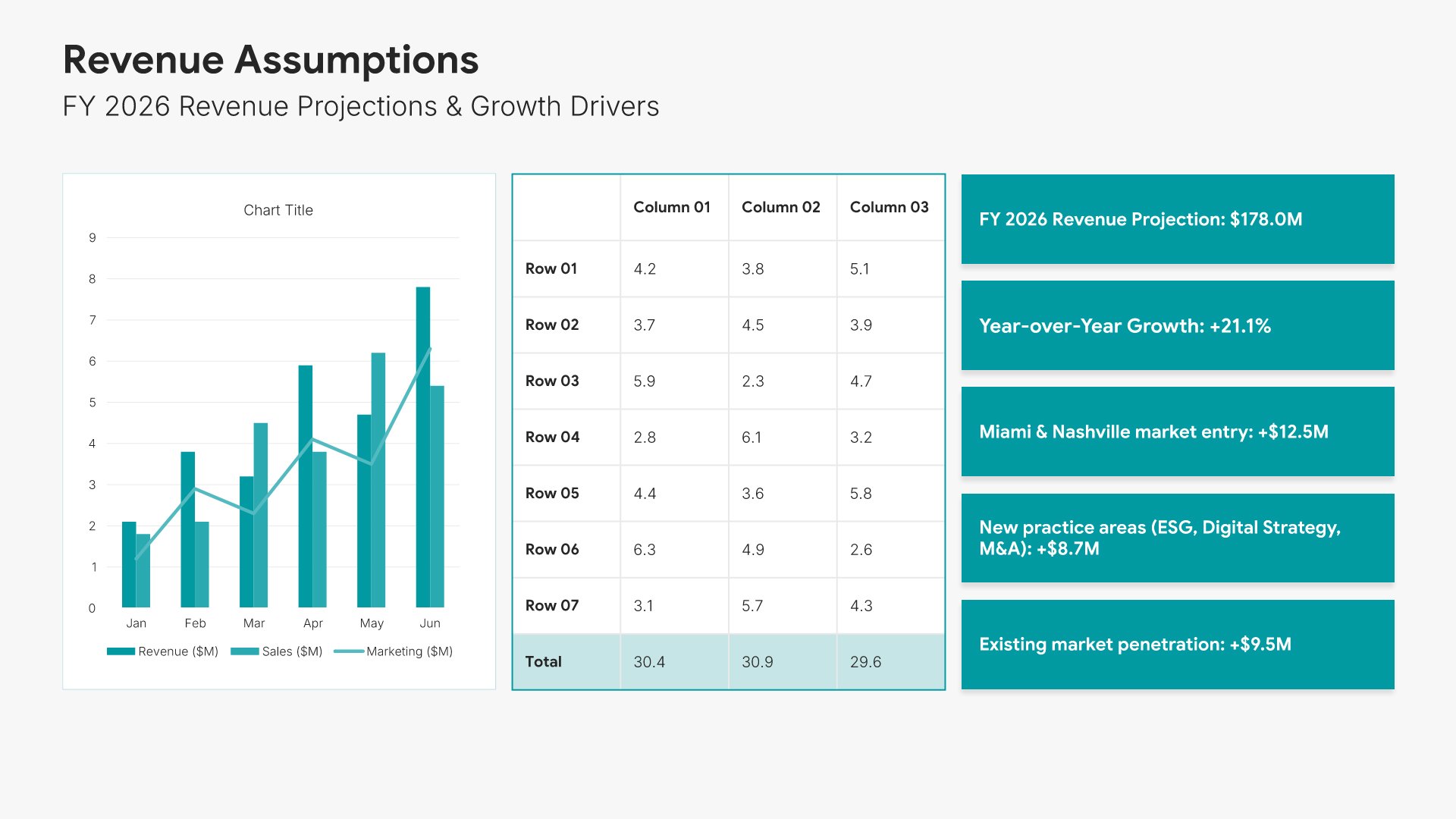 Revenue assumptions slides help you present the income projections underlying your budget. Use them to display expected revenue sources, growth rates, and the key assumptions driving your forecasts. Ideal for budget proposals and financial planning where transparent assumptions build confidence in your projections.