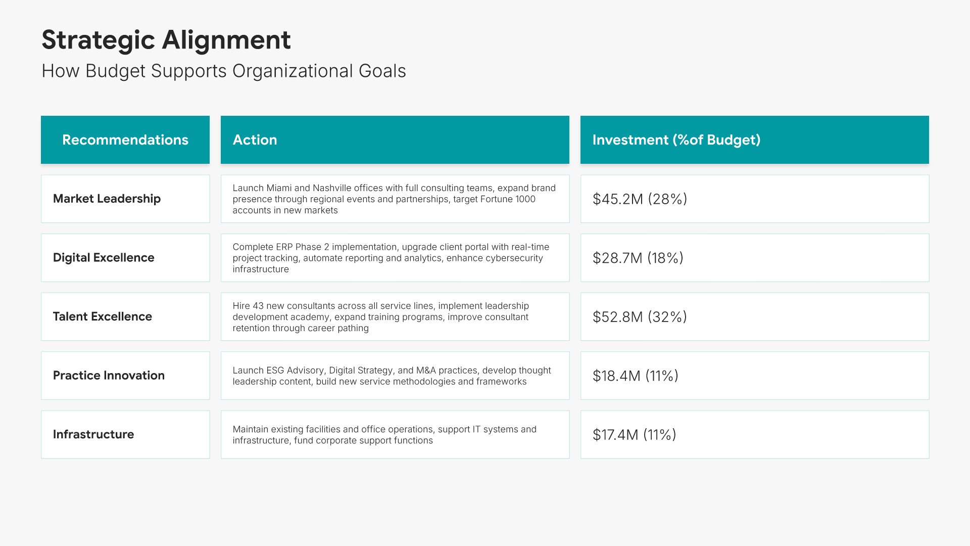 Strategic alignment slides help you connect your budget request to organizational priorities. Use them to show how proposed spending supports strategic goals, initiatives, and long-term objectives. Ideal for budget proposals and business cases where linking financial requests to strategy strengthens your case for approval.