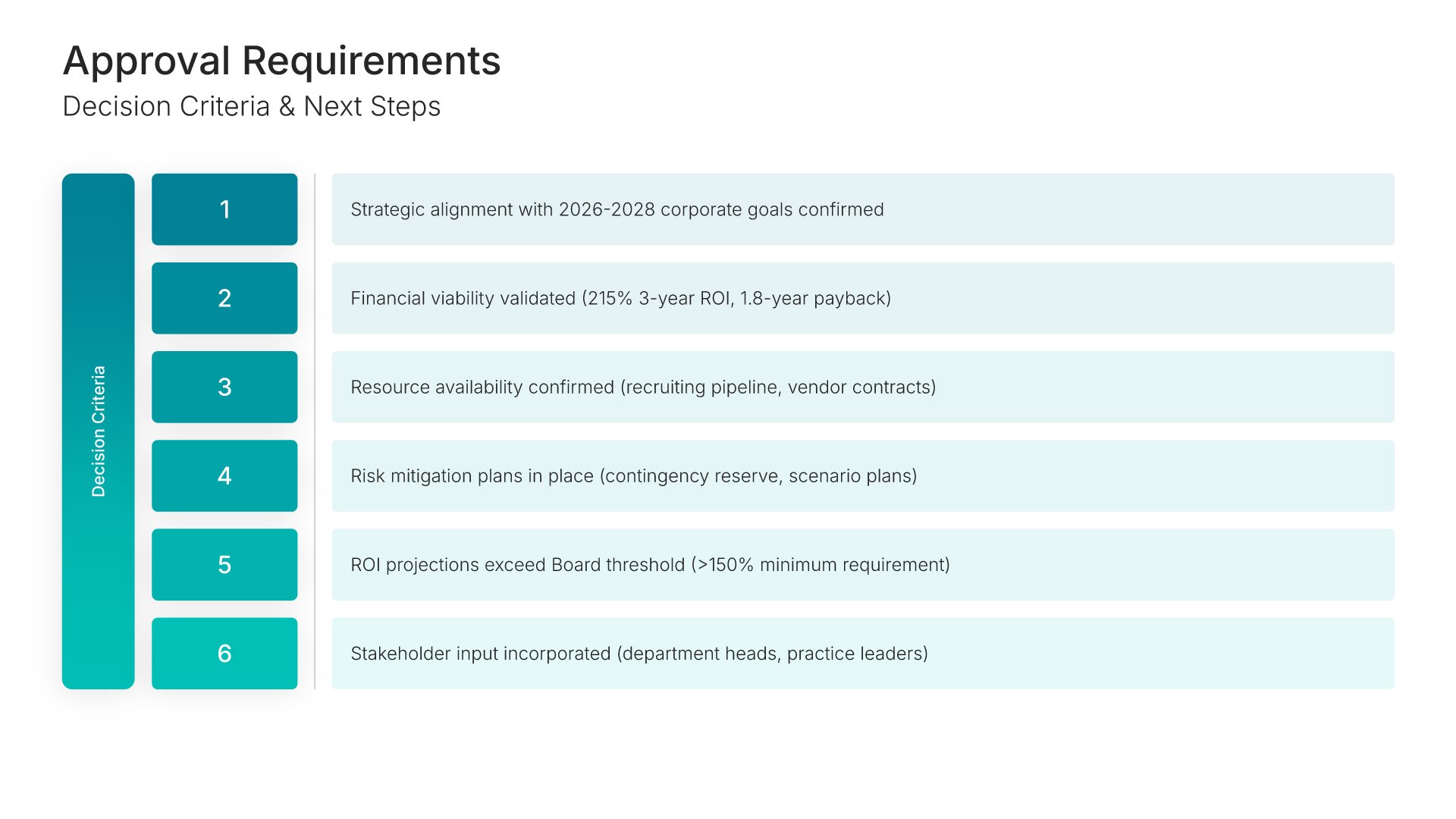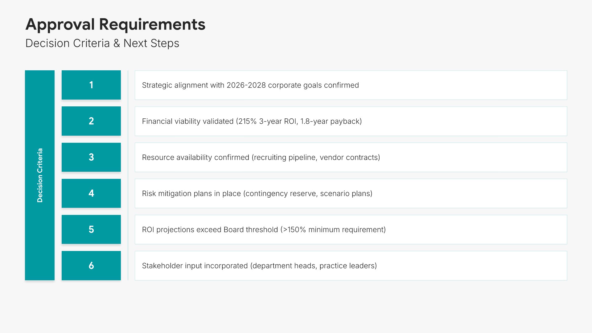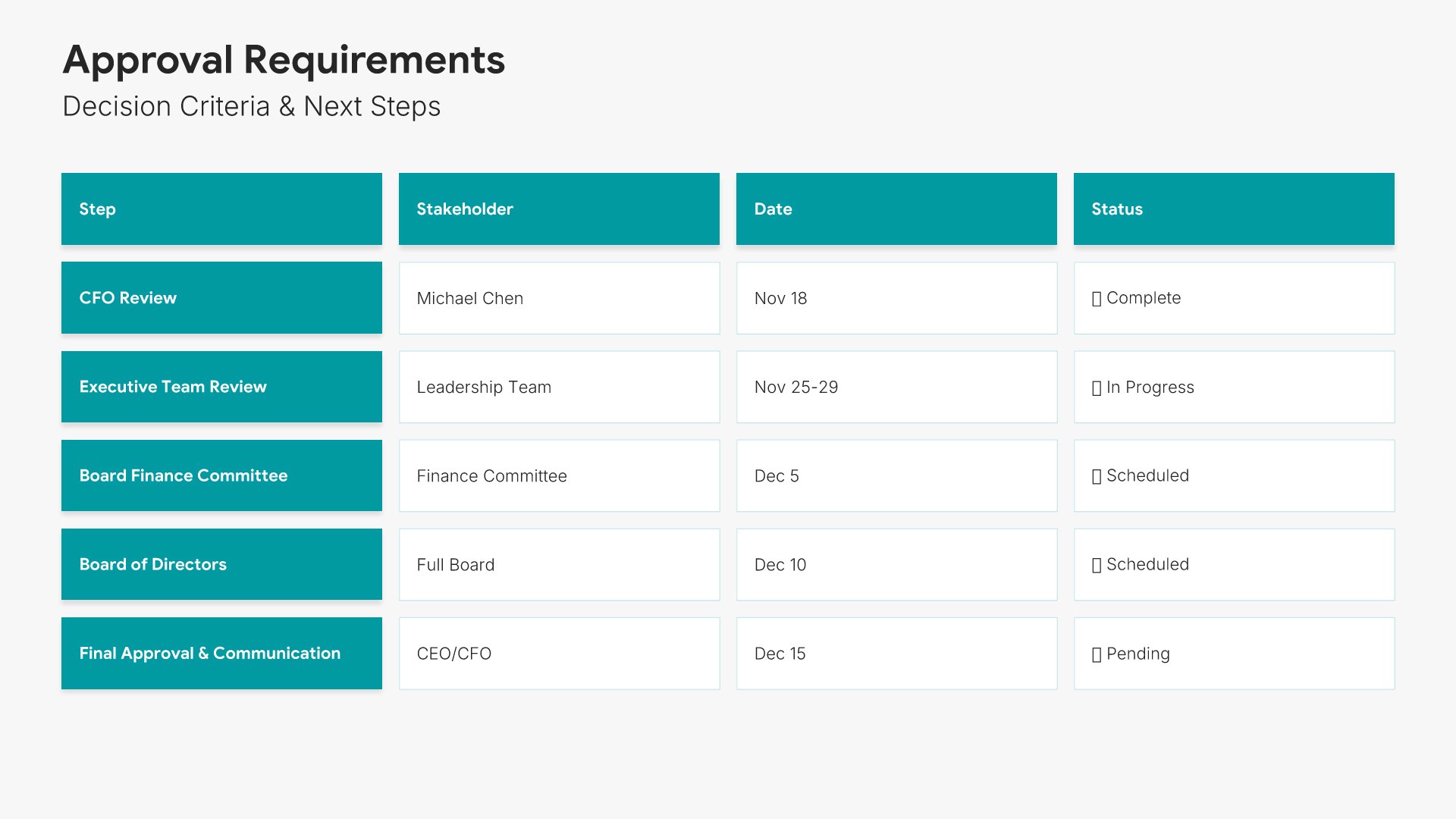 Approval requirements slides help you outline what's needed to move forward. Use them to present the decisions, signatures, and authorizations required from stakeholders. Ideal for budget proposals and project requests where clearly stating what you need from your audience drives the approval process forward.