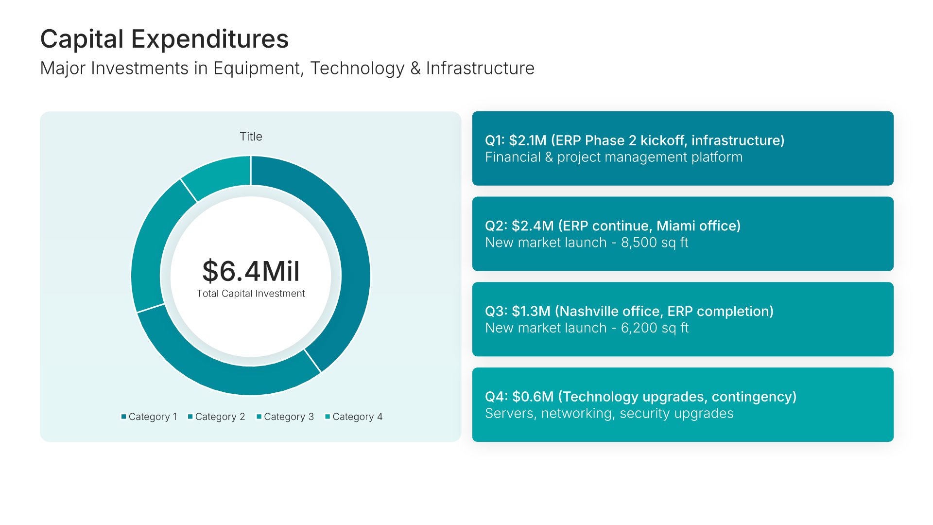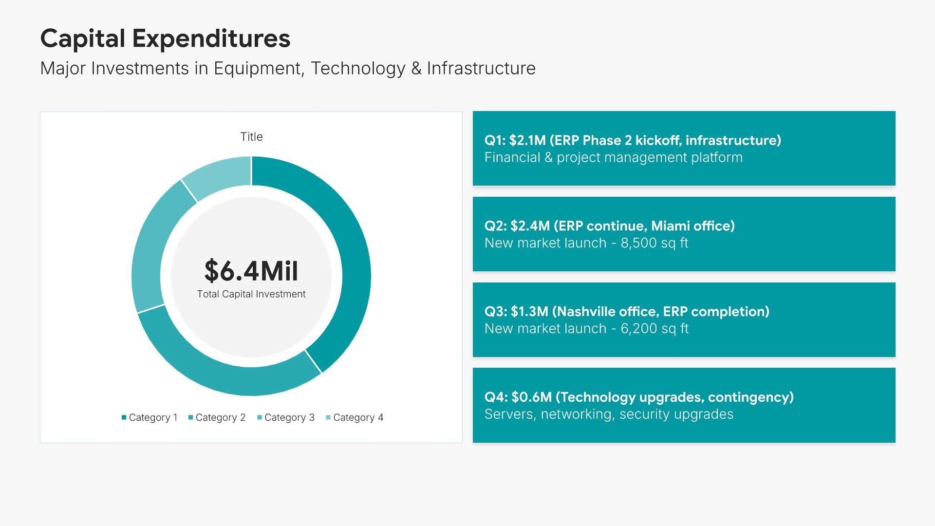 Capital expenditures slides help you present major asset investments in your budget. Use them to display equipment, technology, facilities, and other significant purchases requiring approval. Ideal for budget proposals and financial planning where justifying large investments requires clear presentation of costs and benefits.
