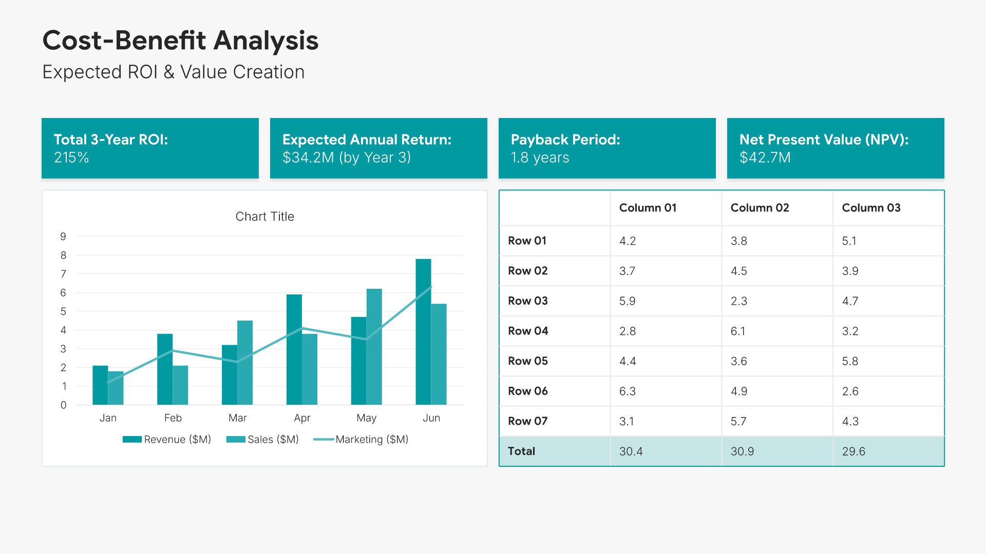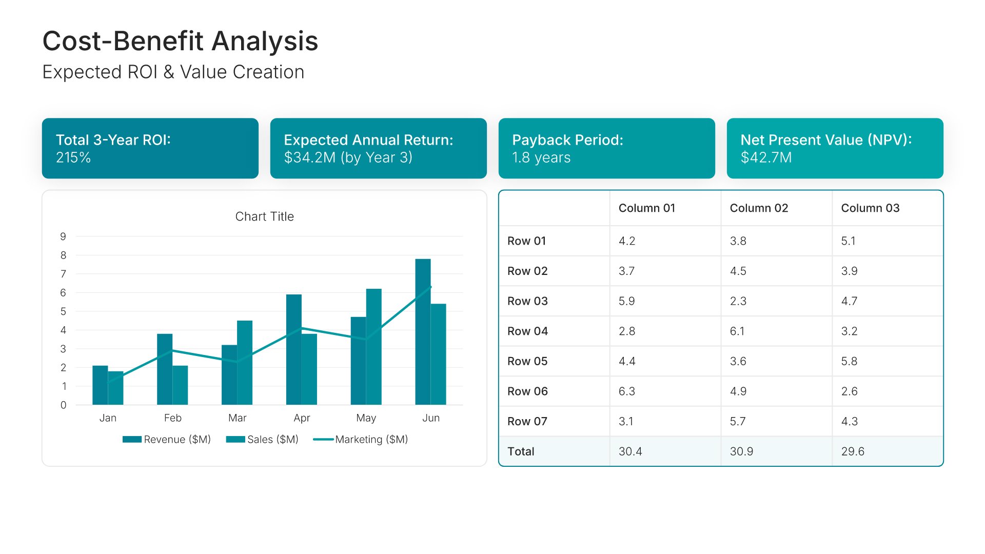 Cost-benefit analysis slides help you present the value your budget request will deliver. Use them to compare costs against expected returns, savings, or strategic benefits. Ideal for budget proposals and business cases where demonstrating positive ROI or clear value justifies the investment you're requesting.