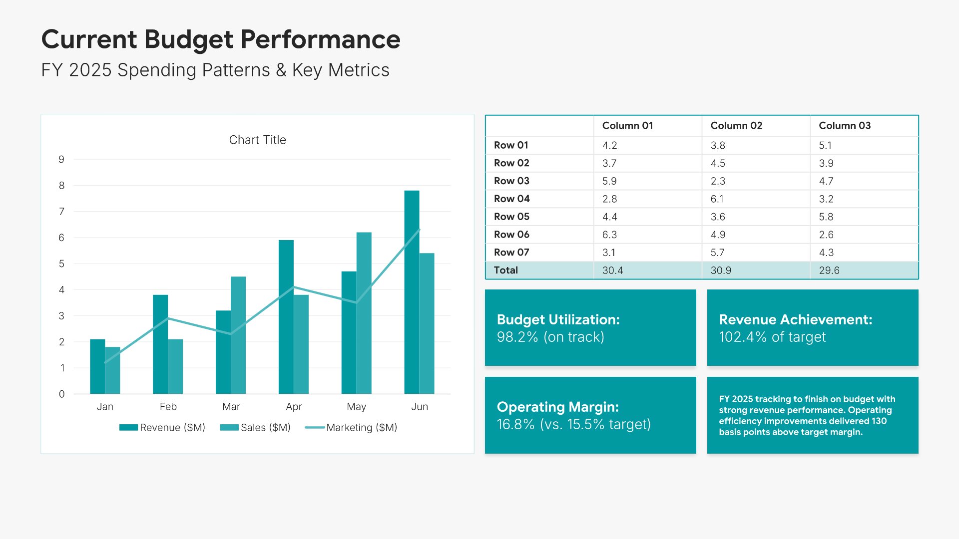 Current budget performance slides help you present how your existing budget has been utilized. Use them to show actual versus planned spending, variances, and key performance outcomes. Ideal for budget proposals and financial reviews where demonstrating accountability for past resources builds credibility for future requests.