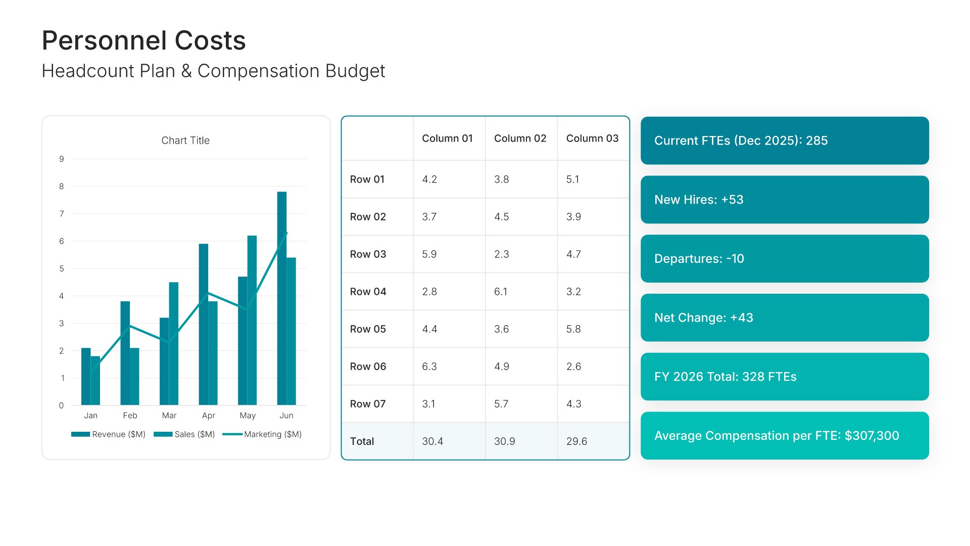 Personnel costs slides help you present the staffing investment in your budget. Use them to display salaries, benefits, headcount changes, and workforce-related expenses. Ideal for budget proposals and HR planning where showing people investment as part of your financial plan justifies talent-related spending.