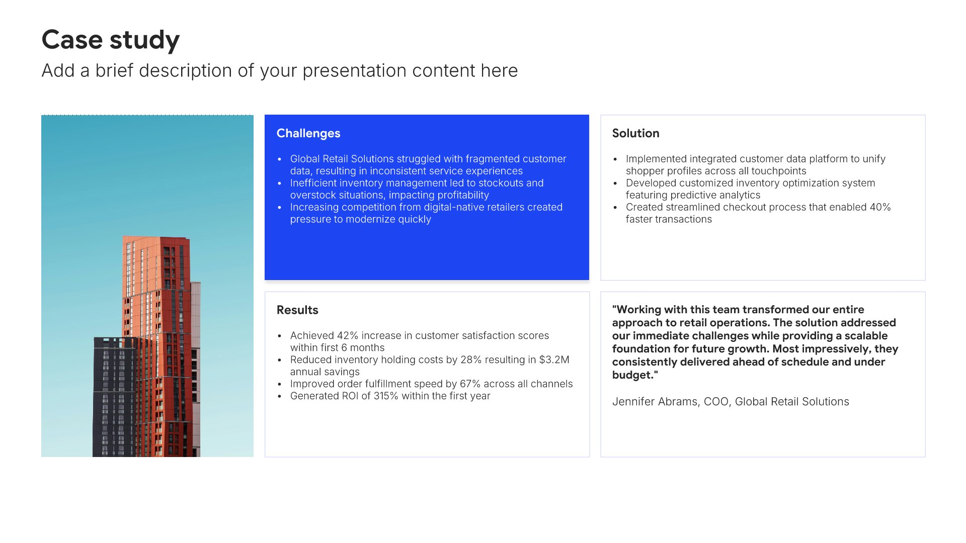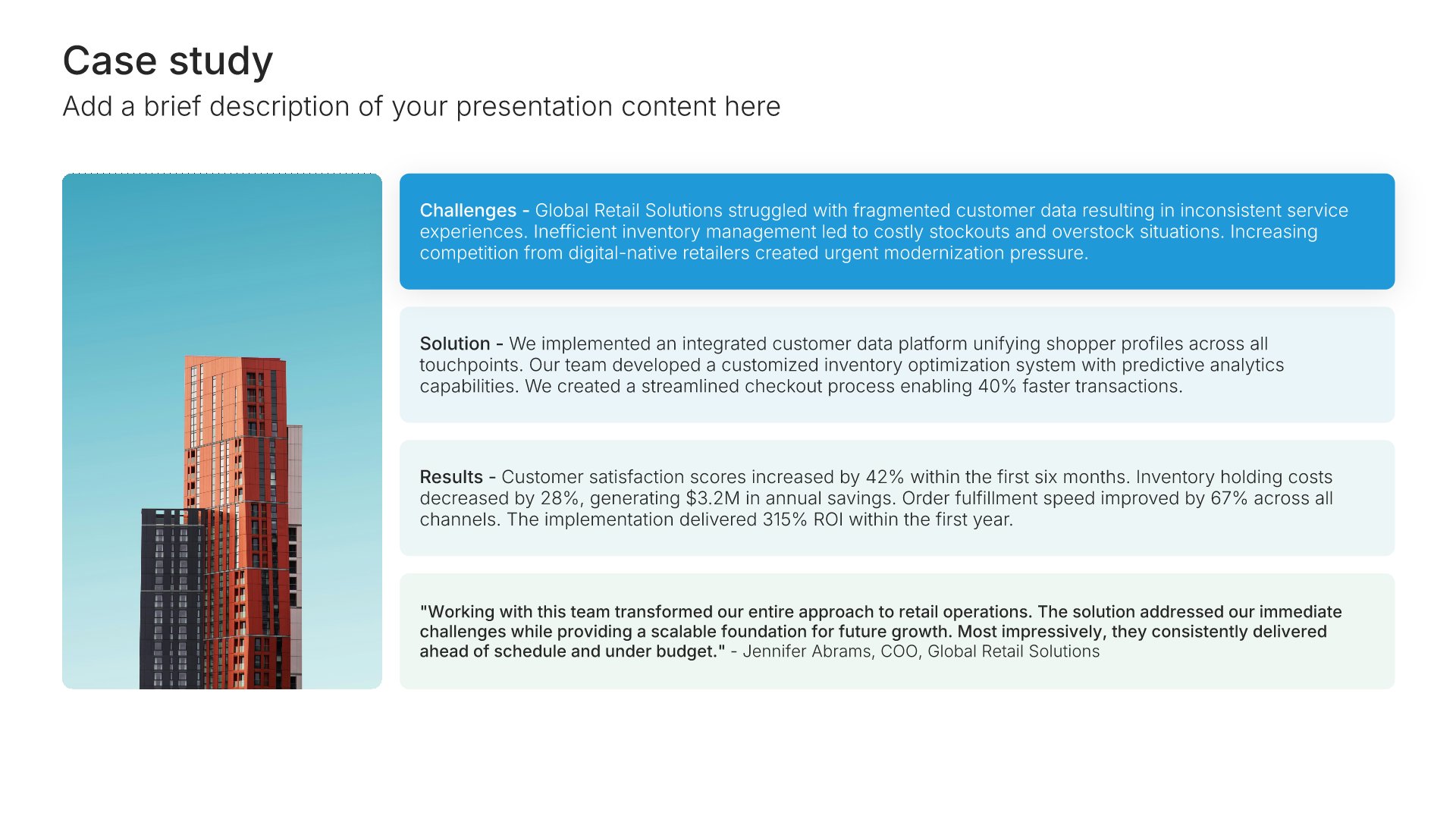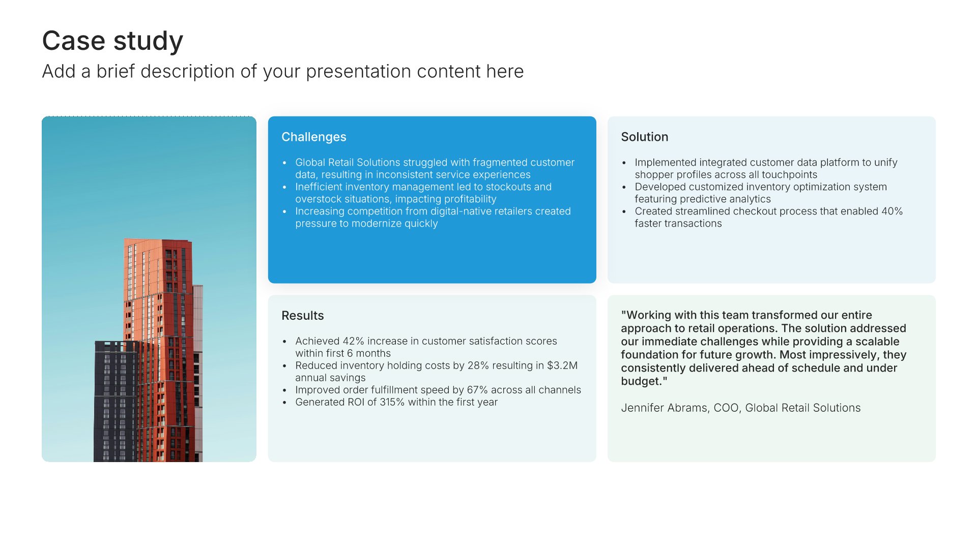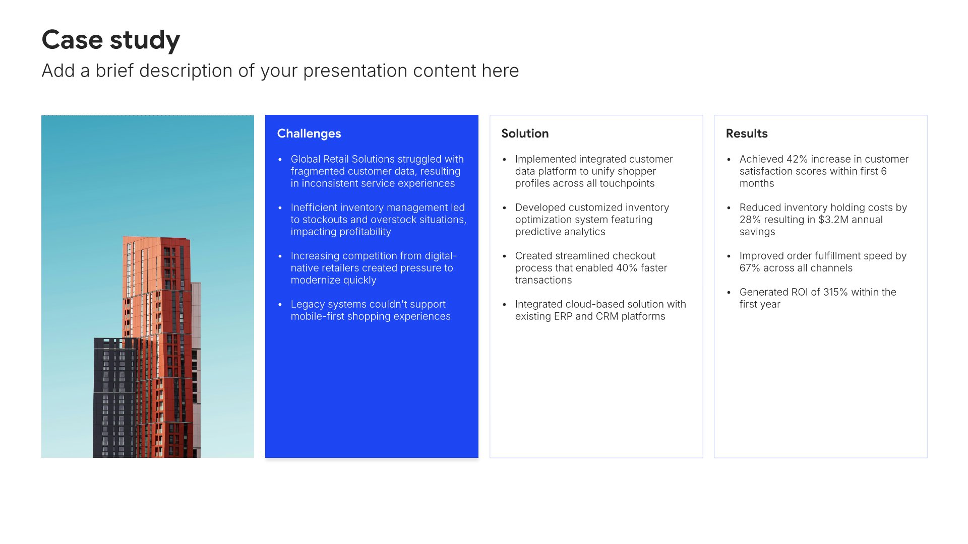 Replace text and image placeholders with your content effortlessly. Customize using tools like Powerpoint, Google Slides, or Keynote and present proudly.