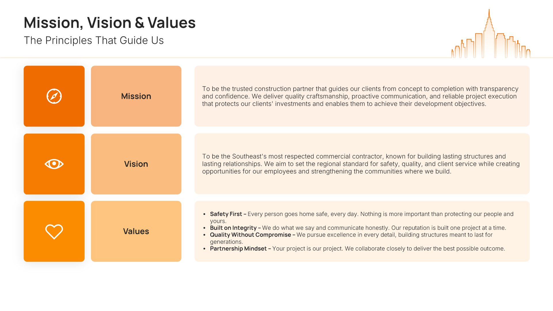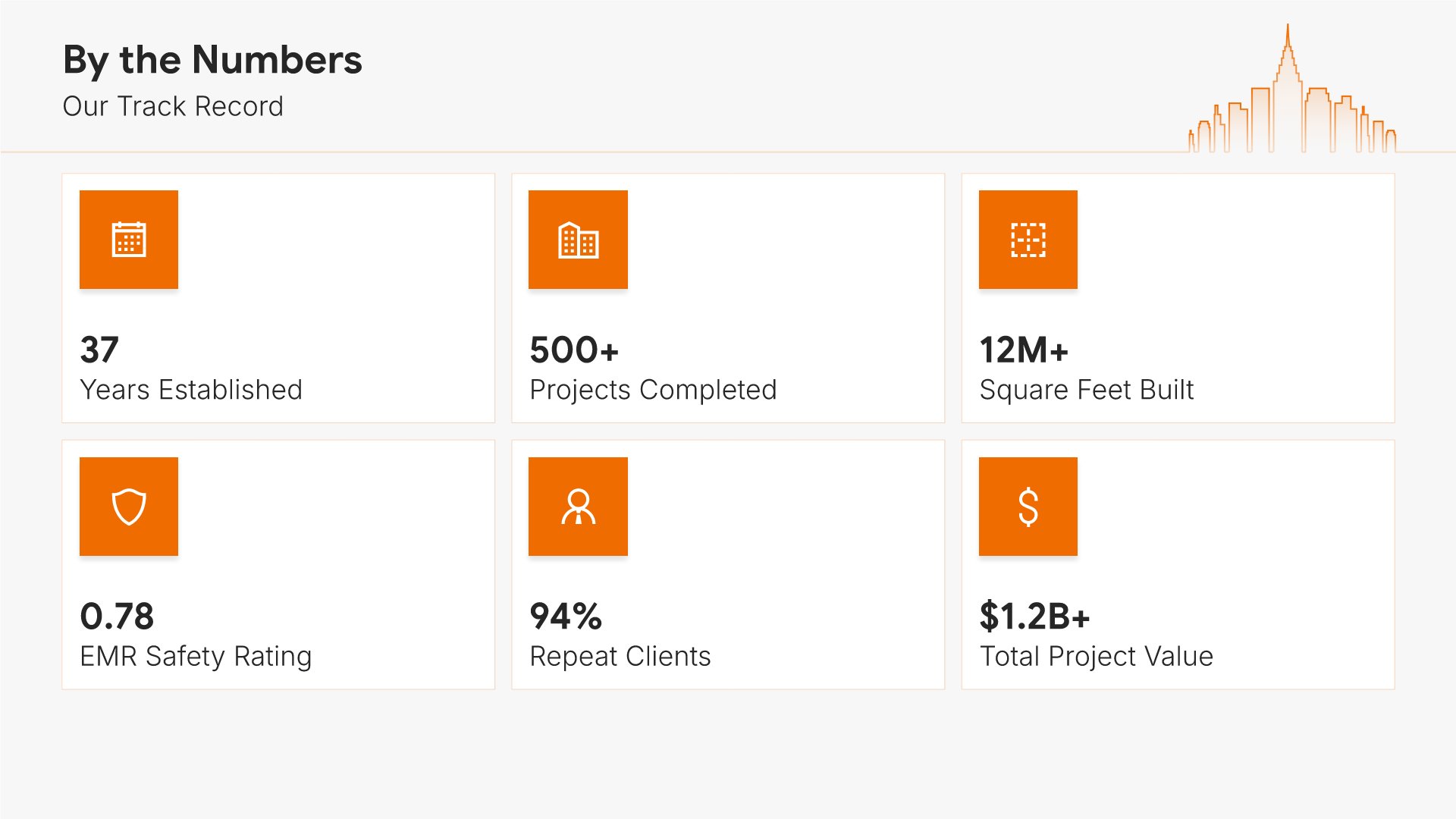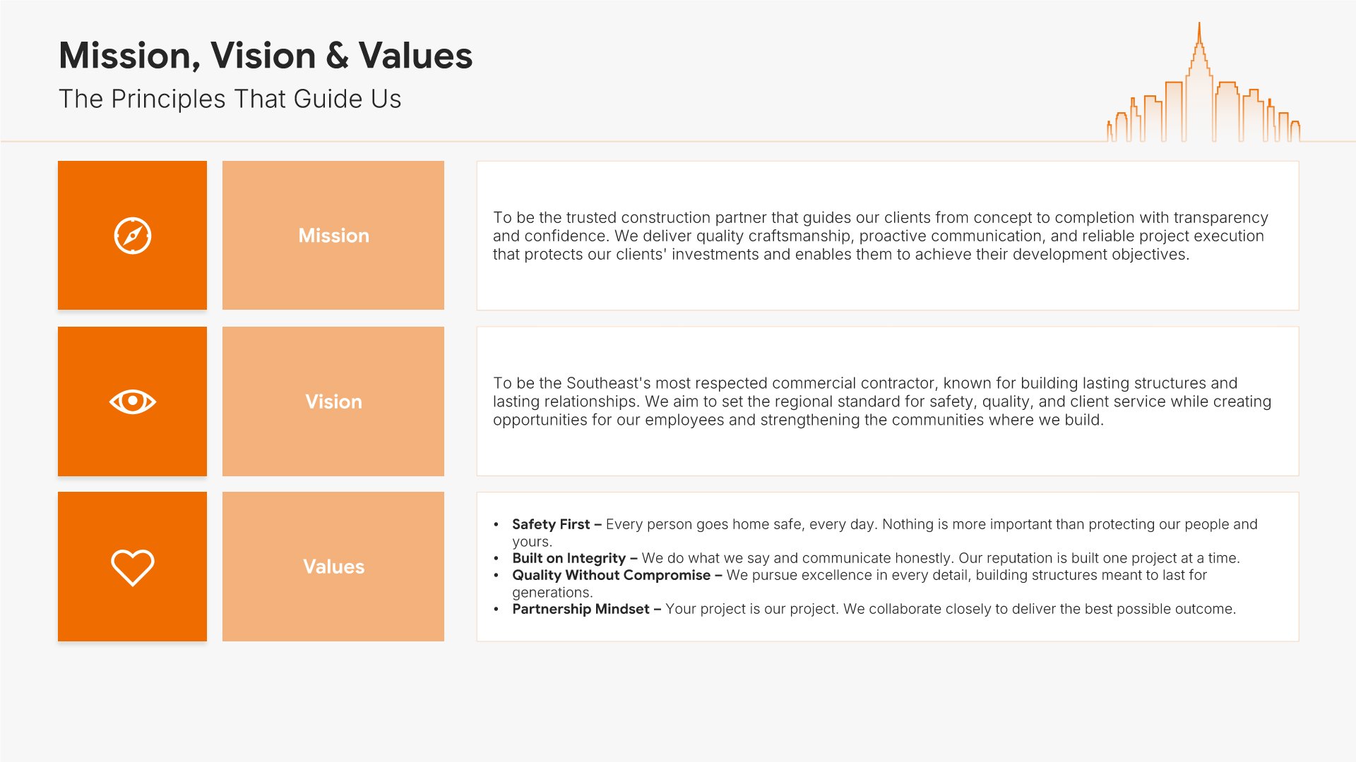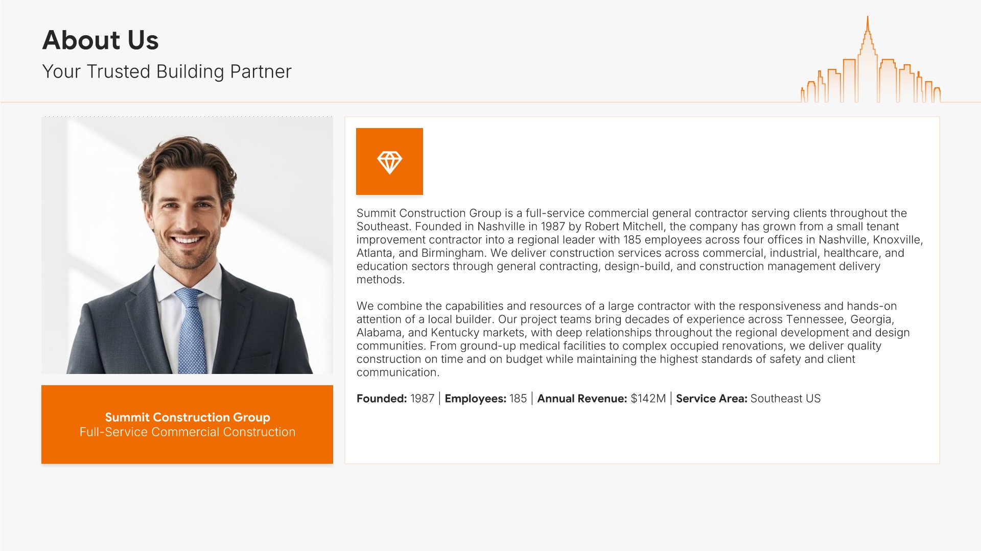 A professionally structured construction company profile template following the Universal Company Profile framework adapted for contractors and builders. Built for construction firms showcasing their capabilities to clients, developers, and partners. Covers company history, services, methodology, safety record, team credentials, and testimonials.