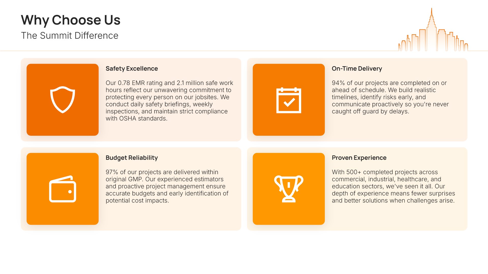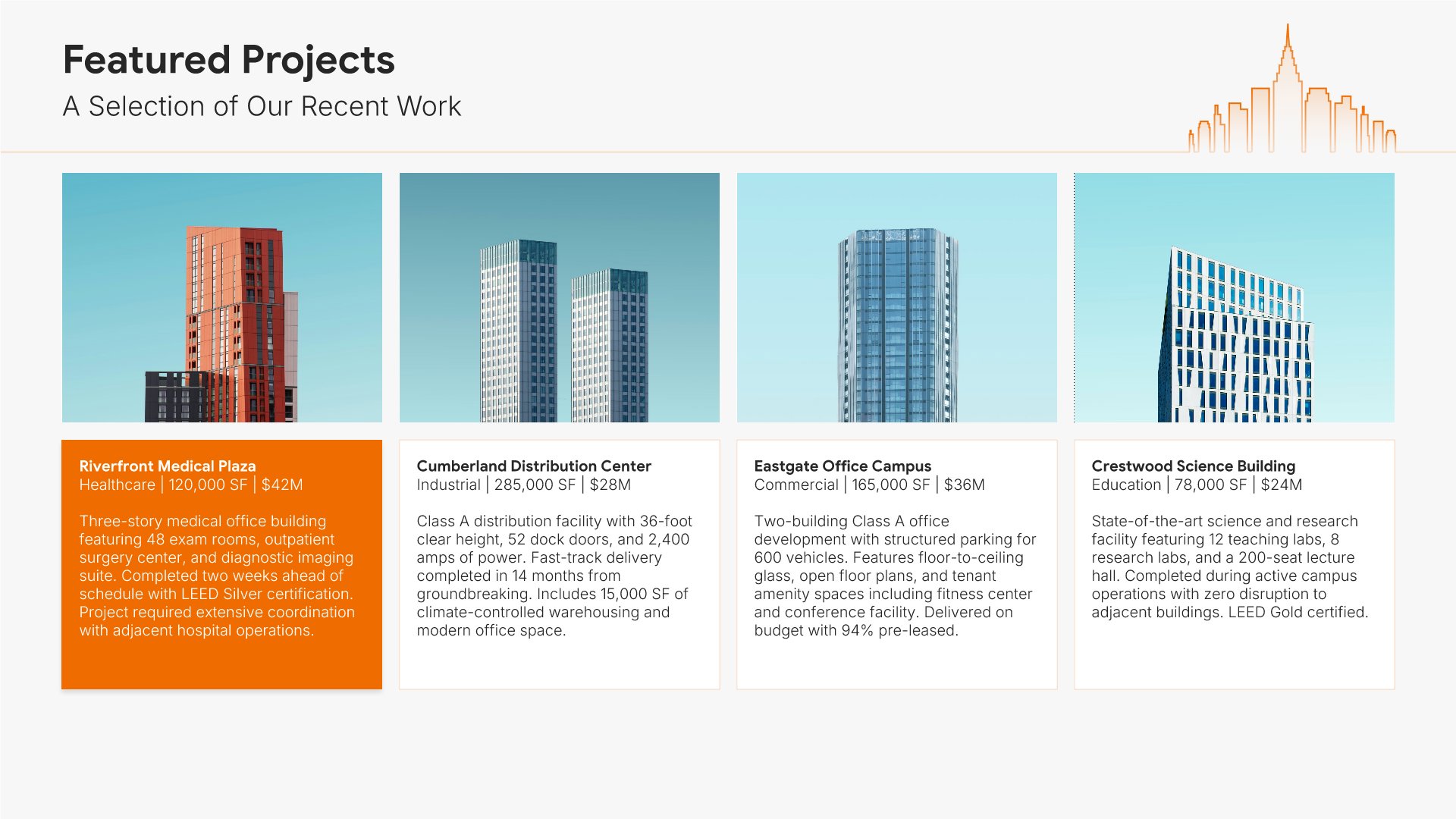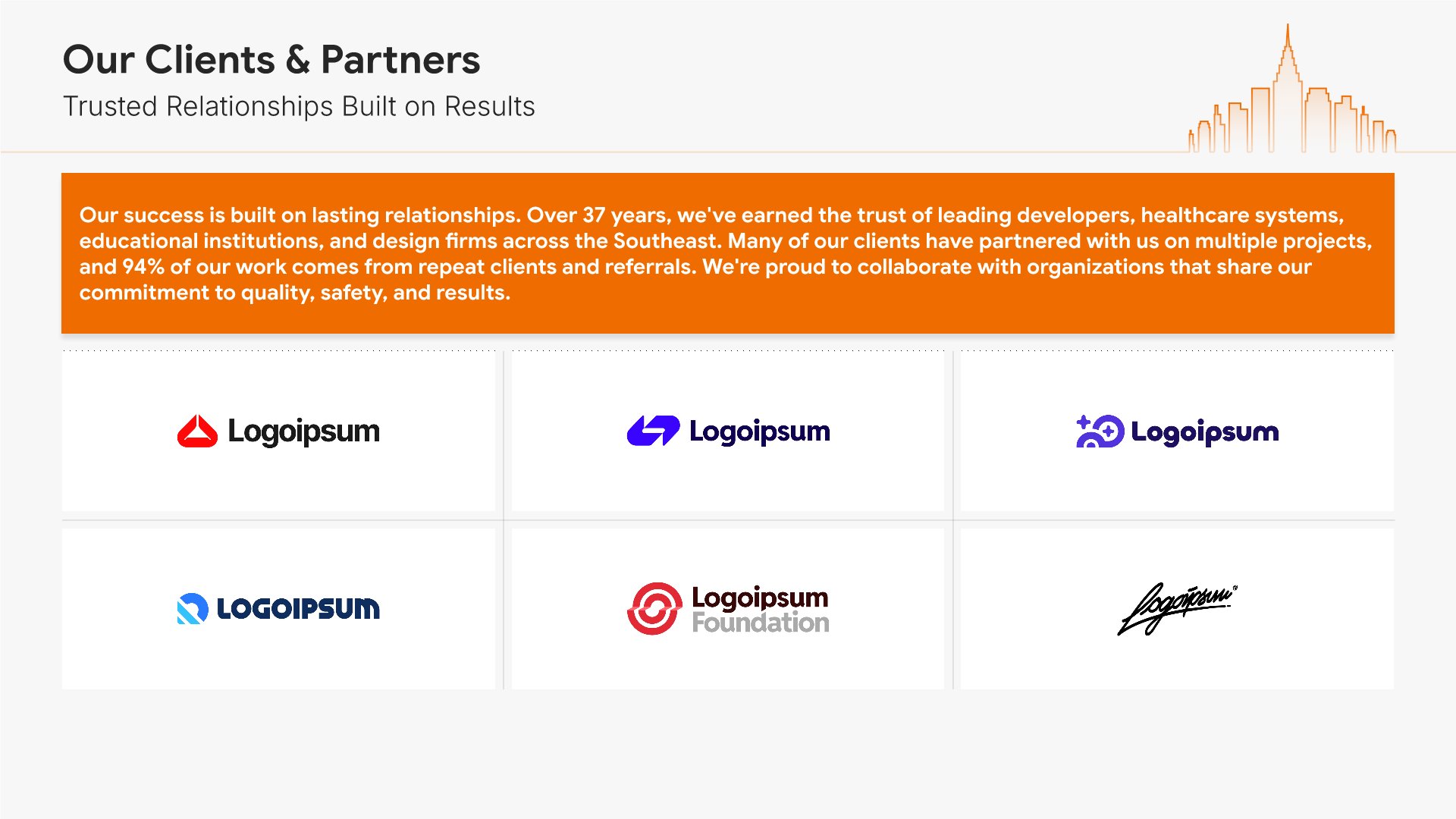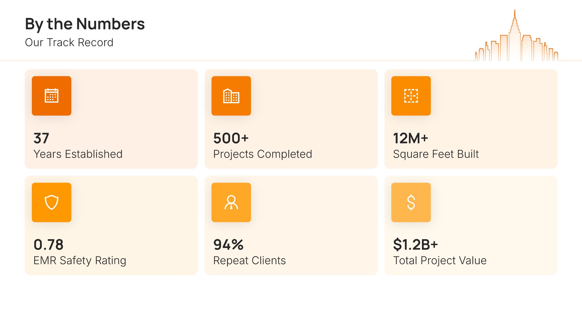 A professionally structured construction company profile template following the Universal Company Profile framework adapted for contractors and builders. Built for construction firms showcasing their capabilities to clients, developers, and partners. Covers company history, services, methodology, safety record, team credentials, and testimonials.