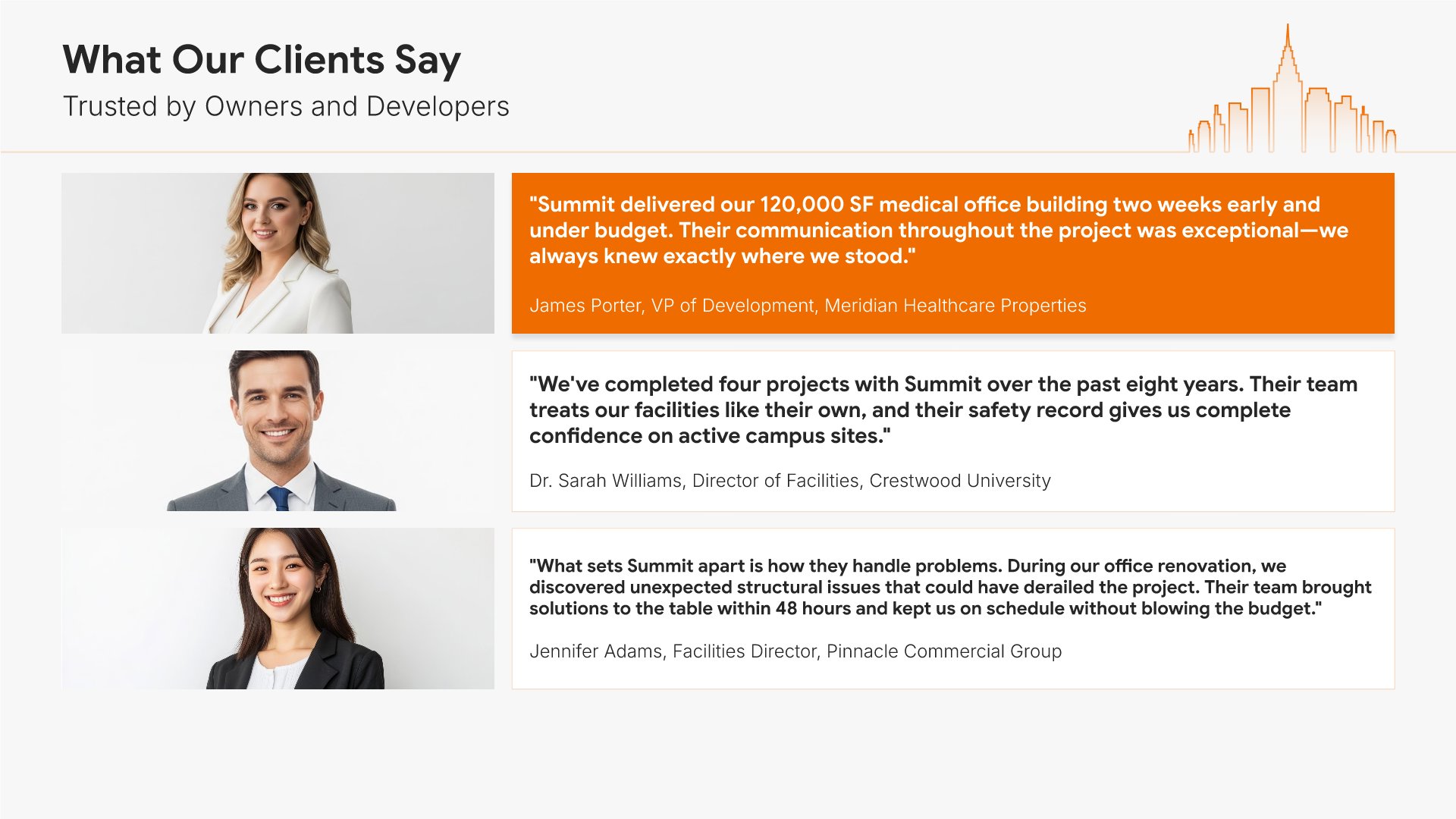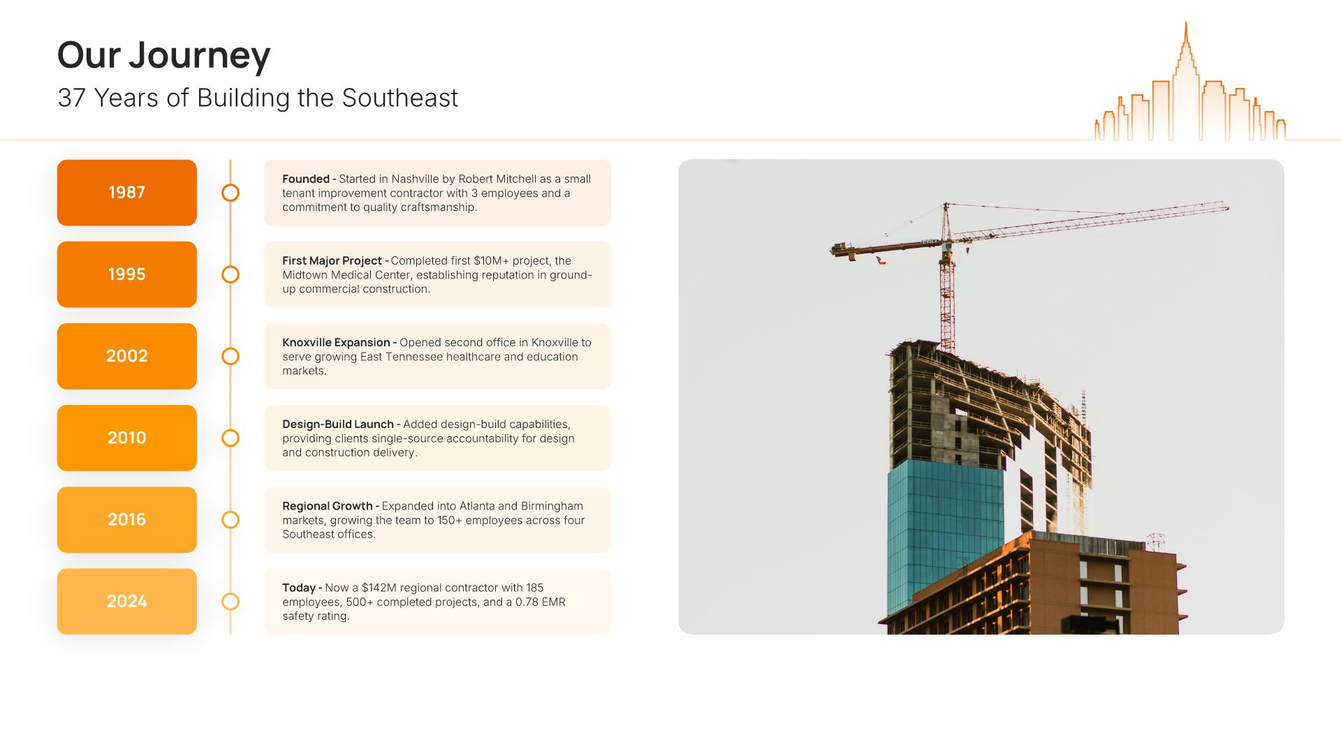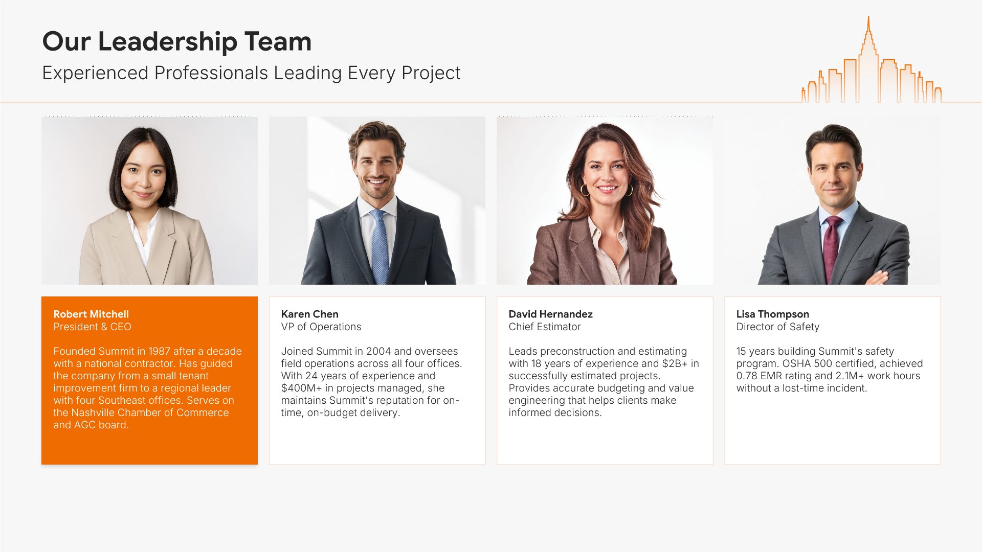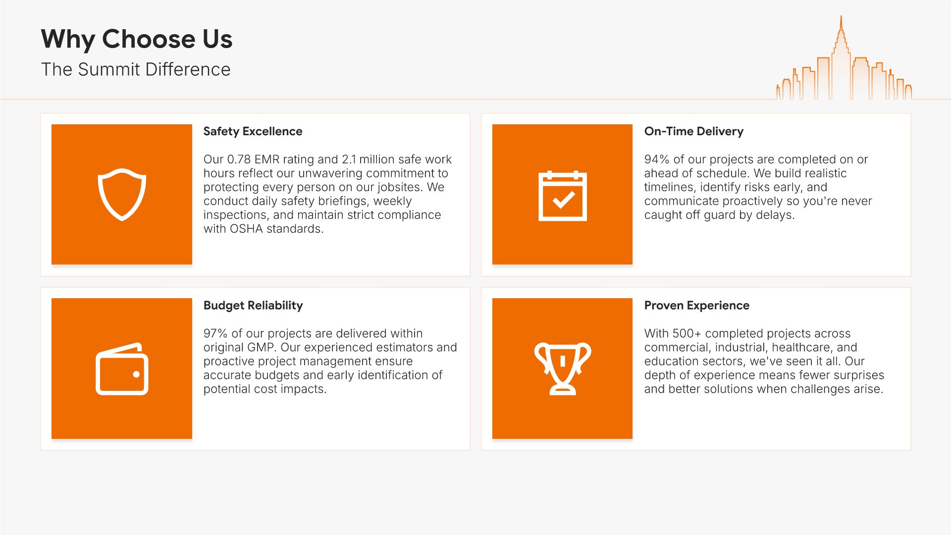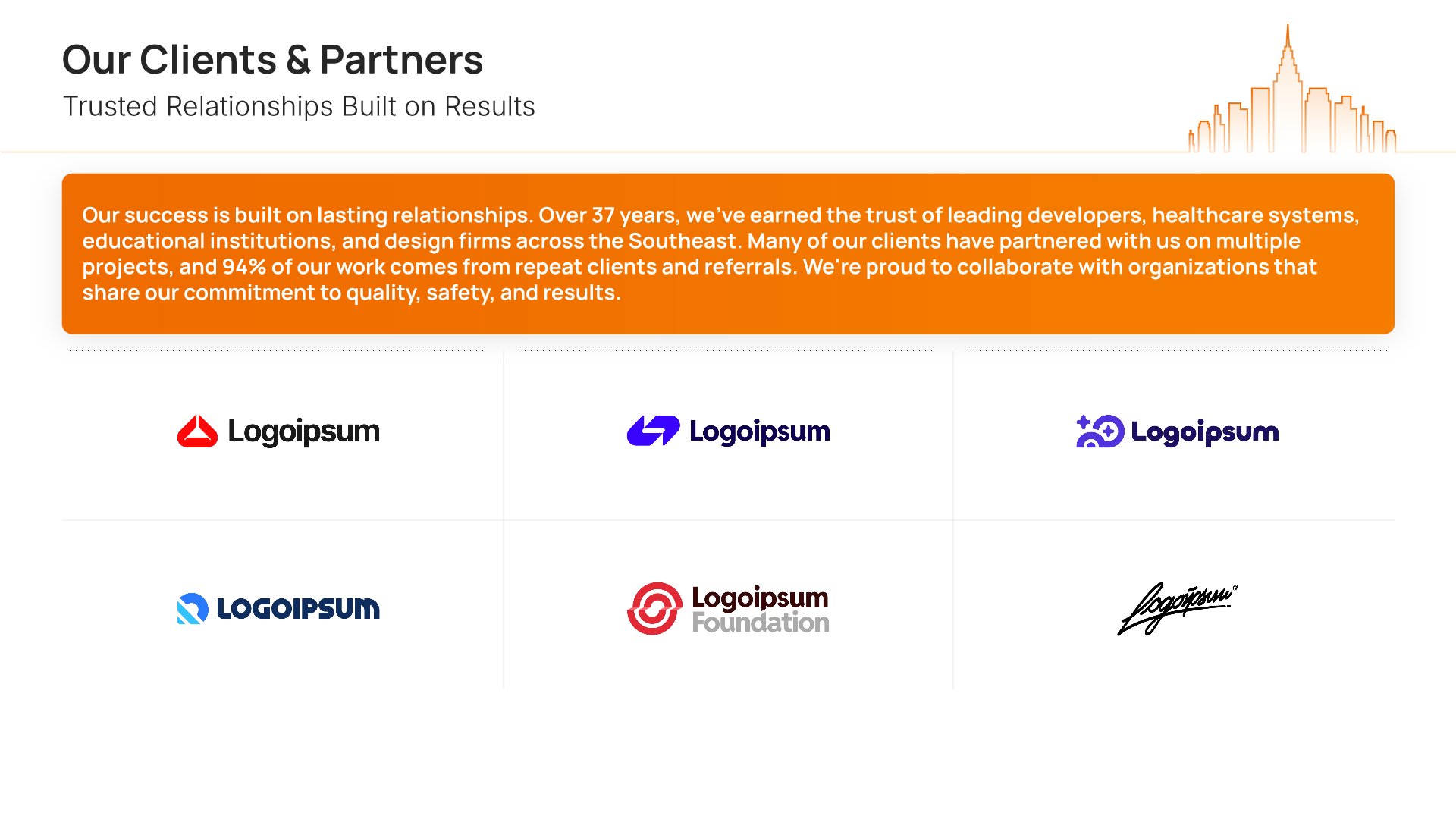 A professionally structured construction company profile template following the Universal Company Profile framework adapted for contractors and builders. Built for construction firms showcasing their capabilities to clients, developers, and partners. Covers company history, services, methodology, safety record, team credentials, and testimonials.