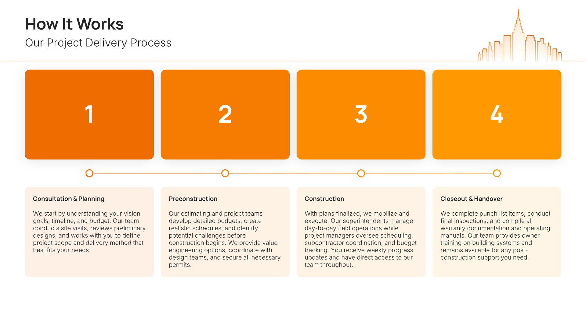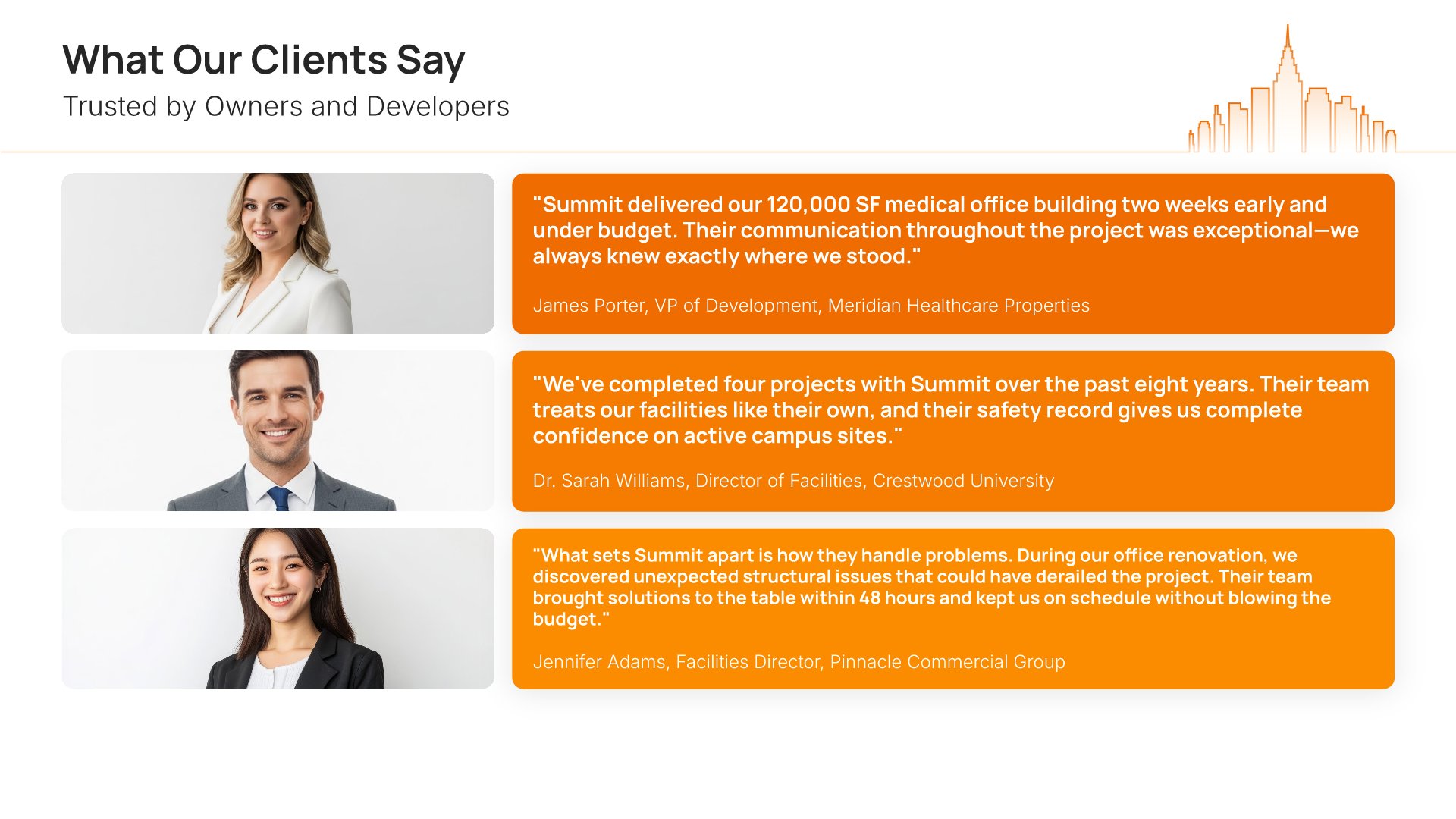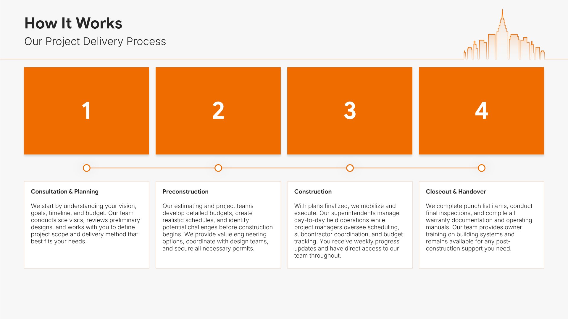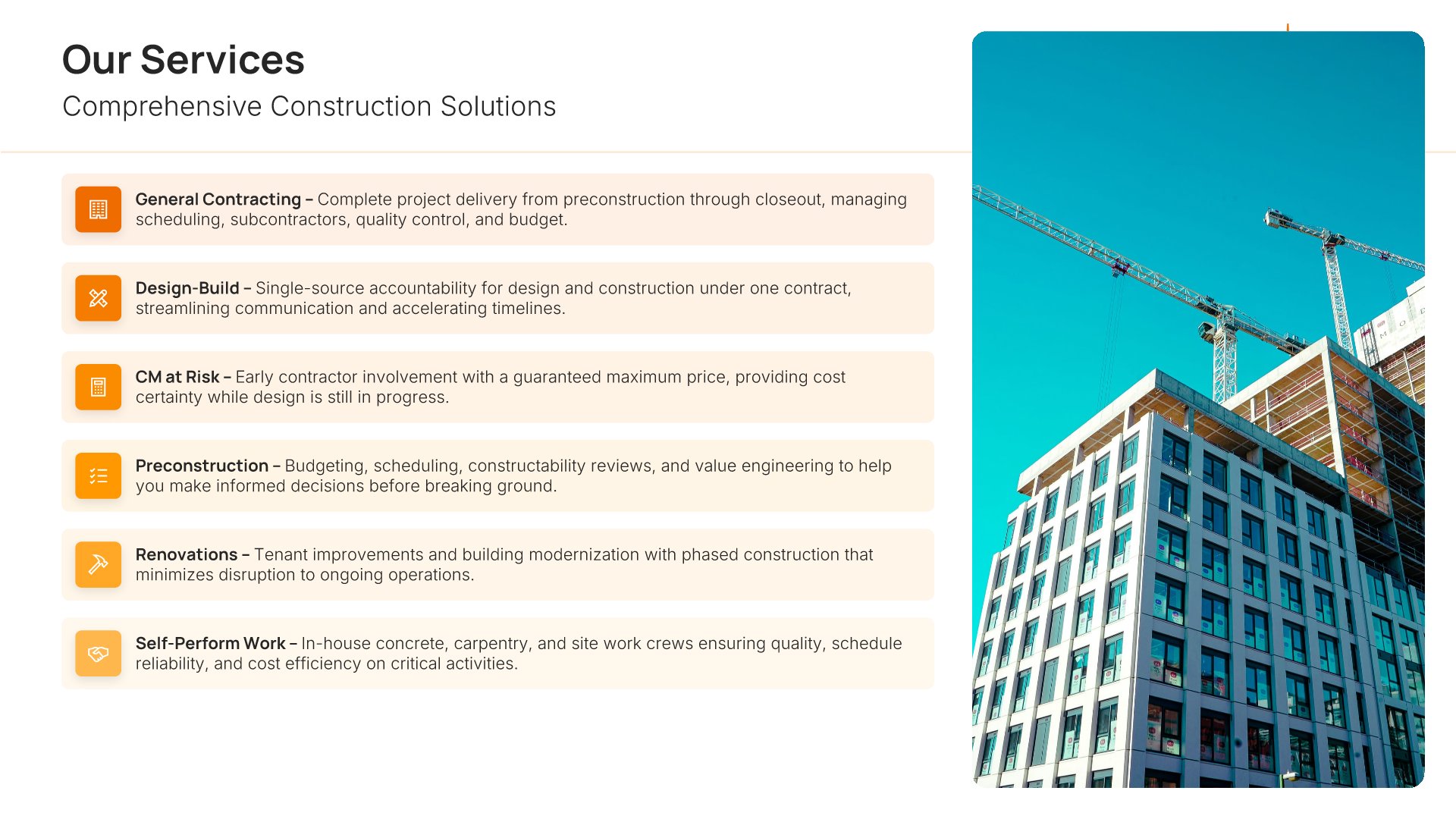 A professionally structured construction company profile template following the Universal Company Profile framework adapted for contractors and builders. Built for construction firms showcasing their capabilities to clients, developers, and partners. Covers company history, services, methodology, safety record, team credentials, and testimonials.