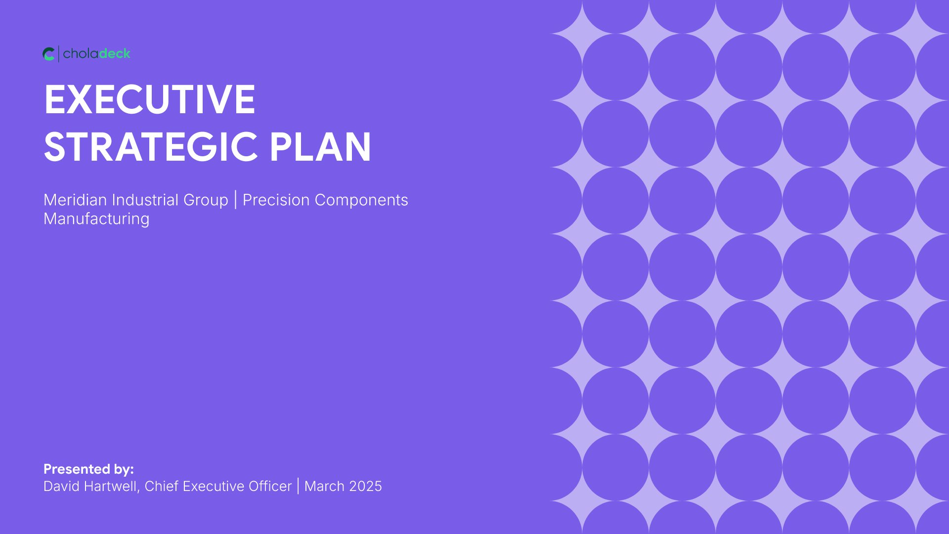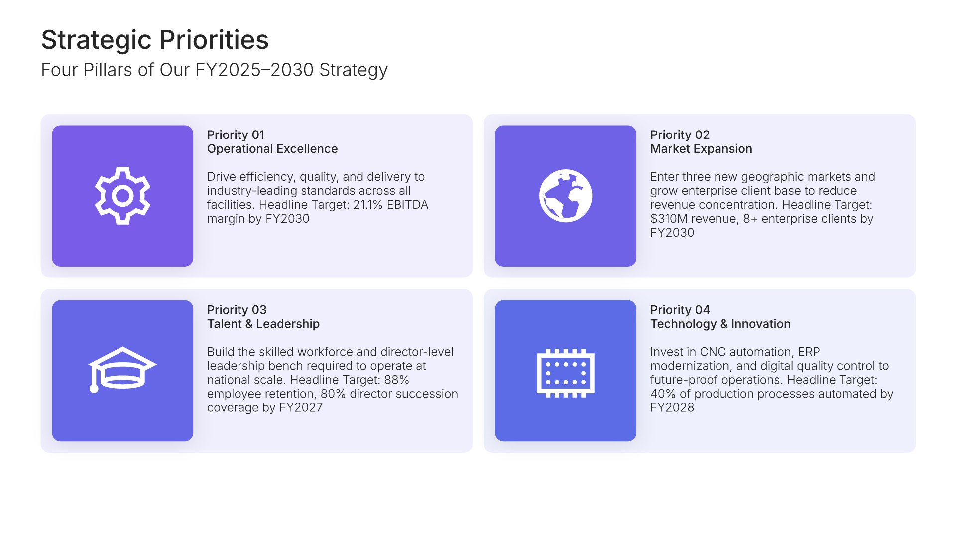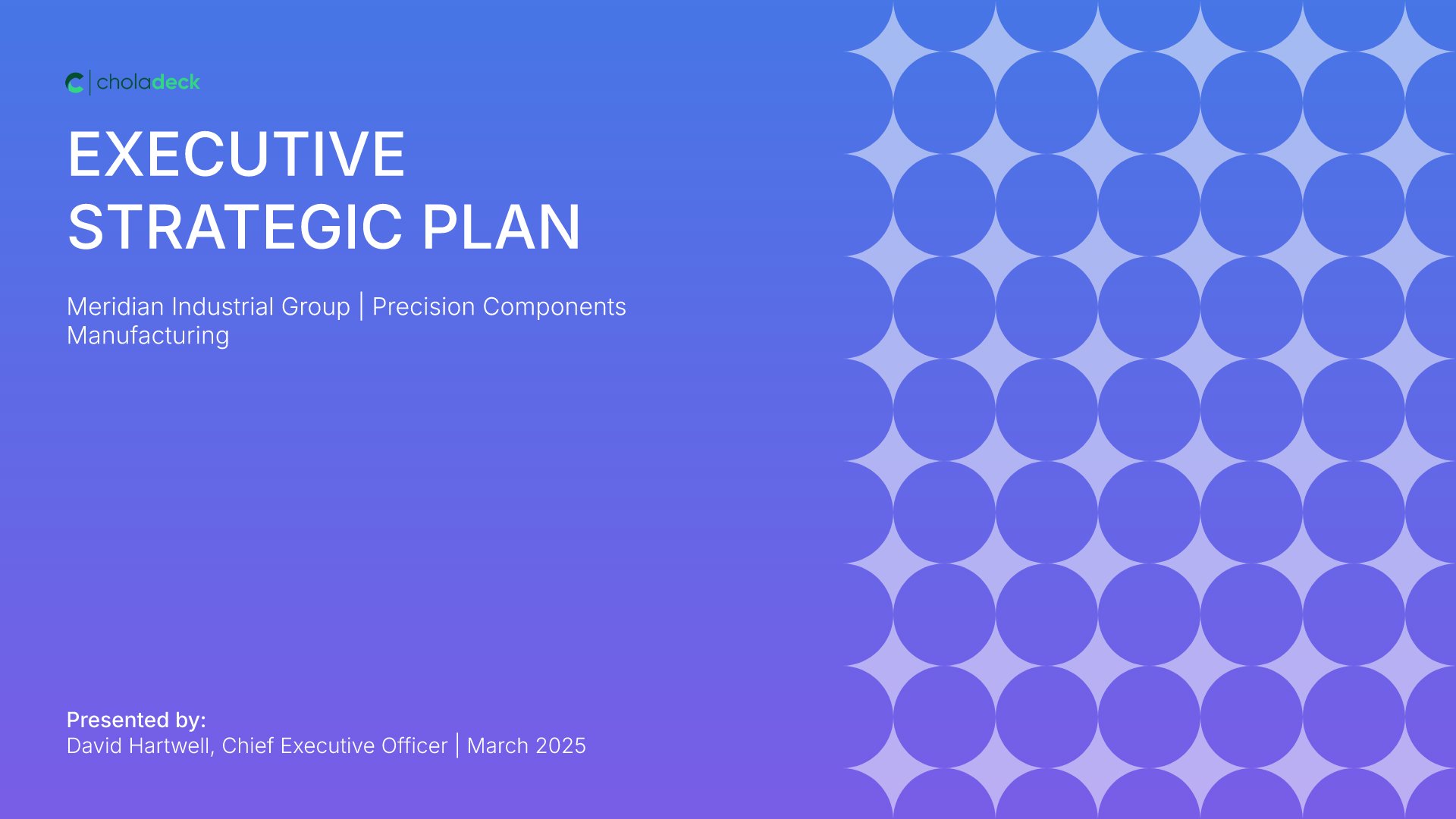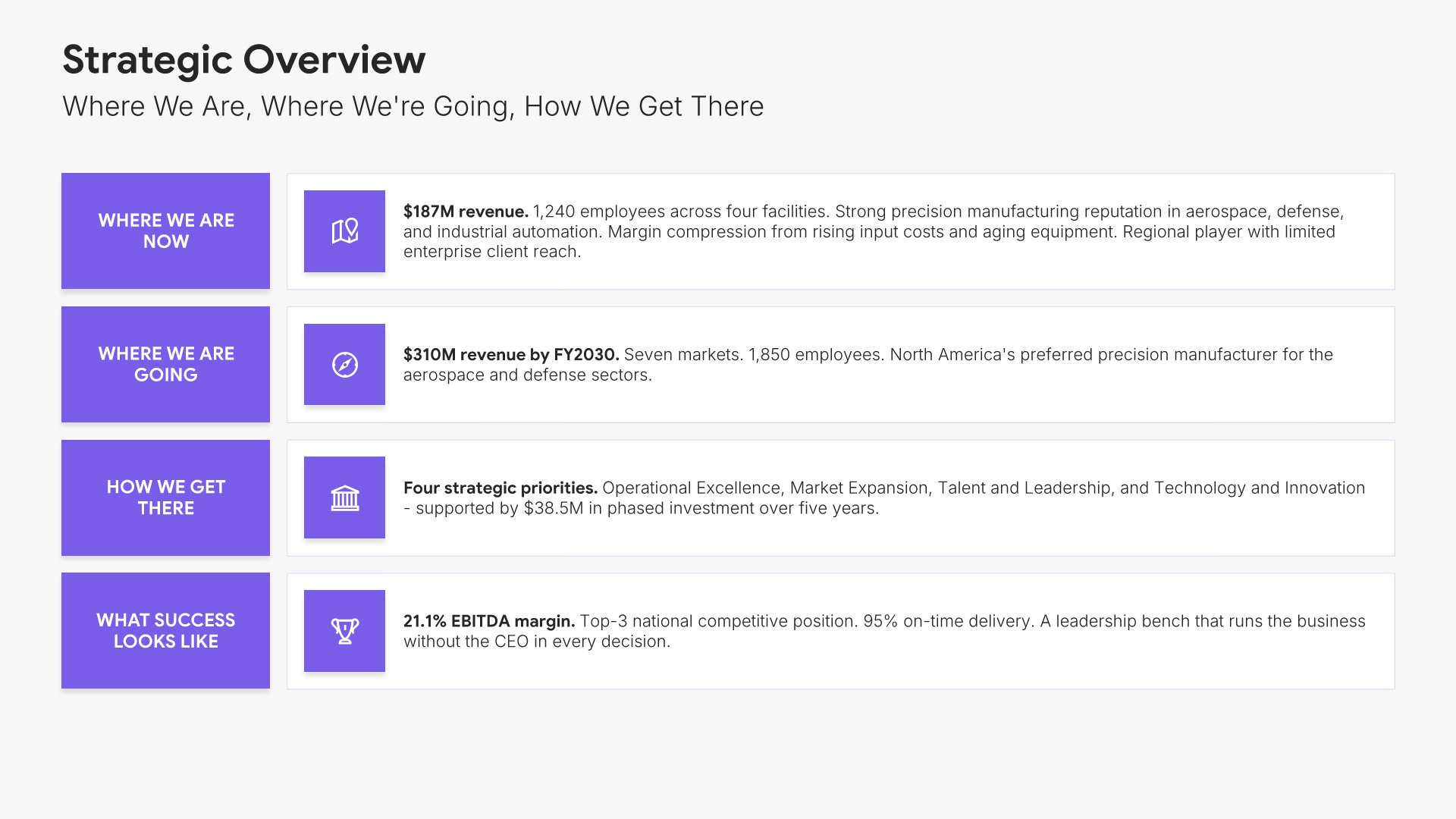 A streamlined executive strategic plan template designed for board and C-suite audiences who need the full strategy at a glance. Built on the Board-Ready Model, this presentation covers strategic overview, market position, vision, priorities, roadmap, investment, risks, financial outlook, and governance. Ideal for board-level strategy reviews.