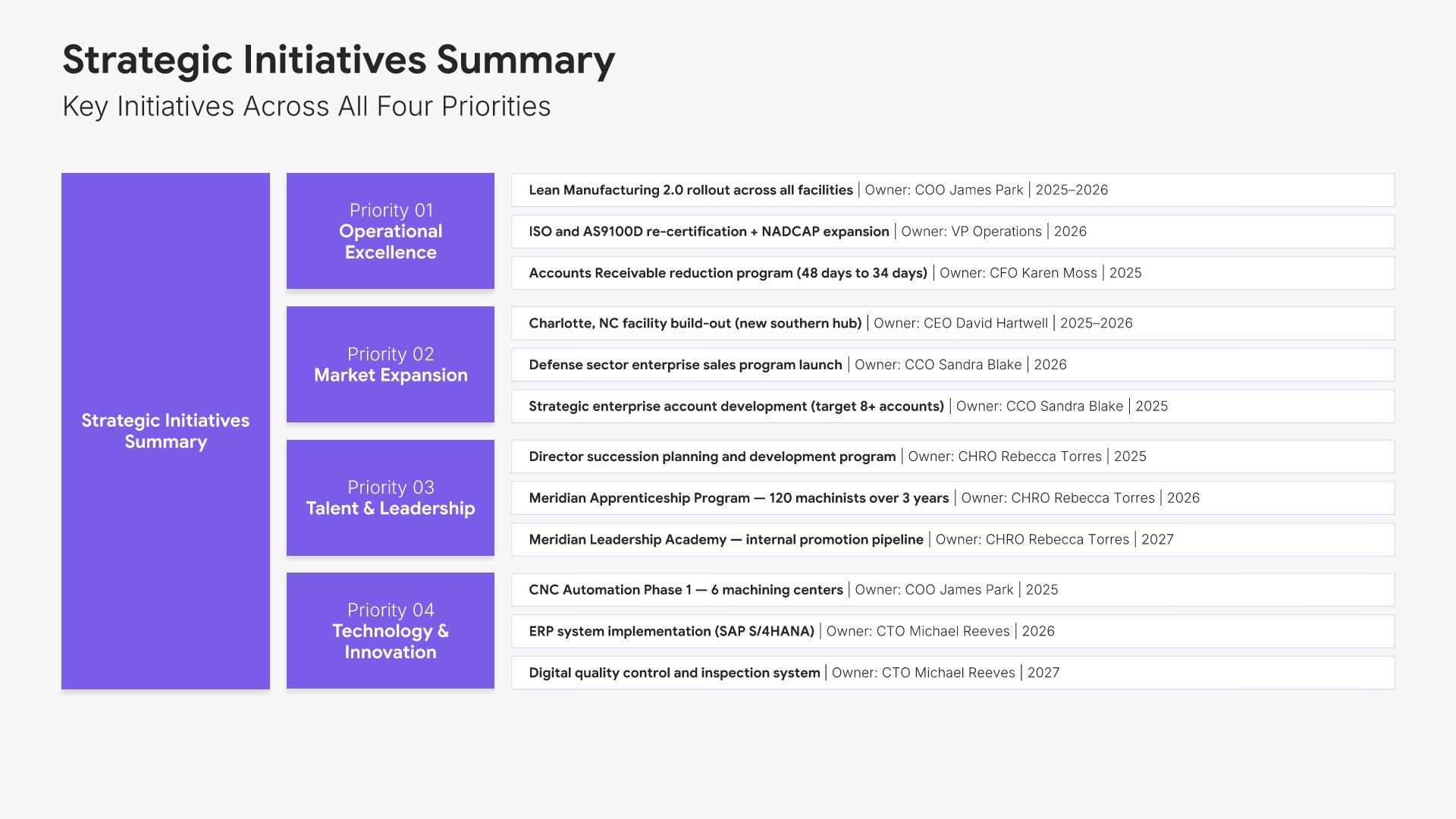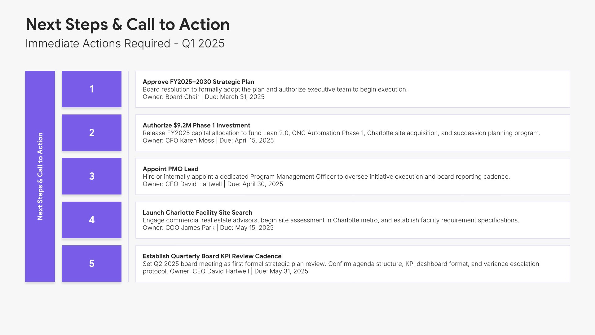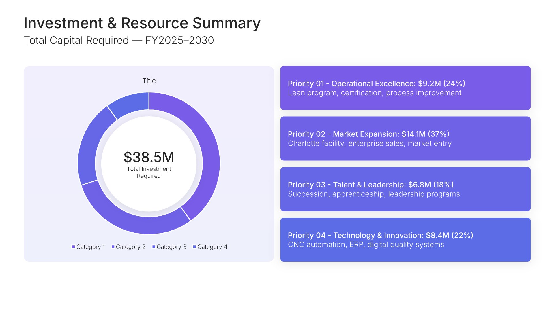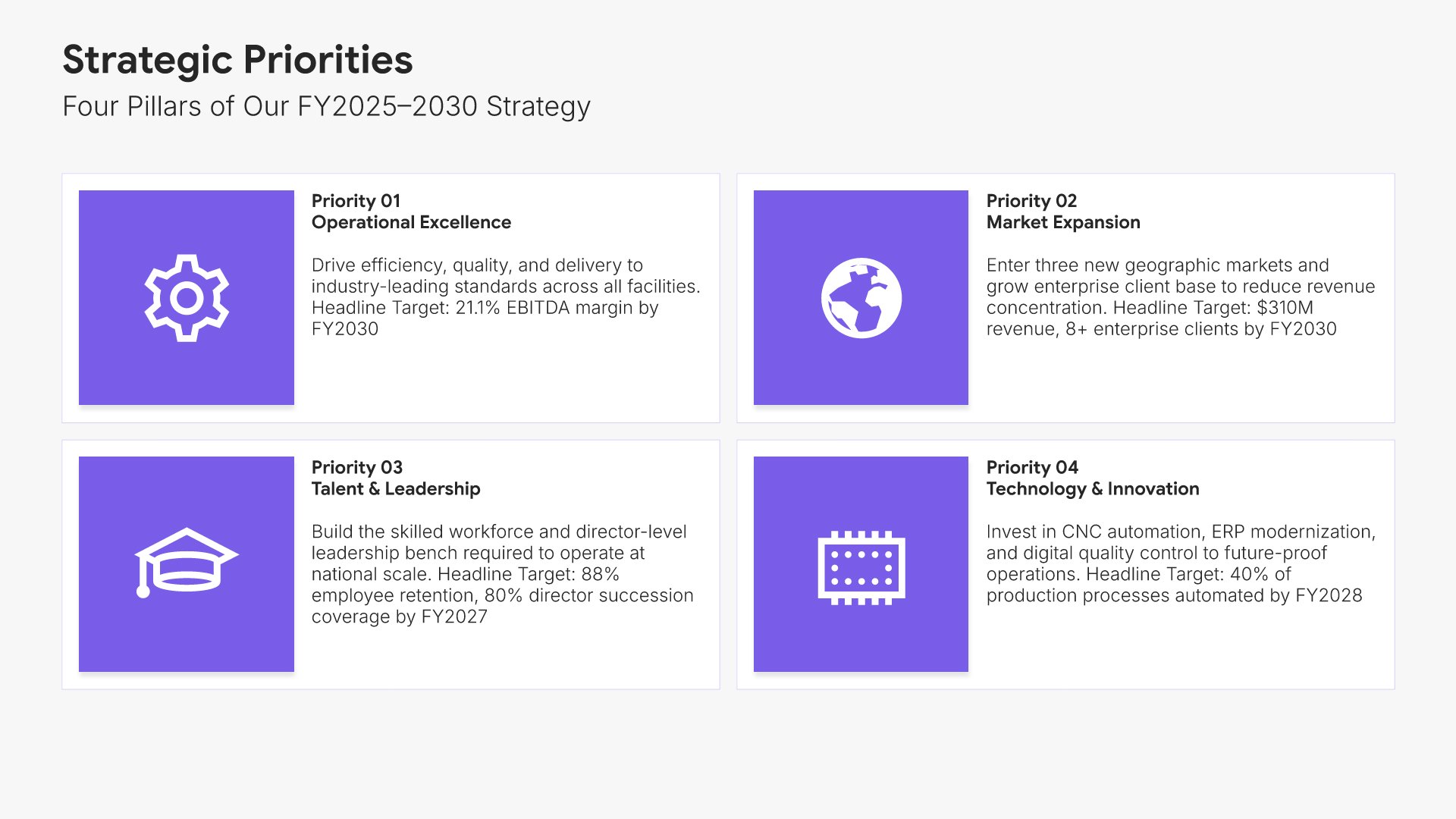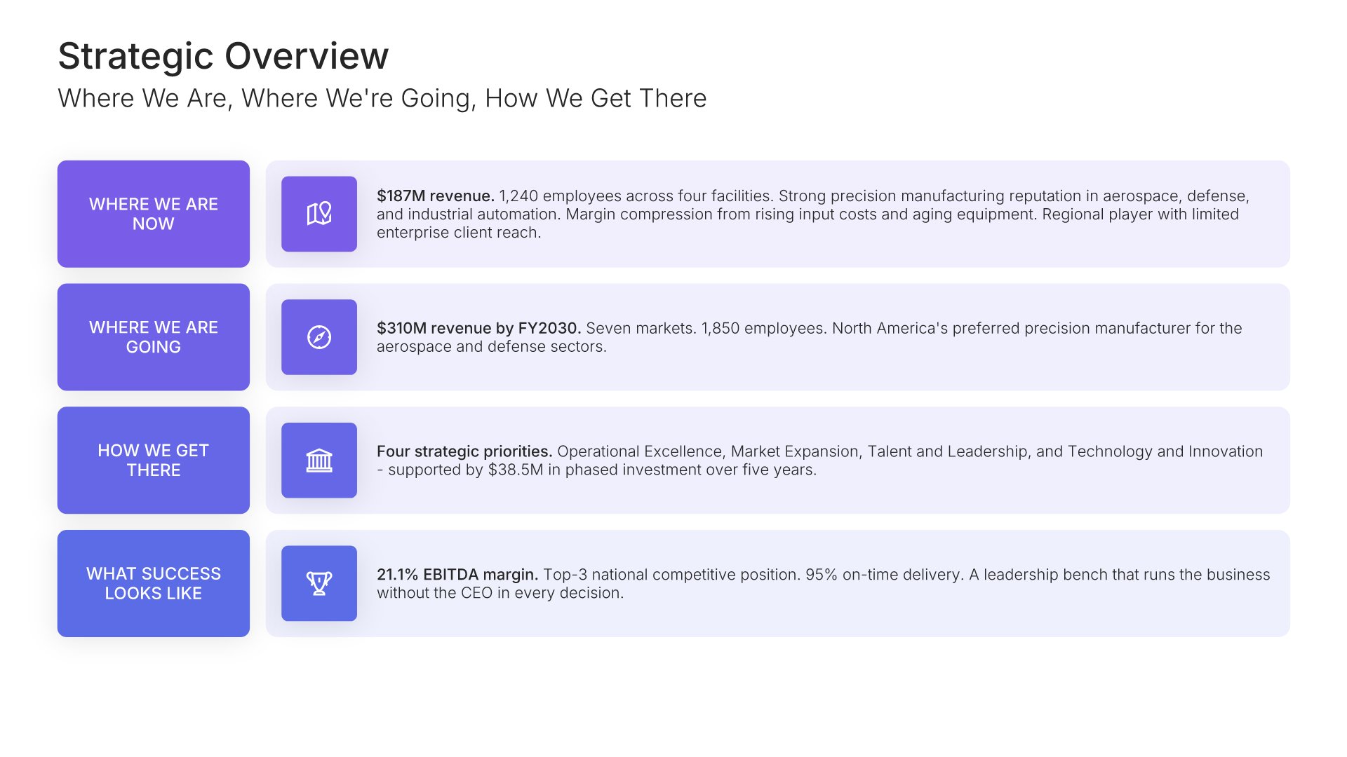A streamlined executive strategic plan template designed for board and C-suite audiences who need the full strategy at a glance. Built on the Board-Ready Model, this presentation covers strategic overview, market position, vision, priorities, roadmap, investment, risks, financial outlook, and governance. Ideal for board-level strategy reviews.