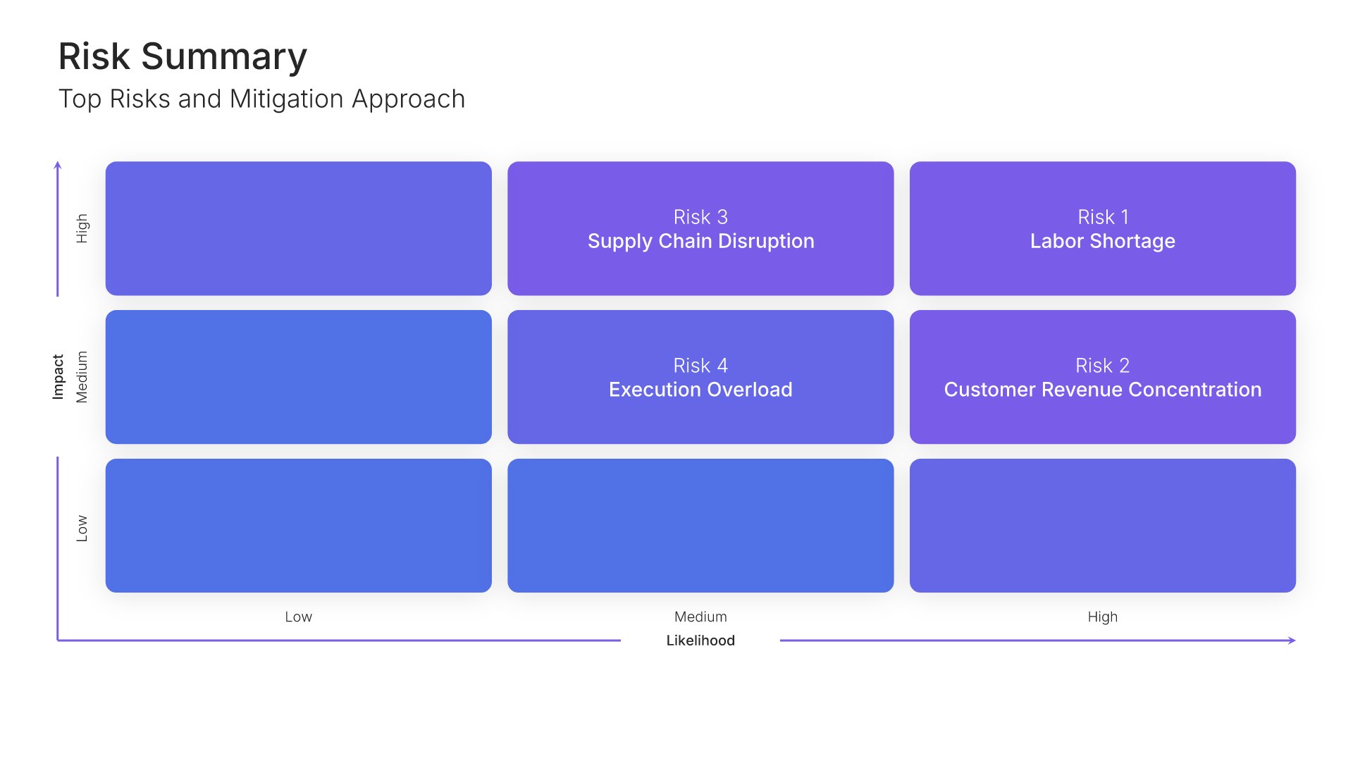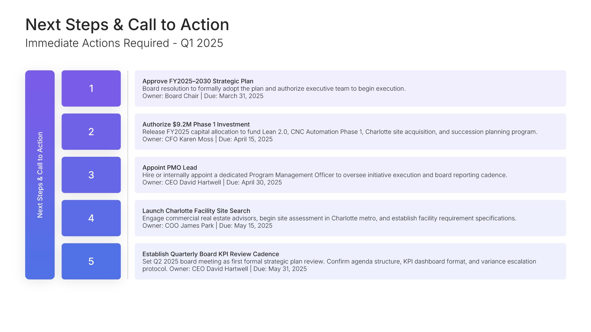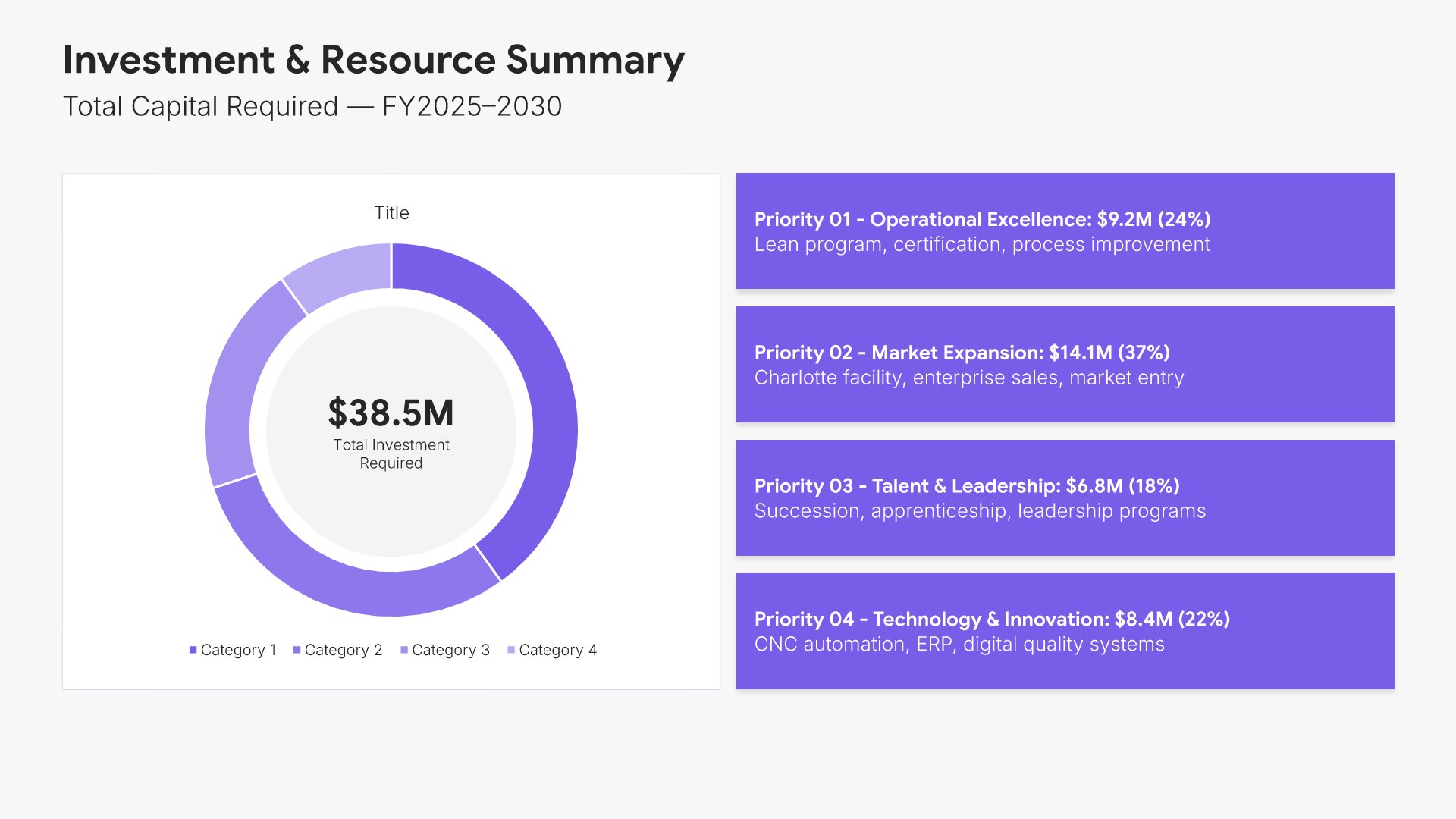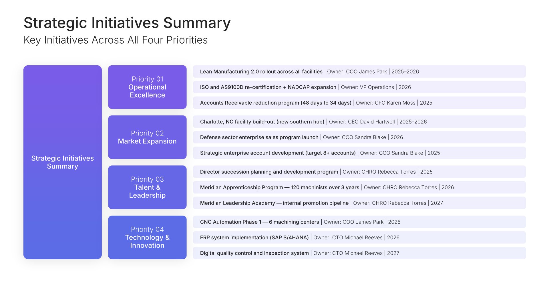 A streamlined executive strategic plan template designed for board and C-suite audiences who need the full strategy at a glance. Built on the Board-Ready Model, this presentation covers strategic overview, market position, vision, priorities, roadmap, investment, risks, financial outlook, and governance. Ideal for board-level strategy reviews.