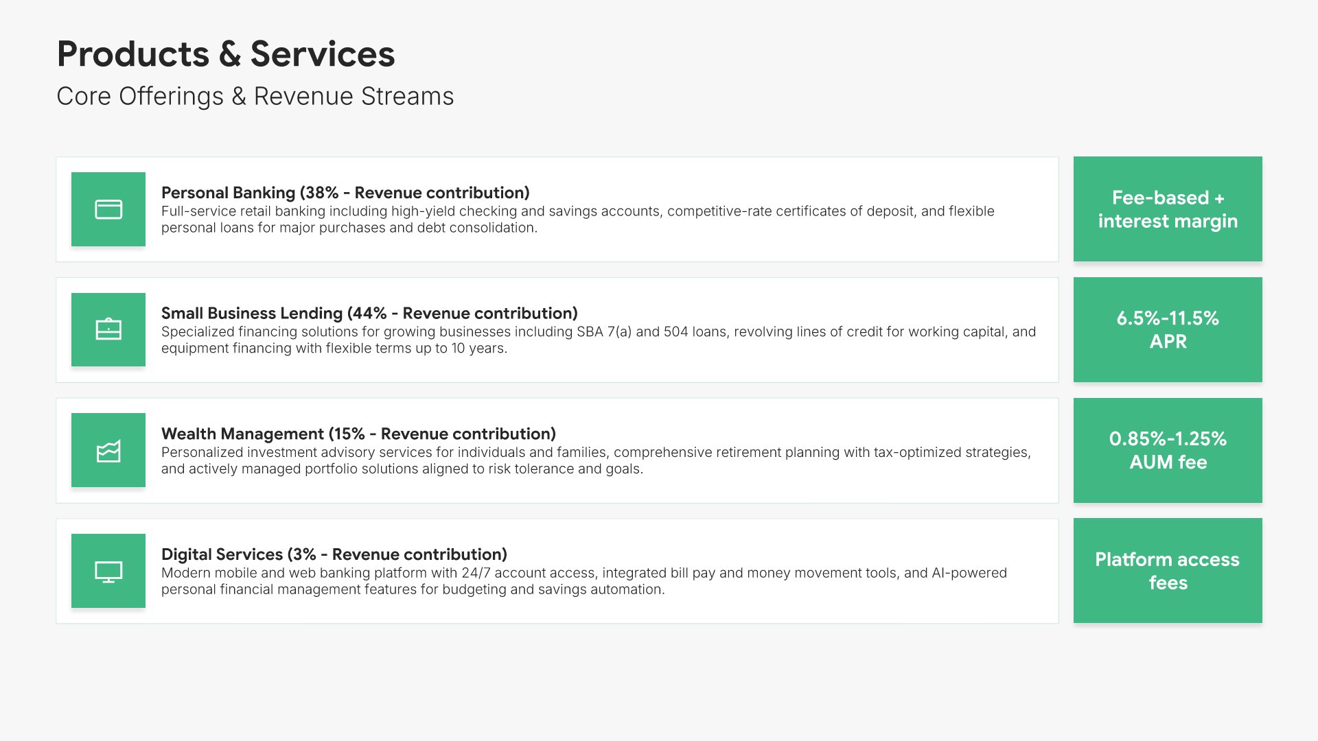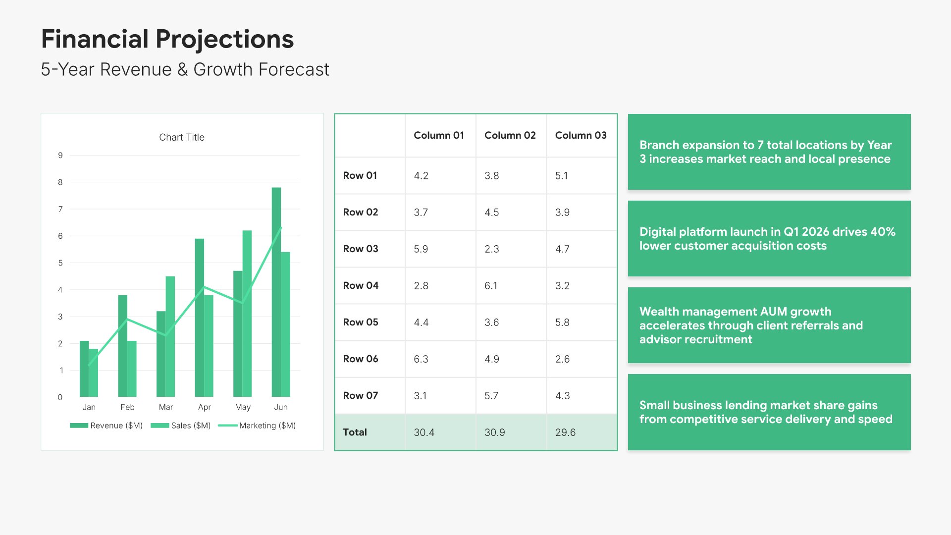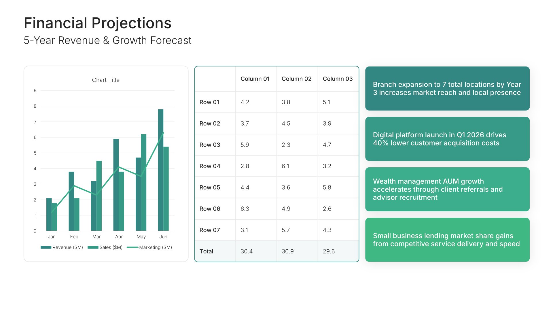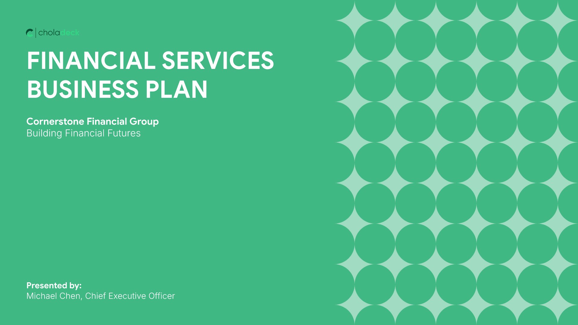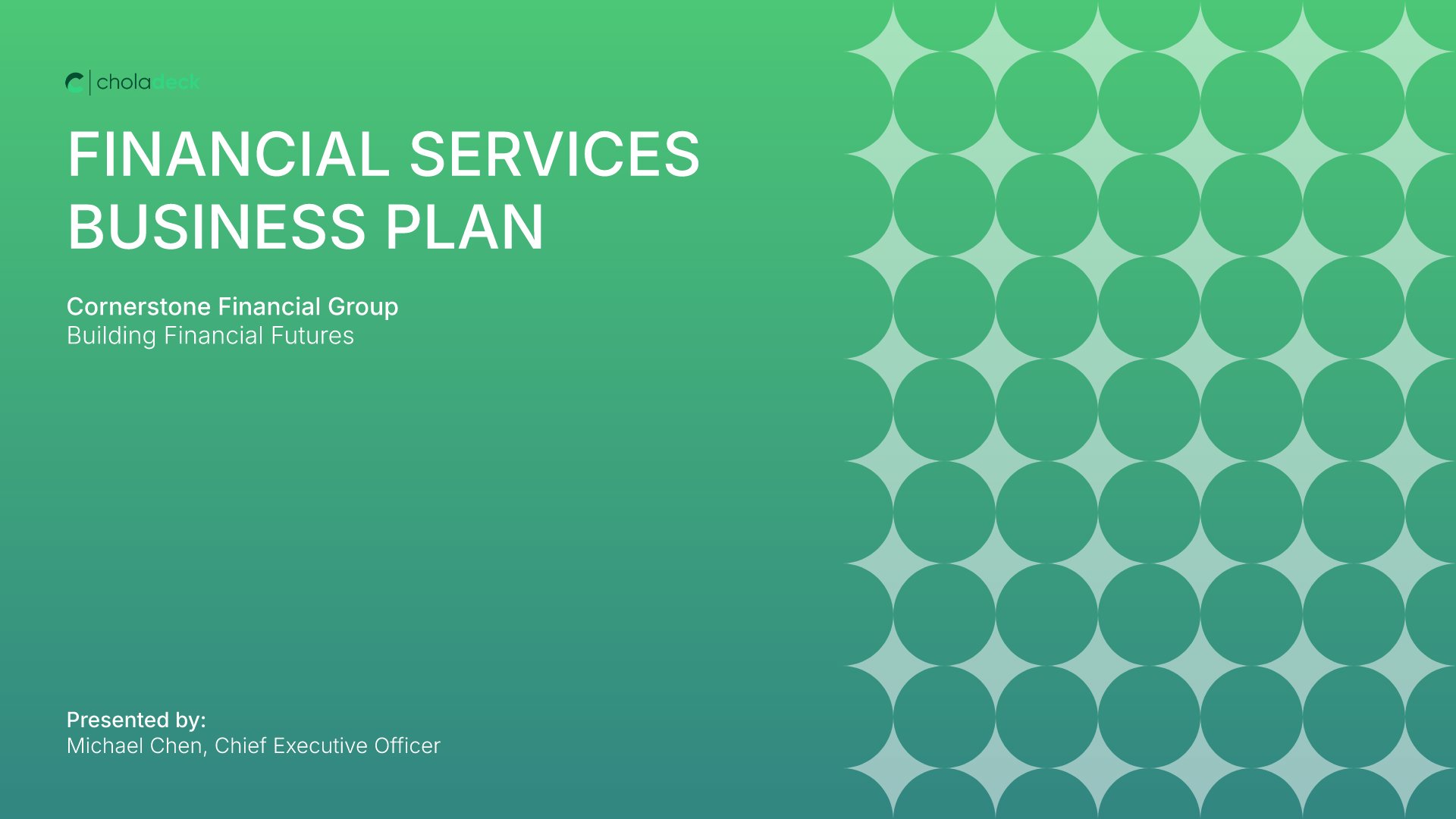 A comprehensive financial services business plan template designed for banks, wealth management firms, and financial advisory companies seeking financing or strategic growth. Built on the Classic SBA Model, this presentation covers products, market analysis, operations, compliance, and detailed financial statements. Ideal for any financial services firm at any stage.