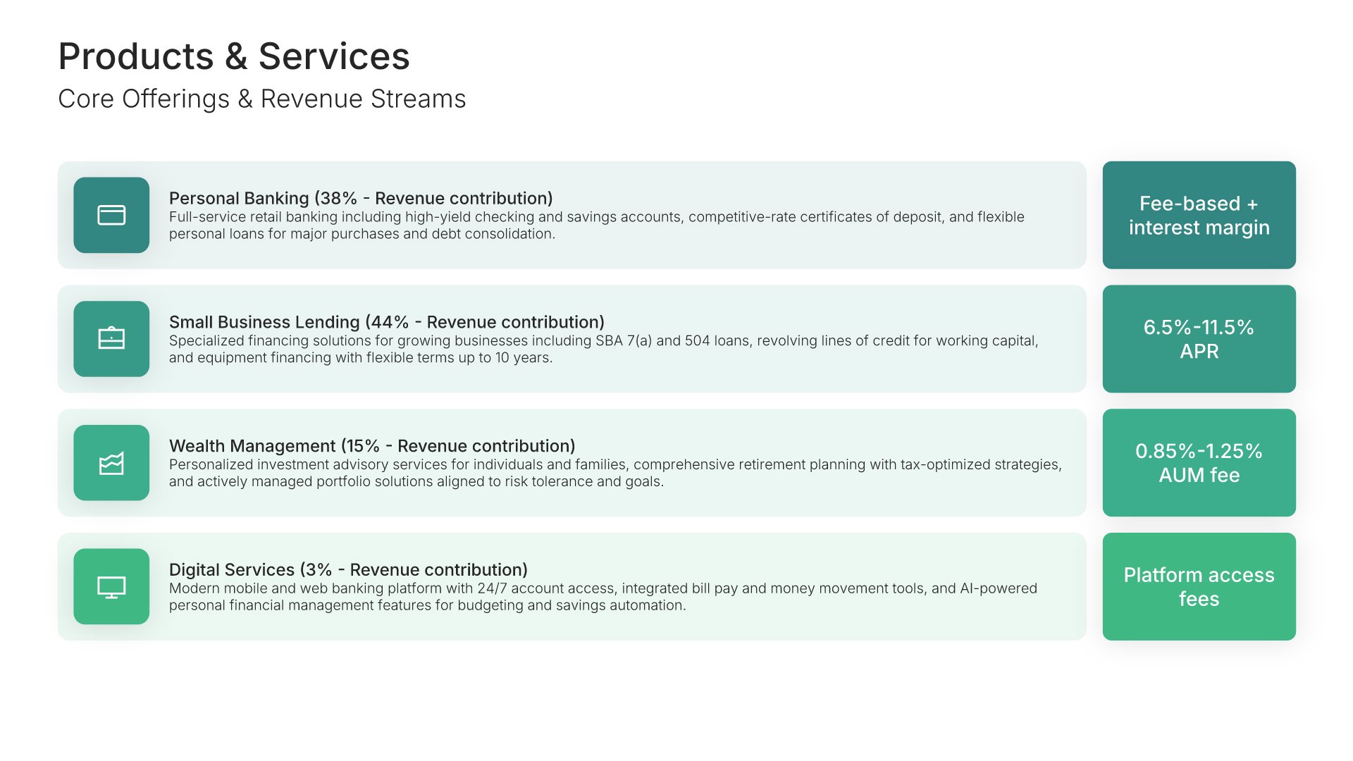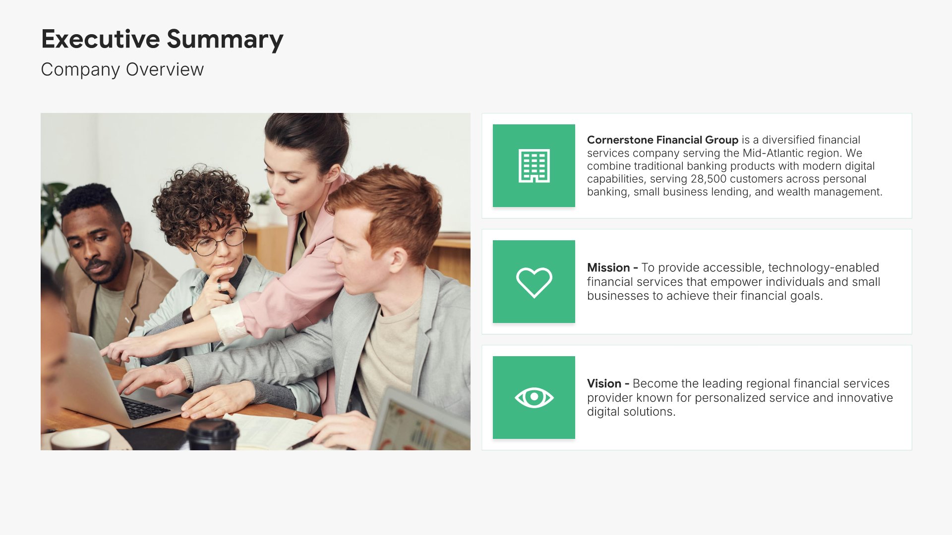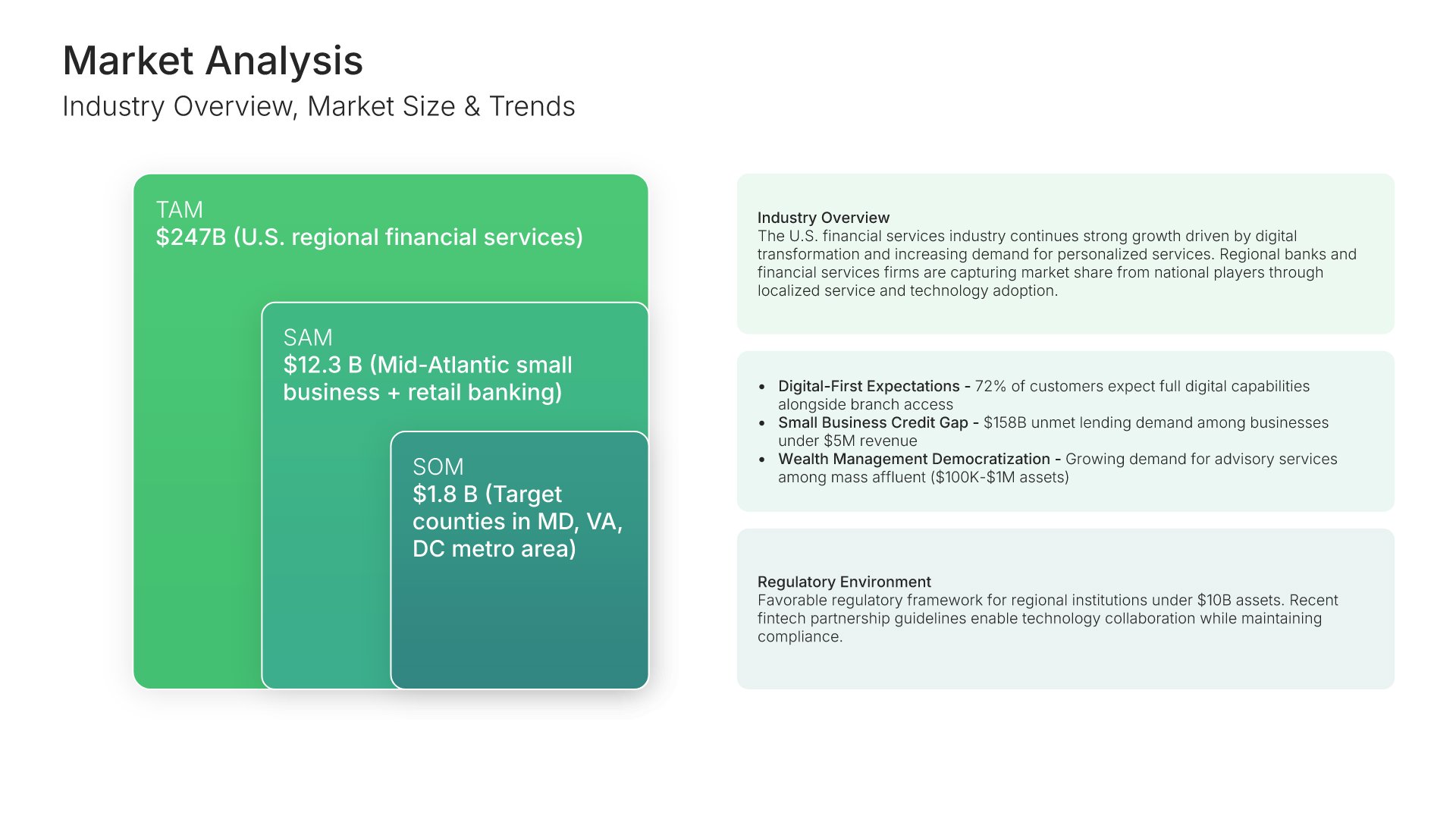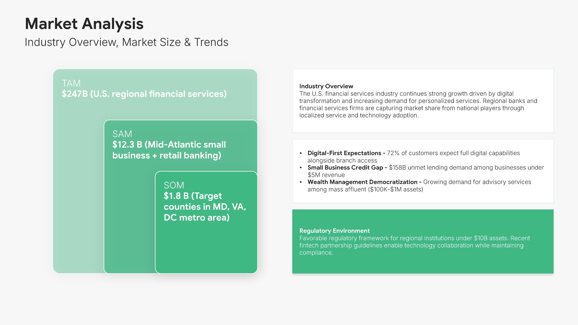 A comprehensive financial services business plan template designed for banks, wealth management firms, and financial advisory companies seeking financing or strategic growth. Built on the Classic SBA Model, this presentation covers products, market analysis, operations, compliance, and detailed financial statements. Ideal for any financial services firm at any stage.